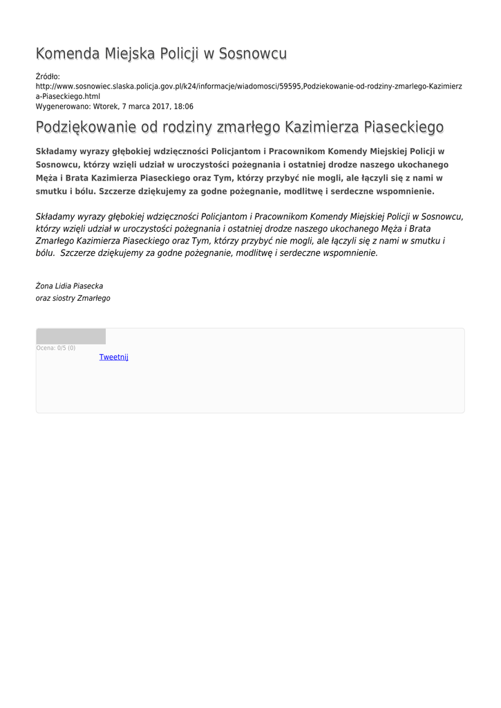 Komenda Miejska Policji w Sosnowcu Źródło: http://www.sosnowiec.slaska.policja.gov.pl/k24/informacje/wiadomosci/59595,Podziekowanie-od-rodziny-zmarlego-Kazimierz a-Piaseckiego.html Wygenerowano: Wtorek, 7 marca 2017, 18:06 Podziękowanie od rodziny zmarłego Kazimierza Piaseckiego Składamy wyrazy głębokiej wdzięczności Policjantom i Pracownikom Komendy Miejskiej Policji w Sosnowcu, którzy wzięli udział w uroczystości pożegnania i ostatniej drodze naszego ukochanego Męża i Brata Kazimierza Piaseckiego oraz Tym, którzy przybyć nie mogli, ale łączyli się z nami w smutku i bólu. Szczerze dziękujemy za godne pożegnanie, modlitwę i serdeczne wspomnienie. Składamy wyrazy głębokiej wdzięczności Policjantom i Pracownikom Komendy Miejskiej Policji w Sosnowcu, którzy wzięli udział w uroczystości pożegnania i ostatniej drodze naszego ukochanego Męża i Brata Zmarłego Kazimierza Piaseckiego oraz Tym, którzy przybyć nie mogli, ale łączyli się z nami w smutku i bólu. Szczerze dziękujemy za godne pożegnanie, modlitwę i serdeczne wspomnienie. Żona Lidia Piasecka oraz siostry Zmarłego Ocena: 0/5 (0) Tweetnij