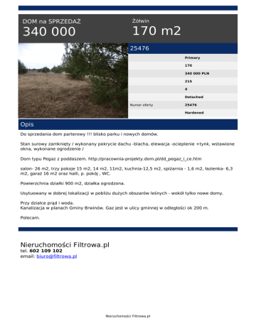Żółwin DOM na SPRZEDAŻ 170 m2 340 000 25476 Primary 170 340 000 PLN 215 4 Detached Numer oferty 25476 Hardened Opis Do sprzedania dom parterowy !!! blisko parku i nowych domów. Stan surowy zamknięty / wykonany pokrycie dachu -blacha, elewacja -ocieplenie +tynk, wstawione okna, wykonane ogrodzenie / Dom typu Pegaz z poddaszem. http://pracownia-projekty.dom.pl/dd_pegaz_i_ce.htm salon- 26 m2, trzy pokoje 15 m2, 14 m2, 11m2, kuchnia-12,5 m2, spiżarnia - 1,6 m2, łazienka- 6,3 m2, garaż 16 m2 oraz halli, p. pokój , WC. Powierzchnia działki 900 m2, działka ogrodzona. Usytuowany w dobrej lokalizacji w pobliżu dużych obszarów leśnych - wokół tylko nowe domy. Przy działce prąd i woda. Kanalizacja w planach Gminy Brwinów. Gaz jest w ulicy gminnej w odległości ok 200 m. Polecam. Nieruchomości Filtrowa.pl tel. 602 109 102 email: [email protected] Nieruchomości Filtrowa.pl Powered by TCPDF (www.tcpdf.org)