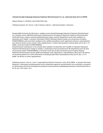 Uchwała Zarządu Krajowego Depozytu Papierów Wartościowych S.A. ws. rejestracji akcji serii E w KDPW Raport bieżący nr 14/2016 z dnia 04.05.2016 roku Podstawa prawna: Art. 56 ust. 1 pkt 2 Ustawy o ofercie - informacje bieżące i okresowe Zarząd spółki Archicom SA informuje o podjęciu przez Zarząd Krajowego Depozytu Papierów Wartościowych S.A. Uchwały numer 280/2016 dotyczącej zarejestrowania w Krajowym Depozycie Papierów Wartościowych 4.655.626 (cztery miliony sześćset pięćdziesiąt pięć tysięcy sześćset dwadzieścia sześć) akcji zwykłych na okaziciela serii E Spółki o wartości nominalnej 10,00 zł (dziesięć złotych) każda oraz oznaczenia ich kodem PLARHCM00016, pod warunkiem podjęcia przez spółkę prowadzącą rynek regulowany decyzji o wprowadzeniu tych akcji do obrotu na tym samym rynku regulowanym, na który wprowadzone zostaną akcje serii A, B2, C i D Spółki, oznaczone kodem PLARHCM00016. Zarejestrowanie wskazanych w tej uchwale akcji zwykłych na okaziciela serii E Spółki w Krajowym Depozycie Papierów Wartościowych nastąpi w związku z zamknięciem kont prowadzonych dla zbywalnych praw do akcji oznaczonych kodem PLARHCM00032, w terminie trzech dni od dnia otrzymania przez Krajowy Depozyt Papierów Wartościowych decyzji spółki prowadzącej rynek regulowany o wprowadzeniu akcji serii E do obrotu, nie wcześniej jednak niż w dniu wskazanym w tej decyzji jako dzień wprowadzenia akcji serii A, B2, C, D i E Spółki do obrotu na rynku regulowanym. Podstawa prawna: § 34 ust. 1 pkt 1 rozporządzenia Ministra Finansów z dnia 19.02.2009r. w sprawie informacji bieżących i okresowych przekazywanych przez emitentów papierów wartościowych oraz warunków uznawania za równoważne informacji wymaganych przepisami prawa państwa niebędącego państwem członkowskim (Dz.U. Nr 33, poz. 259 z późn. zm.)
