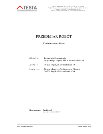 PRACOWNIA PROJEKTOWO-KOSZTORYSOWA 76-200 Słupsk, ul. Konarskiego 8 lok. 3, tel./faks: (59) 843-55-46 Regon: 770700971, NIP: 839-002-31-30 e-mail: [email protected] www.testa-kosztorysy.pl PRZEDMIAR ROBÓT Wymiana stolarki okiennej Obiekt: Restauracja i konserwacja zabytkowego zespołu XIV w. Bramy Młyńskiej Adres: 76-200 Słupsk, ul. Dominikańska 5-9 Inwestor: Muzeum Pomorza Środkowego w Słupsku 76-200 Słupsk, ul Dominikańska 5-9 Kosztorysant: Jan Zopoth Upr. bud. nr: AN/8346/108/78 www.testa-kosztorysy.pl Słupsk, marzec 2010 Kosztorysowanie FORTE 9.70 Prawa autorskie INWESTPROJEKT-SŁUPSK T E S T A Pracownia Proj.-Kosztorysowa tel./fax: 0-59 843-55-46 www.testa-kosztorysy.pl 45453000-7 Roboty remontowe i renowacyjne Brama MłyĔska - Muzeum Pomorza ĝrodkowego w Słupsku Identyfikator kosztorysu: Brama - wym. okien W1 Przedmiar robót wyk.dn: 2010-07-21 str. 1 Nr Nazwa Jednostka IloĞü miary 1 WYMIANA STOLARKI OKIENNEJ 1.1 Wymiana okien 1 KNR 4-01 354-3 Specyfikacja ST-01 Wykucie z muru oĞcieĪnic drewnianych okiennych o powierzchni do 1 m2 szt 26,00 2 KNR 4-01 354-4 specyfikacja ST-01 Wykucie z muru oĞcieĪnic drewnianych okiennych o powierzchni do 2 m2 szt 15,00 3 KNR 4-01 318-5 szt Specyfikacja ST-01 Obsadzenie oĞcieĪnic drewnianych w Ğcianach zewnĊtrznych z cegieł, powierzchnia otworu do 2.0 m2 (bez kosztu okna) 15,00 4 2-1 szt Specyfikacja ST-01 Dopłata za okna jednoramowe dwuskrzydłowe o wym. 119x135 cm cm - typ 01.1 uwaga okna wykonane z drewna twardego (dąb) klejonego warstwowo, z widoczną strukturą drewna, rozwierno-uchylne, z mikrowentylacją, szklone szybą zespoloną termofloat K<1,1W/m2, wykoĔczenie - malowanie bejcą koloryzującą oraz lakierem odpornym na działanie wody i ultrafioletu. Okucia obwiednowe, klamki metalowe 4-pozycyjne, okapnik aluminiowy z wkładką termiczną, okucia i klamki spatynowane. PrzeĞwity okien nie mogą byü mniejsze od istniejących, szerokoĞü ramiaków skrzydeł okiennych powinna byü mniejsza od standardowych. Podział okien słupkami oraz detale odtworzyü jak w istniejących. Okna wykonaü na podstawie szczegółowych obmiarów istn. otworów. 2,00 5 2-1 szt Specyfikacja ST-01 Dopłata za okna jednoramowe dwuskrzydłowe o wym. 110x137 cm cm - typ 01.2 uwaga okna wykonane z drewna twardego (dąb) klejonego warstwowo, z widoczną strukturą drewna, rozwierno-uchylne, z mikrowentylacją, szklone szybą zespoloną termofloat K<1,1W/m2, wykoĔczenie - malowanie bejcą koloryzującą oraz lakierem odpornym na działanie wody i ultrafioletu. Okucia obwiednowe, klamki metalowe 4-pozycyjne, okapnik aluminiowy z wkładką termiczną, okucia i klamki spatynowane. PrzeĞwity okien nie mogą byü mniejsze od istniejących, szerokoĞü ramiaków skrzydeł okiennych powinna byü mniejsza od standardowych. Podział okien słupkami oraz detale odtworzyü jak w istniejących. Okna wykonaü na podstawie szczegółowych obmiarów istn. otworów. 6,00 6 2-1 szt Specyfikacja ST-01 Dopłata za okna jednoramowe dwuskrzydłowe o wym. 110x132 cm cm - typ 01.3 uwaga okna wykonane z drewna twardego (dąb) klejonego warstwowo, z widoczną strukturą drewna, rozwierno-uchylne, z mikrowentylacją, szklone szybą zespoloną termofloat K<1,1W/m2, wykoĔczenie - malowanie bejcą koloryzującą oraz lakierem odpornym na działanie wody i ultrafioletu. Okucia obwiednowe, klamki metalowe 4-pozycyjne, okapnik aluminiowy z wkładką termiczną, okucia i klamki spatynowane. PrzeĞwity okien nie mogą byü mniejsze od istniejących, szerokoĞü ramiaków skrzydeł okiennych powinna byü mniejsza od standardowych. Podział okien słupkami oraz detale odtworzyü jak w istniejących. Okna wykonaü na podstawie szczegółowych obmiarów istn. otworów. 2,00 W1 Przedmiar robót wyk.dn: 2010-07-21 str. 2 Nr Nazwa Jednostka IloĞü miary 7 2-1 szt Specyfikacja ST-01 Dopłata za okna jednoramowe dwuskrzydłowe o wym. 117x117 cm cm - typ 01.4 uwaga okna wykonane z drewna twardego (dąb) klejonego warstwowo, z widoczną strukturą drewna, rozwierno-uchylne, z mikrowentylacją, szklone szybą zespoloną termofloat K<1,1W/m2, wykoĔczenie - malowanie bejcą koloryzującą oraz lakierem odpornym na działanie wody i ultrafioletu. Okucia obwiednowe, klamki metalowe 4-pozycyjne, okapnik aluminiowy z wkładką termiczną, okucia i klamki spatynowane. PrzeĞwity okien nie mogą byü mniejsze od istniejących, szerokoĞü ramiaków skrzydeł okiennych powinna byü mniejsza od standardowych. Podział okien słupkami oraz detale odtworzyü jak w istniejących. Okna wykonaü na podstawie szczegółowych obmiarów istn. otworów. 2,00 8 2-1 szt Specyfikacja ST-01 Dopłata za okna jednoramowe dwuskrzydłowe o wym. 117x117 cm cm - typ 01.5 uwaga okna wykonane z drewna twardego (dąb) klejonego warstwowo, z widoczną strukturą drewna, rozwierno-uchylne, z mikrowentylacją, szklone szybą zespoloną termofloat K<1,1W/m2, wykoĔczenie - malowanie bejcą koloryzującą oraz lakierem odpornym na działanie wody i ultrafioletu. Okucia obwiednowe, klamki metalowe 4-pozycyjne, okapnik aluminiowy z wkładką termiczną, okucia i klamki spatynowane. PrzeĞwity okien nie mogą byü mniejsze od istniejących, szerokoĞü ramiaków skrzydeł okiennych powinna byü mniejsza od standardowych. Podział okien słupkami oraz detale odtworzyü jak w istniejących. Okna wykonaü na podstawie szczegółowych obmiarów istn. otworów. 3,00 9 KNR 4-01 318-4 szt Specyfikacja ST-01 Obsadzenie oĞcieĪnic drewnianych w Ğcianach zewnĊtrznych z cegieł, powierzchnia otworu do 1.0 m2 (bez kosztu okna) 26,00 10 1-1 szt Specyfikacja ST-01 Dopłata za okna jednoramowe jednoskrzydłowe o wym. 78x89 cm - okno typ 0.2 uwaga okna wykonane z drewna twardego (dąb) klejonego warstwowo, z widoczną strukturą drewna, rozwierno-uchylne, z mikrowentylacją, szklone szybą zespoloną termofloat K<1,1W/m2, wykoĔczenie - malowanie bejcą koloryzującą oraz lakierem odpornym na działanie wody i ultrafioletu. Okucia 