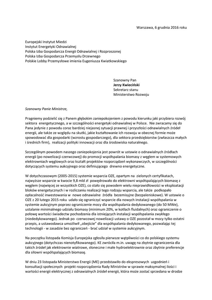 Warszawa, 6 grudnia 2016 roku Europejski Instytut Miedzi Instytut Energetyki Odnawialnej Polska Izba Gospodarcza Energii Odnawialnej i Rozproszonej Polska Izba Gospodarcza Przemysłu Drzewnego Polskie Lobby Przemysłowe imienia Eugeniusza Kwiatkowskiego Szanowny Pan Jerzy Kwieciński Sekretarz stanu Ministerstwo Rozwoju Szanowny Panie Ministrze, Pragniemy podzielić się z Panem głębokim zaniepokojeniem z powodu kierunku jaki przybiera rozwój sektora energetycznego, a w szczególności energetyki odnawialnej w Polsce. Nie zwracamy się do Pana jedynie z powodu coraz bardziej niejasnej sytuacji prawnej i przyszłości odnawialnych źródeł energii, ale także ze względu na skutki, jakie kształtowanie ich rozwoju w obecnej formie może spowodować dla gospodarki (wzrostu gospodarczego), dla sektora przedsiębiorstw (zwłaszcza małych i średnich firm), realizacji polityki innowacji oraz dla środowiska naturalnego. Szczególnym powodem naszego zaniepokojenia jest powrót w ustawie o odnawialnych źródłach energii (po nowelizacji czerwcowej) do promocji współspalania biomasy z węglem w systemowych elektrowniach węglowych oraz kształt projektów rozporządzeń wykonawczych, w szczególności dotyczących systemu aukcyjnego oraz definiującego drewno energetyczne. W dotychczasowym (2005-2015) systemie wsparcia OZE, opartym na zielonych certyfikatach, najwyższe wsparcie w kwocie 9,8 mld zł powędrowało do elektrowni współspalających biomasę z węglem (najwięcej ze wszystkich OZE), co stało się powodem wielu nieprawidłowości w eksploatacji bloków energetycznych i w rozliczaniu realizacji tego rodzaju wsparcia, ale także podkopało opłacalność inwestowania w nowe odnawialne źródła bezemisyjne (bezpaleniskowe). W ustawie o OZE z 20 lutego 2015 roku udało się ograniczyć wsparcie dla nowych instalacji współspalania w systemie aukcyjnym poprzez ograniczenie mocy dla współspalania dedykowanego (do 50 MWe), ustalanie minimalnego udziału biomasy (minimum 20%, w kotłach fluidalnych) oraz ograniczenie o połowę wartości świadectw pochodzenia dla istniejących instalacji współspalania zwykłego (niededykowanego). Jednak po czerwcowej nowelizacji ustawy o OZE pozostał w mocy tylko ostatni przepis, a ustawodawca umożliwił „obejście” dla współspalania dedykowanego, pozwalając tej technologii - w zasadzie bez ograniczeń - brać udział w systemie aukcyjnym. Na początku listopada Komisja Europejska zgłosiła pierwsze wątpliwości co do polskiego systemu aukcyjnego (dotychczas nienotyfikowanego). KE zwróciła m.in. uwagę na zbytnie ograniczenia dla takich źródeł jak elektrownie wiatrowe, słoneczne i małe hydroelektrownie oraz zbytnie preferencje dla siłowni współspalających biomasę. W dniu 23 listopada Ministerstwo Energii (ME) przedstawiło do ekspresowych uzgodnień i konsultacji społecznych projekt rozporządzenia Rady Ministrów w sprawie maksymalnej ilości i wartości energii elektrycznej z odnawialnych źródeł energii, która może zostać sprzedana w drodze aukcji w 2017 r. Projekt rozporządzenia zapowiada zakontraktowanie w systemie aukcyjnym w 2017 r. łącznej ilości energii z OZE na kwotę 13.4 mld zł (w okresie maksymalnie do 15 lat, bez uwzględnienia indeksacji kwoty wskaźnikiem inflacji). W naszej opinii nie można odpowiedzialnie poddać konsultacjom (w tym przedstawić odpowiedzialnej OSR), ani nawet zaopiniować, projektu tego rozporządzenia RM bez znajomości projektu rozporządzenia ME o cenach referencyjnych, które będą obowiązywać w 2017 roku. W dniu 27 października br. ogłoszono rozporządzenie Ministra Energii w sprawie ceny referencyjnej energii elektrycznej z OZE w 2016 r. oraz okresów obowiązujących wytwórców. W rozporządzeniu tym podano wiele dyskusyjnych cen, w tym w naszym przekonaniu zawyżoną cenę referencyjną dla współspalania, która może być przyczyna „windfall profits” dla elektrowni węglowych. Rozporządzenie to może zostać zmienione przez Ministra Energii w 2017 roku, ale – jak pokazują dotychczasowe doświadczenia, ceny referencyjne nie zawsze ściśle były związane z kosztami i ME ma dużą swobodę w ich kształtowaniu. ME ma też swobodę w określaniu okresu wsparcia, który dla wybranych technologii może być znacznie krótszy niż 15 lat i pozwolić na szybsze rozdysponowanie budżetu aukcyjnego (co byłoby również korzystne dla technologii współspalania). Analiza skomplikowanej i nieprzejrzystej struktury systemu aukcyjnego w powiązaniu z obecnie obowiązującymi cenami referencyjnymi oraz symulacja aukcji w 2017 roku prowadzą do konkluzji, że technologia współspalania może przejąć kolejne 9,2 mld zł z całej puli wsparcia, w największym koszyku aukcyjnym dla instalacji istniejących (w ramach tzw. aukcji migracyjnej) oraz w największym koszyku aukcyjnym dla nowych instalacji. Stosowna analiza zagrożeń i symulacja aukcji jest załącznikiem do niniejszego pisma. Została też przez Instytut Energetyki Odnawialnej przekazana na ręce Ministra Energii – Pana Krzysztofa Tchórzewskiego. Niniejszym pragniemy zwrócić Panu Ministrowi i Ministerstwu Rozwoju uwagę na szersze konsekwencje gospodarcze zrealizowania zarysowanego powyżej scenariusza. Jest to bowiem wielce prawdopodobny scenariusz ostrzegawczy. Prawdopodobieństwo realizacji takiego właśnie scenariusza zwiększa bowiem kształt innego projektu rozporządzenia do ustawy o odnawialnych źródłach energii, autorstwa Ministra Środowiska, dot. szczegółowych cech fizyko- chemicznych i jakościowo – wymiarowych drewna energetycznego (projekt z dn. 25.11.2016r). Obawy związane z tym rozporządzeniem w kontekście poważnych zaburzeń na rynku drewna i możliwej utraty konkrecyjności przemysku drzewnego zostały już przekazane przez Polską Izbę Przemysłu Drzewnego na ręce Pana Premiera Mateusza Morawieckiego. Dla spójności informacji kopię tego stanowisko załączam