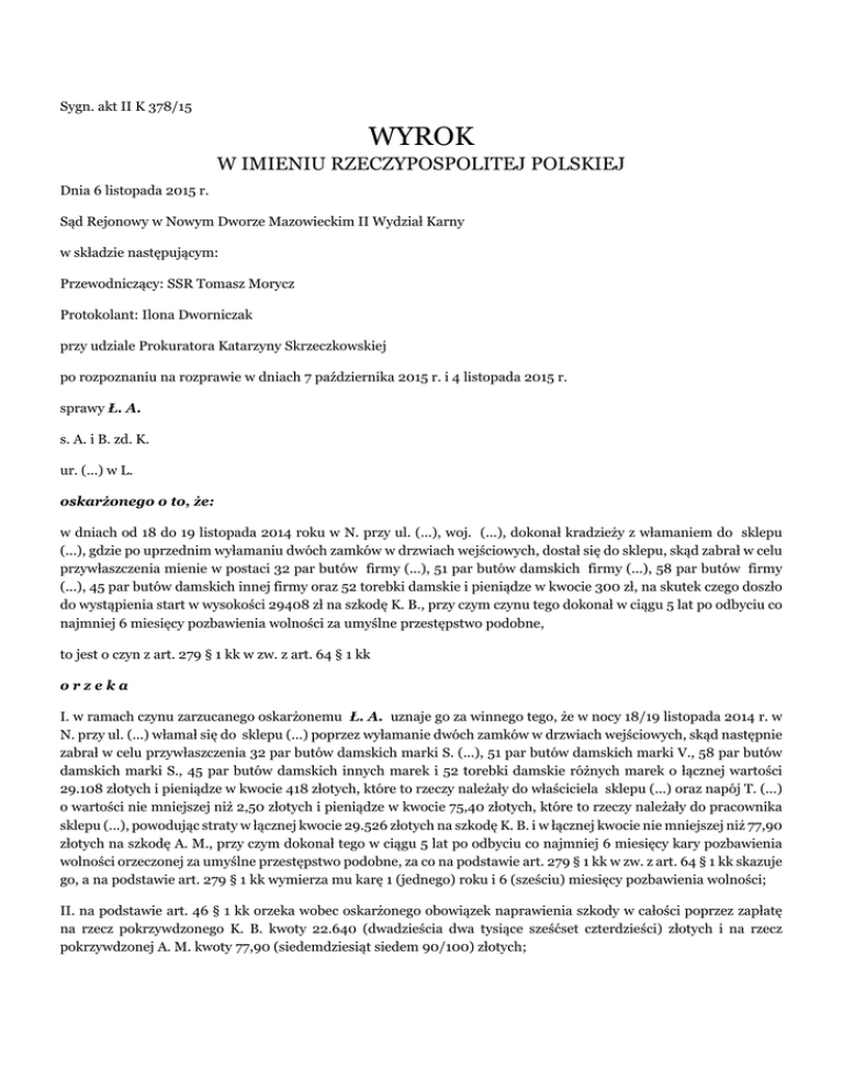 Sygn. akt II K 378/15 WYROK W IMIENIU RZECZYPOSPOLITEJ POLSKIEJ Dnia 6 listopada 2015 r. Sąd Rejonowy w Nowym Dworze Mazowieckim II Wydział Karny w składzie następującym: Przewodniczący: SSR Tomasz Morycz Protokolant: Ilona Dworniczak przy udziale Prokuratora Katarzyny Skrzeczkowskiej po rozpoznaniu na rozprawie w dniach 7 października 2015 r. i 4 listopada 2015 r. sprawy Ł. A. s. A. i B. zd. K. ur. (...) w L. oskarżonego o to, że: w dniach od 18 do 19 listopada 2014 roku w N. przy ul. (...), woj. (...), dokonał kradzieży z włamaniem do sklepu (...), gdzie po uprzednim wyłamaniu dwóch zamków w drzwiach wejściowych, dostał się do sklepu, skąd zabrał w celu przywłaszczenia mienie w postaci 32 par butów firmy (...), 51 par butów damskich firmy (...), 58 par butów firmy (...), 45 par butów damskich innej firmy oraz 52 torebki damskie i pieniądze w kwocie 300 zł, na skutek czego doszło do wystąpienia start w wysokości 29408 zł na szkodę K. B., przy czym czynu tego dokonał w ciągu 5 lat po odbyciu co najmniej 6 miesięcy pozbawienia wolności za umyślne przestępstwo podobne, to jest o czyn z art. 279 § 1 kk w zw. z art. 64 § 1 kk orzeka I. w ramach czynu zarzucanego oskarżonemu Ł. A. uznaje go za winnego tego, że w nocy 18/19 listopada 2014 r. w N. przy ul. (...) włamał się do sklepu (...) poprzez wyłamanie dwóch zamków w drzwiach wejściowych, skąd następnie zabrał w celu przywłaszczenia 32 par butów damskich marki S. (...), 51 par butów damskich marki V., 58 par butów damskich marki S., 45 par butów damskich innych marek i 52 torebki damskie różnych marek o łącznej wartości 29.108 złotych i pieniądze w kwocie 418 złotych, które to rzeczy należały do właściciela sklepu (...) oraz napój T. (...) o wartości nie mniejszej niż 2,50 złotych i pieniądze w kwocie 75,40 złotych, które to rzeczy należały do pracownika sklepu (...), powodując straty w łącznej kwocie 29.526 złotych na szkodę K. B. i w łącznej kwocie nie mniejszej niż 77,90 złotych na szkodę A. M., przy czym dokonał tego w ciągu 5 lat po odbyciu co najmniej 6 miesięcy kary pozbawienia wolności orzeczonej za umyślne przestępstwo podobne, za co na podstawie art. 279 § 1 kk w zw. z art. 64 § 1 kk skazuje go, a na podstawie art. 279 § 1 kk wymierza mu karę 1 (jednego) roku i 6 (sześciu) miesięcy pozbawienia wolności; II. na podstawie art. 46 § 1 kk orzeka wobec oskarżonego obowiązek naprawienia szkody w całości poprzez zapłatę na rzecz pokrzywdzonego K. B. kwoty 22.640 (dwadzieścia dwa tysiące sześćset czterdzieści) złotych i na rzecz pokrzywdzonej A. M. kwoty 77,90 (siedemdziesiąt siedem 90/100) złotych; III. na podstawie art. 44 § 2 kk orzeka przepadek na rzecz Skarbu Państwa dowodów rzeczowych w postaci worków i torebek, opisanych w wykazie dowodów rzeczowych poz. 15; IV. na podstawie art. 230 § 2 kpk nakazuje zwrócić oskarżonemu dowód rzeczowy w postaci telefonu komórkowego, opisany w wykazie dowodów rzeczowych pod poz. 14, a pokrzywdzonemu K. B. dowód rzeczowy w postaci plastikowy pojemnik na bilon, opisany w wykazie dowodów rzeczowych pod poz. 7; V. dowody rzeczowe w postaci fragmentów wkładek bębenkowych, opisane w wykazie dowodów rzeczowych pod poz. 2 i 3 uznać za ślady mogące doprowadzić do wykrycia sprawcy przestępstwa; VI. na podstawie art. 63 § 1 kk zalicza oskarżonemu na poczet orzeczonej wobec niego kary pozbawienia wolności okres zatrzymania od dnia 26 listopada 2014 r. do dnia 27 listopada 2014 r.; VII. na podstawie art. 624 § 1 kpk zwalnia oskarżonego od kosztów sądowych w całości, którymi obciąża Skarb Państwa.