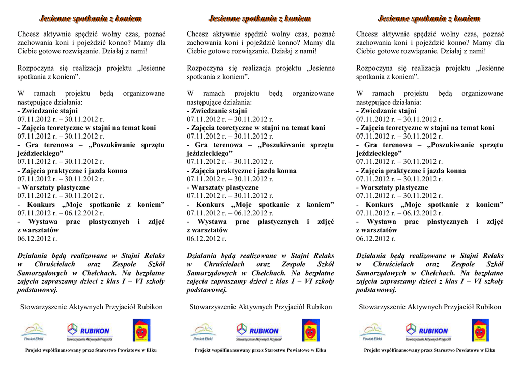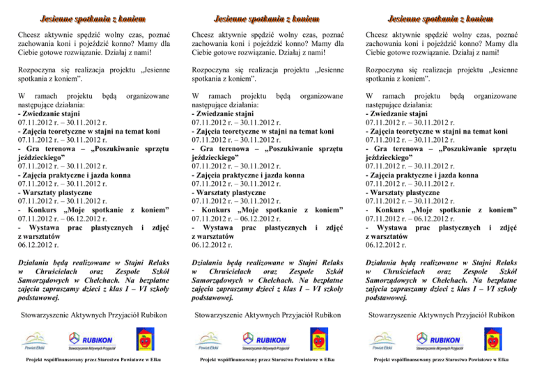 JJeessiieennnnee ssppoottkkaanniiaa zz kkoonniieem m JJeessiieennnnee ssppoottkkaanniiaa zz kkoonniieem m JJeessiieennnnee ssppoottkkaanniiaa zz kkoonniieem m Chcesz aktywnie spędzić wolny czas, poznać zachowania koni i pojeździć konno? Mamy dla Ciebie gotowe rozwiązanie. Działaj z nami! Chcesz aktywnie spędzić wolny czas, poznać zachowania koni i pojeździć konno? Mamy dla Ciebie gotowe rozwiązanie. Działaj z nami! Chcesz aktywnie spędzić wolny czas, poznać zachowania koni i pojeździć konno? Mamy dla Ciebie gotowe rozwiązanie. Działaj z nami! Rozpoczyna się realizacja projektu „Jesienne spotkania z koniem”. Rozpoczyna się realizacja projektu „Jesienne spotkania z koniem”. Rozpoczyna się realizacja projektu „Jesienne spotkania z koniem”. W ramach projektu będą organizowane następujące działania: - Zwiedzanie stajni 07.11.2012 r. – 30.11.2012 r. - Zajęcia teoretyczne w stajni na temat koni 07.11.2012 r. – 30.11.2012 r. - Gra terenowa – „Poszukiwanie sprzętu jeździeckiego” 07.11.2012 r. – 30.11.2012 r. - Zajęcia praktyczne i jazda konna 07.11.2012 r. – 30.11.2012 r. - Warsztaty plastyczne 07.11.2012 r. – 30.11.2012 r. - Konkurs „Moje spotkanie z koniem” 07.11.2012 r. – 06.12.2012 r. - Wystawa prac plastycznych i zdjęć z warsztatów 06.12.2012 r. W ramach projektu będą organizowane następujące działania: - Zwiedzanie stajni 07.11.2012 r. – 30.11.2012 r. - Zajęcia teoretyczne w stajni na temat koni 07.11.2012 r. – 30.11.2012 r. - Gra terenowa – „Poszukiwanie sprzętu jeździeckiego” 07.11.2012 r. – 30.11.2012 r. - Zajęcia praktyczne i jazda konna 07.11.2012 r. – 30.11.2012 r. - Warsztaty plastyczne 07.11.2012 r. – 30.11.2012 r. - Konkurs „Moje spotkanie z koniem” 07.11.2012 r. – 06.12.2012 r. - Wystawa prac plastycznych i zdjęć z warsztatów 06.12.2012 r. W ramach projektu będą organizowane następujące działania: - Zwiedzanie stajni 07.11.2012 r. – 30.11.2012 r. - Zajęcia teoretyczne w stajni na temat koni 07.11.2012 r. – 30.11.2012 r. - Gra terenowa – „Poszukiwanie sprzętu jeździeckiego” 07.11.2012 r. – 30.11.2012 r. - Zajęcia praktyczne i jazda konna 07.11.2012 r. – 30.11.2012 r. - Warsztaty plastyczne 07.11.2012 r. – 30.11.2012 r. - Konkurs „Moje spotkanie z koniem” 07.11.2012 r. – 06.12.2012 r. - Wystawa prac plastycznych i zdjęć z warsztatów 06.12.2012 r. Działania będą realizowane w Stajni Relaks w Chruścielach oraz Zespole Szkół Samorządowych w Chełchach. Na bezpłatne zajęcia zapraszamy dzieci z klas I – VI szkoły podstawowej. Działania będą realizowane w Stajni Relaks w Chruścielach oraz Zespole Szkół Samorządowych w Chełchach. Na bezpłatne zajęcia zapraszamy dzieci z klas I – VI szkoły podstawowej. Działania będą realizowane w Stajni Relaks w Chruścielach oraz Zespole Szkół Samorządowych w Chełchach. Na bezpłatne zajęcia zapraszamy dzieci z klas I – VI szkoły podstawowej. Stowarzyszenie Aktywnych Przyjaciół Rubikon Stowarzyszenie Aktywnych Przyjaciół Rubikon Stowarzyszenie Aktywnych Przyjaciół Rubikon Projekt współfinansowany przez Starostwo Powiatowe w Ełku Projekt współfinansowany przez Starostwo Powiatowe w Ełku Projekt współfinansowany przez Starostwo Powiatowe w Ełku