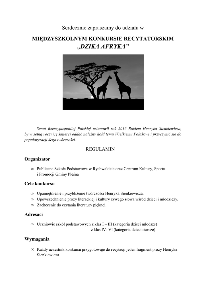 Serdecznie zapraszamy do udziału w MIĘDZYSZKOLNYM KONKURSIE RECYTATORSKIM „DZIKA AFRYKA” Senat Rzeczypospolitej Polskiej ustanowił rok 2016 Rokiem Henryka Sienkiewicza, by w setną rocznicę śmierci oddać należny hołd temu Wielkiemu Polakowi i przyczynić się do popularyzacji Jego twórczości. REGULAMIN Organizator • Publiczna Szkoła Podstawowa w Rychwałdzie oraz Centrum Kultury, Sportu i Promocji Gminy Pleśna Cele konkursu • • • Upamiętnienie i przybliżenie twórczości Henryka Sienkiewicza. Upowszechnienie prozy literackiej i kultury żywego słowa wśród dzieci i młodzieży. Zachęcenie do czytania literatury pięknej. Adresaci • Uczniowie szkół podstawowych z klas I – III (kategoria dzieci młodsze) z klas IV- VI (kategoria dzieci starsze) Wymagania • Każdy uczestnik konkursu przygotowuje do recytacji jeden fragment prozy Henryka Sienkiewicza. • Fragment wygłaszany przez ucznia ma być zaczerpnięty z powieści „W pustyni i w puszczy”, ponadto musi dotyczyć afrykańskiego krajobrazu (w/w utwór obfituje w opisy przyrody zarówno sawanny, buszu, pustyni, zjawisk atmosferycznych, fauny i flory Czarnego Lądu – takie właśnie opisy prosimy). • Czas prezentacji do 4 min. • Szkoła może zgłosić po 3 uczestników z każdej kategorii wiekowej. Warunki uczestnictwa • Zgłoszenie uczestników do Publicznej Szkoły Podstawowej w Rychwałdzie telefonicznie 14 679 81 27 e-mailem [email protected] listownie Publiczna Szkoła Podstawowa w Rychwałdzie, Rychwałd 120, 32-171 Pleśna (z dopiskiem konkurs recytatorski) osobiście do dyrekcji szkoły (osobą odpowiedzialną za konkurs jest Katarzyna Piórkowska) Terminy konkursu • do 3 czerwca 2016 r. zgłoszenia uczestników • 7 czerwca 2016 roku o godz.9.00 w Publicznej Szkole Podstawowej w Rychwałdzie Konkurs Międzyszkolny – gala finałowa Ocena jury i nagrody • • • • Powołane przez organizatora jury oceni prezentację biorąc pod uwagę następujące kryteria: dobór fragmentu powieści i jego pamięciowe opanowanie, interpretacja (umiejętności aktorskie) wymowa i intonacja, wrażenia artystyczne/estetyczne (np. strój, rekwizyty, podkład muzyczny). W dwóch kategoriach wiekowych zostaną przyznane nagrody oraz wyróżnienia. Wszyscy uczestnicy otrzymają dyplom za udział w konkursie. Decyzje jury są ostateczne. Postanowienia końcowe • • Zgłoszenie uczestnictwa w konkursie jest jednoznaczne z akceptacją powyższego regulaminu. Zgłaszający wyraża zgodę na rejestrację fotograficzną i wideo przez organizatora oraz publikację i emisję w dowolnych mediach, a także wykorzystanie danych osobowych w materiałach dotyczących konkursu. KARTA ZGŁOSZENIA UCZESTNIKA KONKURSU RECYTATORSKIEGO „DZIKA AFRYKA” Imię i nazwisko..................................................................................................................................................... Klasa................. Kategoria wiekowa: …………………………………………………………………………………………………………………… Imię i nazwisko nauczyciela-opiekuna …………………………………………………………………………………………………………………… Nazwa i adres szkoły: ……………………………………………………………………………………………………………………… ……………………………………………………………………………………………………………………… Repertuar.......................................................................................................................................... Oświadczam, że zapoznałem się z tekstem Regulaminu Konkursu i akceptuję jego treść. Oświadczam, że zgodnie ustawą z dnia 29 sierpnia 1997 r. o ochronie danych osobowych (Dz.U. z 2002 r. Nr 101, poz. 926) wyrażam zgodę na przetwarzanie wymienionych w Karcie Zgłoszeniowej Uczestnika Konkursu, moich danych osobowych przez organizatora konkursu „Dzika Afryka”. ……….…………………………………………………. data, miejsce, podpis Uczestnika ……….…………………………………………………. podpis Opiekuna ……….…………………………………………………. pieczęć Instytucji