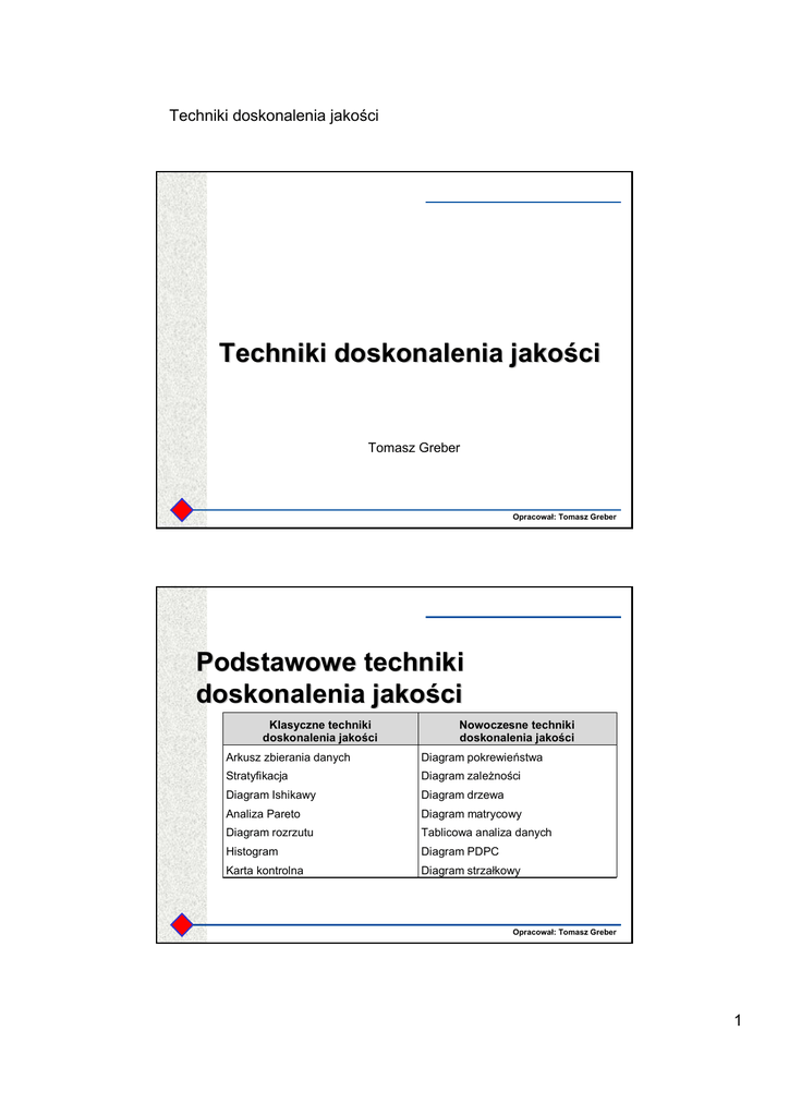 Techniki doskonalenia jakości Techniki doskonalenia jakości Tomasz Greber Opracował: Tomasz Greber Podstawowe techniki doskonalenia jakości Klasyczne techniki doskonalenia jakości Nowoczesne techniki doskonalenia jakości Arkusz zbierania danych Diagram pokrewieństwa Stratyfikacja Diagram zależności Diagram Ishikawy Diagram drzewa Analiza Pareto Diagram matrycowy Diagram rozrzutu Tablicowa analiza danych Histogram Diagram PDPC Karta kontrolna Diagram strzałkowy Opracował: Tomasz Greber 1 Techniki doskonalenia jakości Metody i narzędzia SPC Badanie zdolności Metody SKJ DOE QFD Narzędzia FMEA Podstawowe techniki doskonalenia jakości Rozwój i projekt Konstrukcja Prototyp Przygotow. produkcji W ytwarzanie Montaż i sprzedaż Serwis Opracował: Tomasz Greber Dźwignia jakości QFD FMEA Jakość Narzędzia doskonalenia jakości SPC DOE Opracował: Tomasz Greber 2 Techniki doskonalenia jakości Klasyczne techniki doskonalenia jakości Opracował: Tomasz Greber Arkusz zbierania danych Jest to arkusz wykorzystywany do zbierania i wstępnego porządkowania wyników pomiarów. Rodzaj wady Ilość wyrobów niezgodnych Suma Plama 9 Pęknięcie 14 Deformacja 25 Opracował: Tomasz Greber 3 Techniki doskonalenia jakości Stratyfikacja Jest to technika polegająca na tzw. rozwarstwieniu danych, czyli podzieleniu ich z uwagi na źródło ich pochodzenia (np. różne stanowiska pracy, różni pracownicy, różne materiały itd.) Rodzaj wady Ilość w yrobów niezgodnych Suma Plama 9 Pęknięcie 14 Deformacja 25 - pracownik A - pracownik B Opracował: Tomasz Greber Diagram Ishikawy Za jego pomocą pokazuje się podzielone na pewne kategorie przyczyny powodujące rozważany problem. Człowiek Zarządzanie niskie kwalifikacje niedostateczna informacja złe planowanie pracy niedbałe wykonanie pracy brak nadzoru pracy Niesprawny wyrób brak konserwacji zły gatunek materiału źle dobrana obrabiarka Maszyna wady powierzchni niekompletna dokumentacja technologiczna błędy wymiarowe zła konstrukcja nieodpowiednia oprzyrządowania twardość Materiał Metoda Opracował: Tomasz Greber 4 Techniki doskonalenia jakości Wykres Ishikawy • Określenie problemu i narysowanie „szkieletu” • Dopisywanie możliwych przyczyn powstania problemu • Opracowanie dalszego planu działania • Znalezienie sposobów eliminacji przyczyn problemu metody pracy grupowej Opracował: Tomasz Greber Diagram Ishikawy (5M+M+E) Maszyna Człowiek Zarządzanie Technologia Problem Materiał …………… …………… Opracował: Tomasz Greber 5 Techniki doskonalenia jakości Diagram Ishikawy (fragment) Człowiek Niebezpieczne ustawienie przedmiotów na biurku Pracownik źle podłączył kable, co spaliło komputer Za dużo luźnych kabli pod nogami Rozlany napój spowodował zwarcie Pracownik przypadkiem wyrwał kable Komputer raptownie sam się wyłączył i nie działa Kable nie są dokręcone do gniazdek Nieostrożność pracownika Spalenie się bezpieczników Brak dopływu prądu Wyłączenie dopływu prądu przez dostawcę Otoczenie Opracował: Tomasz Greber Analiza Pareto Służy do określenia najpoważniejszych przyczyn analizowanego problemu. Opiera się na zasadzie 20/80, wg której stosunkowo niewiele przyczyn powoduje większość skutków. udział procentowy % 100 50 A B C D E F G H przyczyny Opracował: Tomasz Greber 6 Techniki doskonalenia jakości Analiza Pareto Opracował: Tomasz Greber Wykres Pareto - Lorenza % 100 90 80 70 60 50 wartości skumulowane składników 40 30 20 10 0 wartości poszczególnych składników poszczególne składniki (czynniki) Opracował: Tomasz Greber 7 Techniki doskonalenia jakości Analiza Pareto - przykład Opracował: Tomasz Greber Analiza Pareto - procedura 1. Wybrać czynniki, które mają być poddane analizie. 2. Wybrać jednostkę miary do analizy, taką jak liczba zdarzeń, koszty lub inne miary wpływu. 3. Wybrać przedział czasu, z którego dane mają być analizowane. 4. Wypisać składniki od lewej do prawej na osi poziomej w porządku malejącej wartości jednostki miary. Kategorie zawierające najmniej składników mogą być włączone do kategorii inne i umieszczone jako ostatnie na końcu z prawej strony. 5. Narysować dwie pionowe osie, po jednej na każdym końcu osi poziomej. Podziałka z lewej strony powinna być wyskalowana w jednostce miary. Jej wysokość musi być równa sumie wartości wszystkich składników. Podziałka z prawej strony musi mieć tą samą wysokość i być wyskalowana od 0 do 100%. 6. Powyżej każdego składnika narysować prostokąt, którego wysokość przedstawia wartość jednostki miary dla tego składnika. 7. Narysować linię sumarycznej częstotliwości poprzez zsumowanie wartości każdego składnika od lewej do prawej. 8. Określić grupę składników mających największy udział w analizowanym skutku. Opracował: Tomasz Greber 8 Techniki doskonalenia jakości Dane z kart niezgodności Niezgodności 1. 2. 3. 4. 5. 6. 7. 8. 9. Ilość wystąpień Puste okienko Nieczytelny formularz Zagubienie dokumentacji Długa kolejka Błędna informacja Brak formularzy Niedostępne informacje Przedłużona przerwa Trudny kontakt telefoniczny 3 21 1 61 6 14 41 1 3 151 RAZEM Opracował: Tomasz Greber Wykres Pareto Analiza danych z kart niezgodności 160 100% 150 140 130 80% 120 100 60% 90 80 70 60 61 40% Udział procentowy Liczba niezgodności 110 50 41 40 20% 30 21 20 14 10 6 3 3 1 1 1 9 3 8 0 4 7 2 6 5 Numer niezgodności Opracował: Tomasz Greber 9 Techniki doskonalenia jakości Diagram rozproszenia Jest to wykres o osiach poziomej i pionowej, na których opisane są wartości dwóch badanych zmiennych - zmiennej niezależnej A i zależnej B (zależnej od wartości parametru A). Następnie punktami zaznacza się zależności pomiędzy zmiennymi otrzymując „chmurę” punktów Procent produk. wyrobów wadliwych [%] 2 Współrzędne punktu: Temperatura 31,5 °C Procent braków 2,3 % 1 0 15 20 25 30 35 40 [°C] Temperatura n
