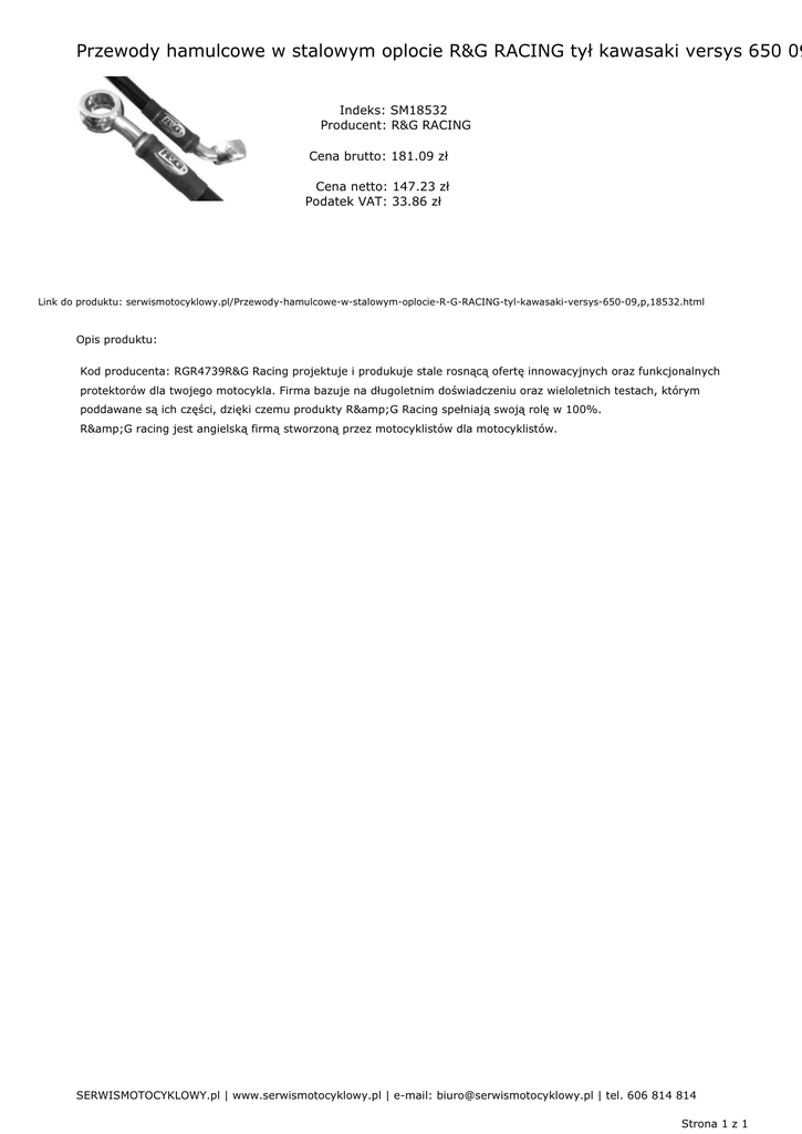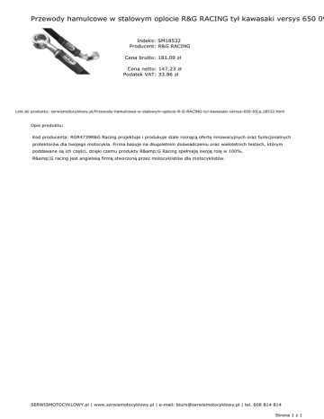 Przewody hamulcowe w stalowym oplocie R&G RACING tył kawasaki versys 650 09 Indeks: SM18532 Producent: R&G RACING Cena brutto: 181.09 zł Cena netto: 147.23 zł Podatek VAT: 33.86 zł Link do produktu: serwismotocyklowy.pl/Przewody-hamulcowe-w-stalowym-oplocie-R-G-RACING-tyl-kawasaki-versys-650-09,p,18532.html Opis produktu: Kod producenta: RGR4739R&G Racing projektuje i produkuje stale rosnącą ofertę innowacyjnych oraz funkcjonalnych protektorów dla twojego motocykla. Firma bazuje na długoletnim doświadczeniu oraz wieloletnich testach, którym poddawane są ich części, dzięki czemu produkty R&G Racing spełniają swoją rolę w 100%. R&G racing jest angielską firmą stworzoną przez motocyklistów dla motocyklistów. SERWISMOTOCYKLOWY.pl | www.serwismotocyklowy.pl | e-mail: [email protected] | tel. 606 814 814 Strona 1 z 1