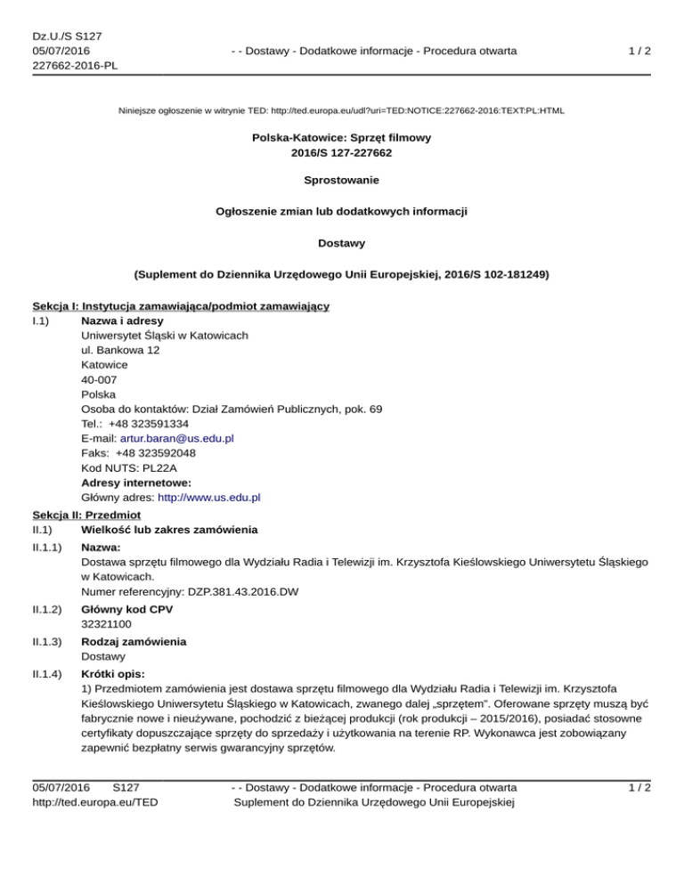 Dz.U./S S127 05/07/2016 227662-2016-PL - - Dostawy - Dodatkowe informacje - Procedura otwarta 1/2 Niniejsze ogłoszenie w witrynie TED: http://ted.europa.eu/udl?uri=TED:NOTICE:227662-2016:TEXT:PL:HTML Polska-Katowice: Sprzęt filmowy 2016/S 127-227662 Sprostowanie Ogłoszenie zmian lub dodatkowych informacji Dostawy (Suplement do Dziennika Urzędowego Unii Europejskiej, 2016/S 102-181249) Sekcja I: Instytucja zamawiająca/podmiot zamawiający I.1) Nazwa i adresy Uniwersytet Śląski w Katowicach ul. Bankowa 12 Katowice 40-007 Polska Osoba do kontaktów: Dział Zamówień Publicznych, pok. 69 Tel.: +48 323591334 E-mail: [email protected] Faks: +48 323592048 Kod NUTS: PL22A Adresy internetowe: Główny adres: http://www.us.edu.pl Sekcja II: Przedmiot II.1) Wielkość lub zakres zamówienia II.1.1) Nazwa: Dostawa sprzętu filmowego dla Wydziału Radia i Telewizji im. Krzysztofa Kieślowskiego Uniwersytetu Śląskiego w Katowicach. Numer referencyjny: DZP.381.43.2016.DW II.1.2) Główny kod CPV 32321100 II.1.3) Rodzaj zamówienia Dostawy II.1.4) Krótki opis: 1) Przedmiotem zamówienia jest dostawa sprzętu filmowego dla Wydziału Radia i Telewizji im. Krzysztofa Kieślowskiego Uniwersytetu Śląskiego w Katowicach, zwanego dalej „sprzętem”. Oferowane sprzęty muszą być fabrycznie nowe i nieużywane, pochodzić z bieżącej produkcji (rok produkcji – 2015/2016), posiadać stosowne certyfikaty dopuszczające sprzęty do sprzedaży i użytkowania na terenie RP. Wykonawca jest zobowiązany zapewnić bezpłatny serwis gwarancyjny sprzętów. 05/07/2016 S127 http://ted.europa.eu/TED - - Dostawy - Dodatkowe informacje - Procedura otwarta Suplement do Dziennika Urzędowego Unii Europejskiej 1/2 Dz.U./S S127 05/07/2016 227662-2016-PL - - Dostawy - Dodatkowe informacje - Procedura otwarta 2/2 2) Zakres zamówienia obejmuje: zakup sprzętów wraz z ich dostarczeniem do Zamawiającego, rozładunkiem, wniesieniem do miejsca wskazanego przez Zamawiającego. 3) Szczegółowy opis przedmiotu zamówienia stanowi załącznik nr 2 do SIWZ. Sekcja VI: Informacje uzupełniające VI.5) Data wysłania niniejszego ogłoszenia: 01/07/2016 VI.6) Numer pierwotnego ogłoszenia Numer ogłoszenia w Dz.Urz. UE – OJ/S: 2016/S 102-181249 Sekcja VII: Zmiany VII.1) Informacje do zmiany lub dodania VII.1.2) Tekst, który należy poprawić w pierwotnym ogłoszeniu Numer sekcji: IV.2.2 Zamiast: Data: 05/07/2016 Czas lokalny: 10:30 Powinno być: Data: 08/07/2016 Czas lokalny: 10:30 Numer sekcji: IV.2.6 Zamiast: Data: 02/09/2016 Powinno być: Data: 05/09/2016 Numer sekcji: IV.2.7 Zamiast: Data: 05/07/2016 Czas lokalny: 11:00 Powinno być: Data: 08/07/2016 Czas lokalny: 11:00 VII.2) Inne dodatkowe informacje: 05/07/2016 S127 http://ted.europa.eu/TED - - Dostawy - Dodatkowe informacje - Procedura otwarta Suplement do Dziennika Urzędowego Unii Europejskiej 2/2
