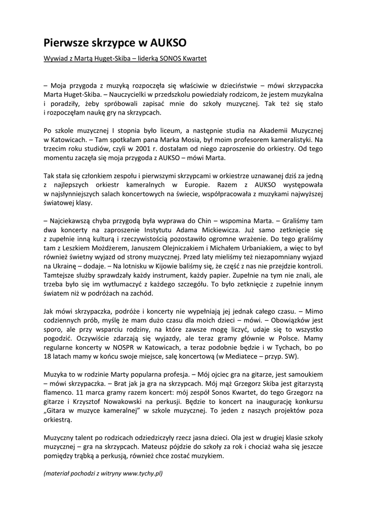 Pierwsze skrzypce w AUKSO Wywiad z Martą Huget-Skiba – liderką SONOS Kwartet – Moja przygoda z muzyką rozpoczęła się właściwie w dzieciństwie – mówi skrzypaczka Marta Huget-Skiba. – Nauczycielki w przedszkolu powiedziały rodzicom, że jestem muzykalna i poradziły, żeby spróbowali zapisać mnie do szkoły muzycznej. Tak też się stało i rozpoczęłam naukę gry na skrzypcach. Po szkole muzycznej I stopnia było liceum, a następnie studia na Akademii Muzycznej w Katowicach. – Tam spotkałam pana Marka Mosia, był moim profesorem kameralistyki. Na trzecim roku studiów, czyli w 2001 r. dostałam od niego zaproszenie do orkiestry. Od tego momentu zaczęła się moja przygoda z AUKSO – mówi Marta. Tak stała się członkiem zespołu i pierwszymi skrzypcami w orkiestrze uznawanej dziś za jedną z najlepszych orkiestr kameralnych w Europie. Razem z AUKSO występowała w najsłynniejszych salach koncertowych na świecie, współpracowała z muzykami najwyższej światowej klasy. – Najciekawszą chyba przygodą była wyprawa do Chin – wspomina Marta. – Graliśmy tam dwa koncerty na zaproszenie Instytutu Adama Mickiewicza. Już samo zetknięcie się z zupełnie inną kulturą i rzeczywistością pozostawiło ogromne wrażenie. Do tego graliśmy tam z Leszkiem Możdżerem, Januszem Olejniczakiem i Michałem Urbaniakiem, a więc to był również świetny wyjazd od strony muzycznej. Przed laty mieliśmy też niezapomniany wyjazd na Ukrainę – dodaje. – Na lotnisku w Kijowie baliśmy się, że część z nas nie przejdzie kontroli. Tamtejsze służby sprawdzały każdy instrument, każdy papier. Zupełnie na tym nie znali, ale trzeba było się im wytłumaczyć z każdego szczegółu. To było zetknięcie z zupełnie innym światem niż w podróżach na zachód. Jak mówi skrzypaczka, podróże i koncerty nie wypełniają jej jednak całego czasu. – Mimo codziennych prób, myślę że mam dużo czasu dla moich dzieci – mówi. – Obowiązków jest sporo, ale przy wsparciu rodziny, na które zawsze mogę liczyć, udaje się to wszystko pogodzić. Oczywiście zdarzają się wyjazdy, ale teraz gramy głównie w Polsce. Mamy regularne koncerty w NOSPR w Katowicach, a teraz podobnie będzie i w Tychach, bo po 18 latach mamy w końcu swoje miejsce, salę koncertową (w Mediatece – przyp. SW). Muzyka to w rodzinie Marty popularna profesja. – Mój ojciec gra na gitarze, jest samoukiem – mówi skrzypaczka. – Brat jak ja gra na skrzypcach. Mój mąż Grzegorz Skiba jest gitarzystą flamenco. 11 marca gramy razem koncert: mój zespół Sonos Kwartet, do tego Grzegorz na gitarze i Krzysztof Nowakowski na perkusji. Będzie to koncert na inaugurację konkursu „Gitara w muzyce kameralnej” w szkole muzycznej. To jeden z naszych projektów poza orkiestrą. Muzyczny talent po rodzicach odziedziczyły rzecz jasna dzieci. Ola jest w drugiej klasie szkoły muzycznej – gra na skrzypcach. Mateusz pójdzie do szkoły za rok i chociaż waha się jeszcze pomiędzy trąbką a perkusją, również chce zostać muzykiem. (materiał pochodzi z witryny www.tychy.pl)