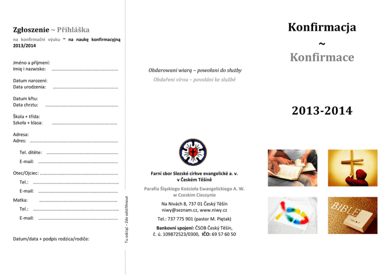 Konfirmacja ~ Konfirmace Zgłoszenie ~ Přihláška na konfirmační výuku ~ na naukę konfirmacyjną 2013/2014 Jméno a příjmení: Imię i nazwisko: .................................................... Datum narození: Data urodzenia: Datum křtu: Data chrztu: Obdarowani wiarą – powołani do służby Obdařeni vírou – povoláni ke službě ................................................... ......................................................... Škola + třída: Szkoła + klasa: 2013-2014 ................................................... Adresa: Adres: ..................................................................... Tel. dítěte: ........................................................ E-mail: .............................................................. Otec/Ojciec: ............................................................. Farní sbor Slezské církve evangelické a. v. v Českém Těšíně Tel.: ................................................................... Matka: ............................................................. Tel.: ................................................................... E-mail: .............................................................. Datum/data + podpis rodzica/rodiče: Tu odciąć – Zde odstřihnout E-mail: .............................................................. Parafia Śląskiego Kościoła Ewangelickiego A. W. w Czeskim Cieszynie Na Nivách 8, 737 01 Český Těšín [email protected], www.niwy.cz Tel.: 737 775 901 (pastor M. Piętak) Bankovní spojení: ČSOB Český Těšín, č. ú. 109872523/0300, IČO: 69 57 60 50 Szanowni rodzice! W tym roku szkolnym w naszej parafii ponownie oferujemy naukę konfirmacyjną. Spotkania odbywać się będą w piątki od godz. 15.00 do ok. 16.30 w lokalach kościoła ewangelickiego Na Niwach 7 w Czeskim Cieszynie. Po lekcji konfirmacyjnej zapraszamy wszystkich konfirmantów na (nieobowiązkowe) spotkanie dorostu (16.30 – ok. 18.30). Program spotkań zawierać będzie jak nauczanie, tak też i gry, współzawodnictwa, wspólny śpiew itp. Częścią składową całego cyklu będą także dwie imprezy weekendowe (jesienią oraz wiosną) w niedalekiej okolicy. Pierwsze spotkanie odbędzie się w piątek dnia 13. 9. 2013 o godz. 15.00 w salce pod kościołem. Ofertę nauki konfirmacyjnej pozwalamy sobie skierować do wszystkich dzieci, które były ochrzczone w naszym kościele i parafii a teraz osiągają wiek około 12-13 lat. Jako rodzice (razem z rodzicami chrzestnymi) ślubowaliście podczas chrztu przed Bogiem, że będziecie je wychowywać w szczerej wierze i miłości do Boga i bliźnich. Od tego momentu minęło sporo czasu a teraz nadchodzi czas, kiedy wasze dziecko ma samo ustalić swój własny stosunek do Boga, przypomnieć sobie znaczenie własnego chrztu i pogłębić wiedzę w sprawach wiary. Do tego właśnie przeznaczona jest nauka konfirmacyjna. Serdecznie zapraszamy! W razie zainteresowania można dziecko zgłosić przez podanie Zgłoszenia (patrz część do odcięcia) i to do niedzieli 8. 9. 2013 (włącznie). Z życzeniami Błogosławieństwa Bożego Prezbiterstwo zboru i Mgr. Martin Piętak, Th. D. pastor Vážení rodiče! Spolu se začátkem nového školního roku bude v našem sboru probíhat konfirmační výuka dětí. Bude se konat vždy v pátek od 15.00 do ca. 16.30 hod. v prostorách evangelického kostela Na Nivách 7, Český Těšín. Po konfirmační výuce jsou všichni konfirmandi srdečně zváni na (nepovinná) setkání dorostu (16.30 – ca. 18.30). Program setkání bude obsahovat jednak vyučování a jednak také hry, aktivity, společný zpěv a sdílení. Součástí celého cyklu budou také dvě víkendovky v nedalekém okolí – na podzim a na jaře. První setkání se uskuteční v pátek 13. 9. 2013 v 15.00 hod. v sále pod kostelem. Jaki numer telefonu ma Bóg? Kdo se dostane do nebe? Dlaczego czytać Biblię? Proč Bůh dovoluje, aby trpěli nevinní? Co říká Bible o lásce? Co to jest grzech? Czy będzie mi się lepiej powodziło, gdy będę wierzyć w Boga? Které přikázání je nejtěžší? A které nejlehčí? Kolik jich stačí dodržovat? Czy naprawdę muszę chodzić do kościoła, aby Pan Bóg był szczęśliwy? ...? Tuto konfirmační výuku si dovolujeme nabídnout všem dětem, které byly v naší církvi a sboru pokřtěny a nyní dosahují věku kolem 12-13 let. Při křtu jste jako rodiče spolu s kmotry před Bohem slíbili, že je budete vychovávat v upřímné víře a lásce k Bohu i k bližním. Je tomu už hezká řádka let a nyní přichází čas, kdy si má Vaše dítě samo ujasnit svůj vztah k Bohu, připomenout si význam vlastního křtu a prohloubit své znalosti ve věcech víry. A právě k tomu je určena konfirmační výuka. Srdečně zveme! V případě zájmu můžete své dítě přihlásit doručením Přihlášky (viz část k odstřihnutí) a to do neděle 8. 9. 2013 (včetně). S přáním Božího požehnání Presbyterstvo sboru a Mgr. Martin Piętak, Th. D. Pastor Chci se dovědět víc ... Zgłaszam się!
