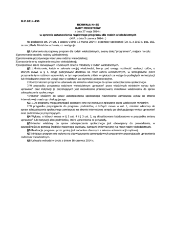 M.P.2014.430 UCHWAŁA Nr 85 RADY MINISTRÓW z dnia 27 maja 2014 r. w sprawie ustanowienia rządowego programu dla rodzin wielodzietnych (M.P. z dnia 5 czerwca 2014 r.) Na podstawie art. 24 ust. 1 ustawy z dnia 12 marca 2004 r. o pomocy społecznej (Dz. U. z 2013 r. poz. 182, ze zm.) Rada Ministrów uchwala, co następuje: §1.Ustanawia się rządowy program dla rodzin wielodzietnych, zwany dalej "programem", mający na celu: 1)promowanie modelu rodziny wielodzietnej; 2)promowanie pozytywnego wizerunku rodziny wielodzietnej; 3)umacnianie oraz wspieranie rodziny wielodzietnej; 4)zwiększenie szans rozwojowych i życiowych dzieci i młodzieży z rodzin wielodzietnych. §2.1.Ministrowie, każdy w zakresie swojej właściwości, biorąc pod uwagę możliwość realizacji celów, o których mowa w § 1, mogą podejmować działania na rzecz rodzin wielodzietnych, w szczególności przez przyznanie tym rodzinom uprawnień, w tym wprowadzenie zniżek w opłatach za wstęp do podległych im instytucji lub świadczone przez nie usługi oraz w opłatach za czynności administracyjne. 2.Koordynatorem programu ustanawia się ministra właściwego do spraw zabezpieczenia społecznego. 3.W przypadku przyznania rodzinom wielodzietnym uprawnień przez właściwych ministrów wykaz tych uprawnień oraz instytucji je przyznających jest niezwłocznie przekazywany ministrowi właściwemu do spraw zabezpieczenia społecznego. 4.Minister właściwy do spraw zabezpieczenia społecznego niezwłocznie zamieszcza wykaz na stronie internetowej urzędu go obsługującego. §3.1.Do programu mogą przystąpić podmioty inne niż instytucje zgłoszone przez właściwych ministrów. 2.W przypadku przystąpienia do programu podmiotów, o których mowa w ust. 1, minister właściwy do spraw zabezpieczenia społecznego zamieszcza na stronie internetowej urzędu go obsługującego wykaz uprawnień oraz podmiotów je przyznających. §4.Wykazy, o których mowa w § 2 ust. 4 i § 3 ust. 2, są aktualizowane każdorazowo w przypadku zmiany uprawnień lub instytucji albo podmiotów, które uprawnienia te przyznały. §5.Minister właściwy do spraw zabezpieczenia społecznego jest obowiązany do prowadzenia, w szczególności za pomocą środków masowego przekazu, kampanii informacyjnej na rzecz rodzin wielodzietnych. §6.Realizacja programu przez gminę jest zadaniem zleconym z zakresu administracji rządowej. §7.Niniejszy program nie wpływa na obowiązywanie samorządowych programów przyznających uprawnienia rodzinom wielodzietnym. §8.Uchwała wchodzi w życie z dniem 16 czerwca 2014 r.