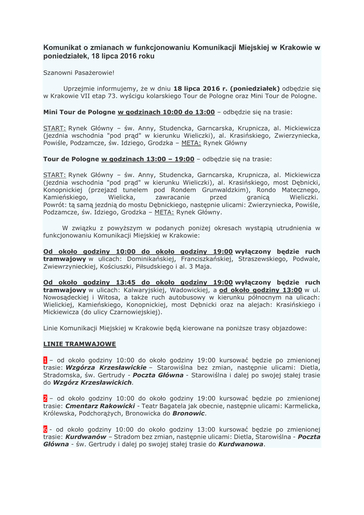 Komunikat o zmianach w funkcjonowaniu Komunikacji Miejskiej w Krakowie w poniedziałek, 18 lipca 2016 roku Szanowni Pasażerowie! Uprzejmie informujemy, że w dniu 18 lipca 2016 r. (poniedziałek) odbędzie się w Krakowie VII etap 73. wyścigu kolarskiego Tour de Pologne oraz Mini Tour de Pologne. Mini Tour de Pologne w godzinach 10:00 do 13:00 – odbędzie się na trasie: START: Rynek Główny – św. Anny, Studencka, Garncarska, Krupnicza, al. Mickiewicza (jezdnia wschodnia "pod prąd" w kierunku Wieliczki), al. Krasińskiego, Zwierzyniecka, Powiśle, Podzamcze, św. Idziego, Grodzka – META: Rynek Główny Tour de Pologne w godzinach 13:00 – 19:00 – odbędzie się na trasie: START: Rynek Główny – św. Anny, Studencka, Garncarska, Krupnicza, al. Mickiewicza (jezdnia wschodnia "pod prąd" w kierunku Wieliczki), al. Krasińskiego, most Dębnicki, Konopnickiej (przejazd tunelem pod Rondem Grunwaldzkim), Rondo Matecznego, Kamieńskiego, Wielicka, zawracanie przed granicą Wieliczki. Powrót: tą samą jezdnią do mostu Dębnickiego, następnie ulicami: Zwierzyniecka, Powiśle, Podzamcze, św. Idziego, Grodzka – META: Rynek Główny. W związku z powyższym w podanych poniżej okresach wystąpią utrudnienia w funkcjonowaniu Komunikacji Miejskiej w Krakowie: Od około godziny 10:00 do około godziny 19:00 wyłączony będzie ruch tramwajowy w ulicach: Dominikańskiej, Franciszkańskiej, Straszewskiego, Podwale, Zwiewrzynieckiej, Kościuszki, Piłsudskiego i al. 3 Maja. Od około godziny 13:45 do około godziny 19:00 wyłączony będzie ruch tramwajowy w ulicach: Kalwaryjskiej, Wadowickiej, a od około godziny 13:00 w ul. Nowosądeckiej i Witosa, a także ruch autobusowy w kierunku północnym na ulicach: Wielickiej, Kamieńskiego, Konopnickiej, most Dębnicki oraz na alejach: Krasińskiego i Mickiewicza (do ulicy Czarnowiejskiej). Linie Komunikacji Miejskiej w Krakowie będą kierowane na poniższe trasy objazdowe: LINIE TRAMWAJOWE 1 – od około godziny 10:00 do około godziny 19:00 kursować będzie po zmienionej trasie: Wzgórza Krzesławickie – Starowiślna bez zmian, następnie ulicami: Dietla, Stradomska, św. Gertrudy - Poczta Główna - Starowiślna i dalej po swojej stałej trasie do Wzgórz Krzesławickich. 2 – od około godziny 10:00 do około godziny 19:00 kursować będzie po zmienionej trasie: Cmentarz Rakowicki - Teatr Bagatela jak obecnie, następnie ulicami: Karmelicka, Królewska, Podchorążych, Bronowicka do Bronowic. 6 - od około godziny 10:00 do około godziny 13:00 kursować będzie po zmienionej trasie: Kurdwanów – Stradom bez zmian, następnie ulicami: Dietla, Starowiślna - Poczta Główna - św. Gertrudy i dalej po swojej stałej trasie do Kurdwanowa. Od około godziny 13:00 do około godziny 19:00 kursować będzie po zmienionej trasie: Prokocim – Wielicka, Limanowskiego, Krakowska, Dietla, Starowiślna - Poczta Główna - św. Gertrudy, Stradomska, Krakowska do Prokocimia. 8 – od około godziny 10:00 do około godziny 13:45 kursować będzie po zmienionej trasie: Borek Fałęcki – Wawel bez zmian, następnie ulicami: św. Gertrudy, Westerplatte, Basztowa, Dunajewskiego i dalej po swojej stałej trasie do Bronowic Małych. Od około godziny 13:45 do około godziny 19:00 kursować będzie po zmienionej trasie: Borek Fałęcki – Łagiewniki bez zmian, następnie ulicami: Brożka, Kapelanka, Monte Cassino, Dietla, Stradomska, św. Gertrudy, Westerplatte, Basztowa, Dunajewskiego i dalej po swojej stałej trasie do Bronowic Małych. 11 - od około godziny 13:45 do około godziny 19:00 kursować będzie po zmienionej trasie: Czerwone Maki P+R – Lipińskiego bez zmian, następnie ulicami: Kapelanka, Monte Cassino, most Grunwaldzki, Dietla, Starowiślna, Na Zjeździe i dalej po swojej stałej trasie do Małego Płaszowa. 13 – od około godziny 10:00 do około godziny 19:00 kursować będzie po zmienionej trasie: Nowy Bieżanów - Wawel bez zmian, następnie ulicami: św. Gertrudy Westerplatte - Basztowa - Dunajewskiego i dalej po swojej stałej trasie do Bronowic. 18 – od około godziny 10:00 do około godziny 19:00 kursować będzie po zmienionej trasie: Czerwone Maki P+R - Wawel bez zmian, następnie ulicami: św. Gertrudy Westerplatte - Basztowa i dalej po swojej stałej trasie do Krowodrzy Górki. 19 – od około godziny 13:45 do około godziny 19:00 kursować będzie po zmienionej trasie: Borek Fałęcki - Łagiewniki bez zmian, następnie ulicami: Brożka, Kapelanka, Monte Cassino, Dietla i dalej po swojej stałej trasie do Dworca Towarowego. 20 – od około godziny 10:00 do około godziny 19:00 kursować będzie po zmienionej trasie: Mały Płaszów – Dworzec Główny bez zmian, następnie ulicami: Basztowa, Długa, al. Słowackiego, Kamienna – Dworzec Towarowy. 24 – od około godziny 13:00 do około godziny 19:00 kursować będzie po zmienionej trasie: Prokocim – Wielicka i dalej po swojej stałej trasie do Bronowic Małych. 50 – od około godziny 13:00 do około godziny 19:00 kursować będzie po zmienionej trasie: Prokocim – Wielicka i dalej po swojej stałej trasie do Krowodrzy Górki. 70 - od około godziny 13:45 do około godziny 19:00 kursować będzie po zmienionej trasie: Łagiewniki - Brożka, Kapelanka, Monte Cassino, Dietla i dalej po swojej stałej trasie do Bardosa. Linie tramwajowe będą zatrzymywać się na istniejących przystankach na swoich trasach objazdowych. ZASTĘPCZE LINIE AUTOBUSOWE ZA TRAMWAJ 701 - od około godziny 10:00 do około godziny 19:00 kursować będzie po trasie: Cracovia Stadion – al. Krasińskiego, Kościuszki, Ks. Józefa, most Zwierzyniecki, Zielińskiego, Monte Cassino, Konopnickiej – Os. Podwawelskie (powrót: od ulicy Kościuszki przez LelewelaBorelowskiego i Kałuży). Linia kursować będzie z częstotliwością około 10 minut. 750 - od około godziny 13:00 do około godziny 19:00 kursować będzie po trasie: Łagiewniki - Tischnera, Fredry, Połomskiego, Turowic