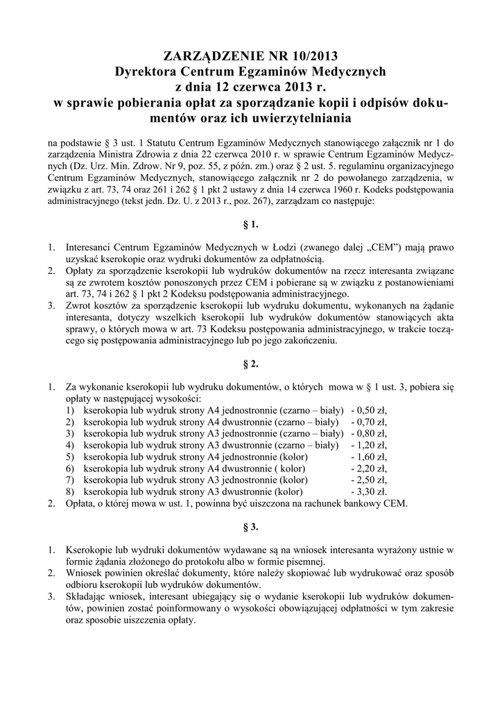 ZARZĄDZENIE NR 10/2013 Dyrektora Centrum Egzaminów Medycznych z dnia 12 czerwca 2013 r. w sprawie pobierania opłat za sporządzanie kopii i odpisów dokumentów oraz ich uwierzytelniania na podstawie § 3 ust. 1 Statutu Centrum Egzaminów Medycznych stanowiącego załącznik nr 1 do zarządzenia Ministra Zdrowia z dnia 22 czerwca 2010 r. w sprawie Centrum Egzaminów Medycznych (Dz. Urz. Min. Zdrow. Nr 9, poz. 55, z późn. zm.) oraz § 2 ust. 5. regulaminu organizacyjnego Centrum Egzaminów Medycznych, stanowiącego załącznik nr 2 do powołanego zarządzenia, w związku z art. 73, 74 oraz 261 i 262 § 1 pkt 2 ustawy z dnia 14 czerwca 1960 r. Kodeks podstępowania administracyjnego (tekst jedn. Dz. U. z 2013 r., poz. 267), zarządzam co następuje: § 1. 1. 2. 3. Interesanci Centrum Egzaminów Medycznych w Łodzi (zwanego dalej „CEM”) mają prawo uzyskać kserokopie oraz wydruki dokumentów za odpłatnością. Opłaty za sporządzenie kserokopii lub wydruków dokumentów na rzecz interesanta związane są ze zwrotem kosztów ponoszonych przez CEM i pobierane są w związku z postanowieniami art. 73, 74 i 262 § 1 pkt 2 Kodeksu podstępowania administracyjnego. Zwrot kosztów za sporządzenie kserokopii lub wydruku dokumentu, wykonanych na żądanie interesanta, dotyczy wszelkich kserokopii lub wydruków dokumentów stanowiących akta sprawy, o których mowa w art. 73 Kodeksu postępowania administracyjnego, w trakcie toczącego się postępowania administracyjnego lub po jego zakończeniu. § 2. 1. 2. Za wykonanie kserokopii lub wydruku dokumentów, o których mowa w § 1 ust. 3, pobiera się opłaty w następującej wysokości: 1) kserokopia lub wydruk strony A4 jednostronnie (czarno – biały) - 0,50 zł, 2) kserokopia lub wydruk strony A4 dwustronnie (czarno – biały) - 0,70 zł, 3) kserokopia lub wydruk strony A3 jednostronnie (czarno – biały) - 0,80 zł, 4) kserokopia lub wydruk strony A3 dwustronnie (czarno – biały) - 1,20 zł, 5) kserokopia lub wydruk strony A4 jednostronnie (kolor) - 1,60 zł, 6) kserokopia lub wydruk strony A4 dwustronnie ( kolor) - 2,20 zł, 7) kserokopia lub wydruk strony A3 jednostronnie (kolor) - 2,50 zł, 8) kserokopia lub wydruk strony A3 dwustronnie (kolor) - 3,30 zł. Opłata, o której mowa w ust. 1, powinna być uiszczona na rachunek bankowy CEM. § 3. 1. 2. 3. Kserokopie lub wydruki dokumentów wydawane są na wniosek interesanta wyrażony ustnie w formie żądania złożonego do protokołu albo w formie pisemnej. Wniosek powinien określać dokumenty, które należy skopiować lub wydrukować oraz sposób odbioru kserokopii lub wydruków dokumentów. Składając wniosek, interesant ubiegający się o wydanie kserokopii lub wydruków dokumentów, powinien zostać poinformowany o wysokości obowiązującej odpłatności w tym zakresie oraz sposobie uiszczenia opłaty. § 4. 1. 2. Po wpłynięciu wniosku, o którym mowa w § 3 ust. 1, referent prowadzący sprawę: 1) potwierdza uiszczenie opłaty za wykonanie kserokopii lub wydruku dokumentów na podstawie dowodu wpłaty, przedstawionego przez interesanta; 2) wyodrębnia z akt sprawy dokumenty przeznaczone do skopiowania lub wydruku; 3) wykonuje kserokopie lub wydruki dokumentów; 4) wydaje interesantowi kserokopie lub wydruki dokumentów za pisemnym potwierdzeniem odbioru, które dołącza do akt sprawy; 5) ponownie umieszcza dokumenty, o których mowa w pkt. 2, w aktach sprawy. Wydanie kserokopii lub wydruków dokumentów może nastąpić po wpłynięciu na rachunek bankowy CEM opłaty w ustalonej wysokości za wykonanie tych czynności. § 5. Stawki opłat, określone w § 3 ust. 1, stosuje się również w przypadku pobierania opłaty od informacji udostępnianych zgodnie z art. 15 ustawy z dnia 6 września 2001 r. o dostępie do informacji publicznej (Dz. U. Nr 112 poz. 1198, z późn. zm.). § 6. 1. 2. 3. 4. 5. Uwierzytelnienie na żądanie interesanta odpisów lub kopii akt sprawy lub wydanie mu z akt sprawy uwierzytelnionych odpisów podlega opłacie skarbowej zgodnie z częścią II poz. 4 załącznika do ustawy z dnia 16 listopada 2006 r. o opłacie skarbowej (tekst jedn. Dz. U. z 2012 r., poz. 1282, z późn. zm.). W przypadku wykonania kserokopii lub wydruków dokumentów za poświadczeniem za zgodność z oryginałem opłata skarbowa wynosi 5,00 zł za jedną stronę. Opłatę skarbową wnosi się na rachunek bankowy organu podatkowego właściwego miejscowo dla CEM – Prezydenta Miasta Łodzi lub uiszcza się w kasie Urzędu Miejskiego w Łodzi. W tytule opłaty interesant zamieszcza następującą informację: „CEM – opłata za kopię/wydruk dokumentów”. Przepisy § 3. i § 4. stosuje się odpowiednio. Uwierzytelnienie, o którym mowa w ust. 1, może nastąpić po przedstawieniu dowodu uiszczenia opłaty skarbowej w ustalonej wysokości za wykonanie tej czynności. § 7. 1. 2. Treść zarządzenia publikuje się na stronie internetowej CEM oraz w Biuletynie Informacji Publicznej CEM. Wykonanie zarządzenia powierza się Sekcji Księgowości i Kadr, Sekcji Egzaminów Medycznych oraz Sekretariatowi CEM. § 8. 3. Zarządzenie wchodzi w życie z dniem podpisania. ……………………….……………… Dyrektor Centrum Egzaminów Medycznych Łódź, dn. …………………………. 2
