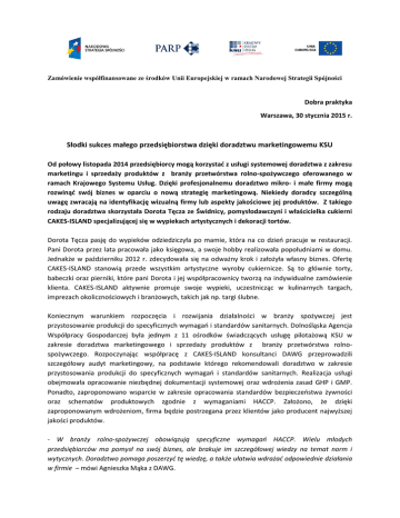 Zamówienie współfinansowane ze środków Unii Europejskiej w ramach Narodowej Strategii Spójności Dobra praktyka Warszawa, 30 stycznia 2015 r. Słodki sukces małego przedsiębiorstwa dzięki doradztwu marketingowemu KSU Od połowy listopada 2014 przedsiębiorcy mogą korzystać z usługi systemowej doradztwa z zakresu marketingu i sprzedaży produktów z branży przetwórstwa rolno-spożywczego oferowanego w ramach Krajowego Systemu Usług. Dzięki profesjonalnemu doradztwo mikro- i małe firmy mogą rozwinąć swój biznes w oparciu o nową strategię marketingową. Niekiedy doradcy szczególną uwagę zwracają na identyfikację wizualną firmy lub aspekty jakościowe jej produktów. Z takiego rodzaju doradztwa skorzystała Dorota Tęcza ze Świdnicy, pomysłodawczyni i właścicielka cukierni CAKES-ISLAND specjalizującej się w wypiekach artystycznych i dekoracji tortów. Dorota Tęcza pasję do wypieków odziedziczyła po mamie, która na co dzień pracuje w restauracji. Pani Dorota przez lata pracowała jako księgowa, a swoje hobby realizowała popołudniami w domu. Jednakże w październiku 2012 r. zdecydowała się na odważny krok i założyła własny biznes. Ofertę CAKES-ISLAND stanowią przede wszystkim artystyczne wyroby cukiernicze. Są to głównie torty, babeczki oraz pierniki, które pani Dorota i jej współpracownicy tworzą na indywidualne zamówienie klienta. CAKES-ISLAND aktywnie promuje swoje wypieki, uczestnicząc w kulinarnych targach, imprezach okolicznościowych i branżowych, takich jak np. targi ślubne. Koniecznym warunkiem rozpoczęcia i rozwijania działalności w branży spożywczej jest przystosowanie produkcji do specyficznych wymagań i standardów sanitarnych. Dolnośląska Agencja Współpracy Gospodarczej była jednym z 11 ośrodków świadczących usługę pilotażową KSU w zakresie doradztwa marketingowego i sprzedaży produktów z branży przetwórstwa rolnospożywczego. Rozpoczynając współpracę z CAKES-ISLAND konsultanci DAWG przeprowadzili szczegółowy audyt marketingowy, na podstawie którego rekomendowali doradztwo w zakresie przystosowania produkcji do specyficznych wymagań i standardów sanitarnych. Realizacja usługi obejmowała opracowanie niezbędnej dokumentacji systemowej oraz wdrożenia zasad GHP i GMP. Ponadto, zaproponowano wsparcie w zakresie opracowania standardów bezpieczeństwa żywności oraz schematów produktowych zgodnie z wymaganiami HACCP. Założono, że dzięki zaproponowanym wdrożeniom, firma będzie postrzegana przez klientów jako producent najwyższej jakości produktów. - W branży rolno-spożywczej obowiązują specyficzne wymagań HACCP. Wielu młodych przedsiębiorców ma pomysł na swój biznes, ale brakuje im szczegółowej wiedzy na temat norm i wytycznych. Doradztwo pomaga poszerzyć tę wiedzę, a także ułatwia wdrażać odpowiednie działania w firmie – mówi Agnieszka Mąka z DAWG. Zamówienie współfinansowane ze środków Unii Europejskiej w ramach Narodowej Strategii Spójności CAKE ISLAND reprezentuje właśnie taki przypadek. Firma specjalizująca się w artystycznych wyrobach nie miała najmniejszych problemów z linią wizualną. Logo i typografia nawiązują do produktów tworzonych przez panią Dorotę. Dlatego właśnie postanowiono skupić się na kwestiach jakościowych. To one są dziś gwarantem bezpieczeństwa produkowanych wyrobów cukierniczych firmy CAKESISLAND. - Debiut na tak konkurencyjnym rynku, jakim jest obecnie cukiernictwo artystyczne trochę mnie przerażał. Szczególnie, że to właśnie jakość wyrabianych przez nas produktów jest wizytówką CAKESISLAND. Dzięki pomocy doradców KSU, udało nam się bezproblemowo sprostać wszystkim wymaganiom sanepidu oraz kontynuować naszą działalność zgodnie z przepisami HACCP – mówi Dorota Tęcza. Usługa doradztwa marketingowego realizowana była jako program pilotażowy, z którego skorzystało kilkaset przedsiębiorstw z całej Polski. Po zakończeniu projektu, Polska Agencja Rozwoju Przedsiębiorczości przeprowadziła ewaluację usługi. Na podstawie uzyskanych wyników postanowiono rozpocząć ponowne świadczenie usługi, na zmienionych zasadach. Więcej informacji na temat doradztwa znajduje się pod adresem: http://ksu.parp.gov.pl/pl/oferta_ksu/doradztwomarketingowe-dla-branzy-przetworstwa-rolno-spozywczego