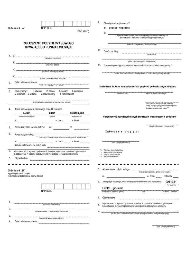 9. O d c i n e k „A” Obowiązkowi wojskowemu**) a) Nr PESEL Płeć M /K*) podlega – nie podlega b) (stopień wojskowy, nazwa, seria i nr wojskowego dokumentu osobistego lub poświadczenia o zgłoszeniu się do rejestracji przedpoborowych) ZGŁOSZENIE POBYTU CZASOWEGO TRWAJĄCEGO PONAD 3 MIESIĄCE (WKU, w której ewidencji osoba pozostaje) 10. 1. Dowód osobisty: seria i numer a) (nazwisko i imię/imiona) (przez kogo wydany oraz data waŜności) b) 11. (nazwisko rodowe) Dokument uprawniający do pobytu na terytorium RP oraz data przekroczenia granicy ***) c) (nazwiska i imiona poprzednie) (nazwa, seria i nr dokumentu, data wydania oraz oznaczenie organu wydającego) d) (imiona i nazwiska rodowe rodziców) 2. Data i miejsce urodzenia (rok 3. cywilny*): Stan 5. wdowiec – miesiąc 1. kawaler 2. panna 6. wdowa 7. rozwiedziony – dzień) Stwierdzam, Ŝe wyŜej wymieniona osoba przebywa pod wskazanym adresem: 3. Ŝonaty 4. zamęŜna 8. rozwiedziona (nazwisko i imię) (seria i nr dowodu osobistego) (imię i nazwisko małŜonka oraz jego nazwisko rodowe) 4. (data i podpis wynajmującego, najemcy, osoby, której przysługuje spółdzielcze prawo do lokalu lub właściciela lokalu****) Adres miejsca pobytu czasowego ponad 2 miesiące LUBIN Lubin (miejscowość-dzielnica) (gmina) ul. dolnośląskie (województwo) nr domu 5. Zamierzony czas trwania pobytu: 6. Adres pobytu stałego od Wiarygodność powyŜszych danych stwierdzam własnoręcznym podpisem: nr lokalu (data i podpis osoby meldującej się) do Zgłoszenie przyjęto: nr kodu pocztowego, miejscowość (dzielnica), gmina i województwo ul. data zameldowania na pobyt stały nr domu nr lokalu 7. Wykształcenie*): 1. wyŜsze 2. policealne 3. średnie 4. zasadnicze zawodowe 5. gimnazjalne 6. podstawowe 7. niepełne podstawowe lub nie podlega obowiązkowi szkolnemu 8. Obywatelstwo (data i podpis pracownika) *) **) ***) ****) 5. O d c i n e k „B” Właściwe otoczyć obwódką Nie dotyczy cudzoziemców Dotyczy cudzoziemców Niepotrzebne skreślić Adres miejsca pobytu stałego miejscowość (dzielnica), gmina i województwo wypełnia pracownik Urzędu (odcinek dla Urzędu miejsca pobytu stałego) ul. 6. nr lokalu nr domu Adres pobytu czasowego ponad 2 miesiące oraz zamierzony czas przebywania: 0211011 Kod terytorialny LUBIN Nr PESEL miejscowość (dzielnica i gmina) 7. 1. (nazwisko i imię/imiona) 8. (nazwisko rodowe i z poprzedniego małŜeństwa) 9. 2. gm.Lubin ulica nr domu nr lokalu Obywatelstwo Wykształcenie*): 1. wyŜsze 2. policealne 3. średnie 4. zasadnicze zawodowe 5. gimnazjalne 6. podstawowe 7. niepełne podstawowe lub nie podlega obowiązkowi szkolnemu (nazwa, seria i numer dokumentu stwierdzającego toŜsamość osoby meldującej się) 3. (imiona i nazwiska rodowe rodziców) 4. Data i miejsce urodzenia: (data i podpis pracownika)