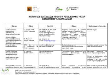 INSTYTUCJE ŚWIADCZĄCE POMOC W POSZUKIWANIU PRACY OSOBOM NIEPEŁNOSPRAWNYM Nazwa Fundacja Pomocy Matematykom i Informatykom Niesprawnym Ruchowo Centrum Edukacji i Aktywizacji Zawodowej Osób Niepełnosprawnych Oddział Fundacji Aktywizacja w Rzeszowie Portal dla osób niepełnosprawnych Polska Organizacja Pracodawców Osób Niepełnosprawnych Adres Kontakt ul. Twarda 51/55 00-818 Warszawa tel. 22 697 87 84, 654 75 51 fax.: 22 697 87 86 e-mail: [email protected] e-mail: [email protected] http://fpmiinr.org.pl Al. Rejtana 10 35-310 Rzeszów tel. 17 742 17 63 e-mail: [email protected] BTC Sp. z o.o. ul. Południowa 25 71-001 Szczecin ul. Legnicka 5 31-216 Kraków Oferta Programy edukacyjne w systemie zdalnym, mieszanym, stacjonarnym, pomoc finansowa, rzeczowa, psychologiczna, prawna, socjalna. Możliwość skorzystania z Agencji Doradztwa Zawodowego, Agencji Pośrednictwa Pracy http://idn.org.pl/ e-mail: [email protected] http://www.bezbarier.pl/ Centralna baza danych wykorzystywanych do poszukiwania pracy; oferty pracy Bezpłatne porady prawne dla osób niepełnosprawnych [email protected] http://www.popon.pl Pośrednictwo pracy, oferty pracy, Punkt Wsparcia Zawodowego Osób Niepełnosprawnych (wymagana rejestracja na stronie http://www.popon.pl/ ) Pomoc w zatrudnianiu osób niepełnosprawnych rekrutacja - tel. 508 113 203 e-mail: [email protected] Giełda pracy dla osób niepełnosprawnych Biuro Doradztwo i Kariera – pośrednictwo pracy dla osób Dodatkowe informacje ul. Bolesława Komorowskiego 12, tel. 12 421 32 41, e-mail: [email protected] Pomoc doradców zawodowych, psychologów, pośredników pracy, Źródła: w/w strony internetowe Sporządzono: aktualizacja lipiec 2014 r. Opracowano: Centrum Informacji i Planowania Kariery Zawodowej Wojewódzkiego Urzędu Pracy w Krakowie Biuro otwarte od poniedziałku do piątku w godzinach: 8.00- 16:00 niepełnosprawnych Powiatowe Urzędy Pracy; W Krakowie Grodzki Urząd Pracy (Dział Obsługi Osób Niepełnosprawnych) VI p., p. 706, 30-106 Kraków ul. Wąwozowa 34 31-752 Kraków www.wrzos.org.pl/dik Tel. 12 685 50 60 e-mail: [email protected] www.gupkrakow.pl (Dział Obsługi Osób Niepełnosprawnych, pokój nr 105 tel. 12 68 68 105) warsztaty dla osób niepełnosprawnych i ich rodzin Urząd przyznaje środki na: - podjęcie działalności gospodarczej, rolniczej albo wniesienie wkładu do spółdzielni socjalnej przez osobę niepełnosprawną. zwrot kosztów wyposażenia stanowiska pracy osoby niepełnosprawnej. - dofinansowanie do 50% odsetek na kredytu zaciągniętego kontynuowanie działalności przez osobę niepełnosprawną. - szkolenia -staże Źródła: w/w strony internetowe Sporządzono: aktualizacja lipiec 2014 r. Opracowano: Centrum Informacji i Planowania Kariery Zawodowej Wojewódzkiego Urzędu Pracy w Krakowie Szczegółowe informacje można uzyskać: w zakresie wydawania skierowań na staż osobom niepełnosprawnym w Dziale Obsługi Osób Niepełnosprawnych, pokój nr 105 lub tel. 12 68 68 105 w zakresie informacji i wydawania wniosków finansowanych ze środków PFRON w Dziale Obsługi Osób Niepełnosprawnych, pokój nr 103 lub tel. 12 68 68 103 w zakresie informacji i wydawania wniosków finansowanych ze środków FP w Referacie Programów Rynku Pracy pokój nr 215 lub tel. 12 68 68 215 - w zakresie skierowania na szkolenie w Referacie Organizacji Szkoleń, pokój 235 lub 236 oraz tel. 12 68 68 235, 12 68 68 236 w zakresie dotacjijednorazowych środków na podjęcie działalności gospodarczej, rolniczej lub spółdzielni socjalnej w Dziale Obsługi Osób Niepełnosprawnych, pokój nr 103 lub tel. 12 68 68 103 ul. 29 Listopada 130, 31- 406 Kraków tel. 12 415 86 85 e-mail: [email protected] www.pfron.org.pl Fundusz przeznacza środki na rehabilitację zawodową, społeczną oraz zatrudnianie osób niepełnosprawnych ul. Piastowska 32, 30-070 Kraków tel. 12 422 06 36 fax. 12 422 06 36 wew. 44 e-mail: [email protected] www.rops.krakow.pl Na stronie internetowej można znaleźć: zespoły ds. orzekania o niepełnosprawności - wykaz Zakładów Pracy Chronionej - placówki specjalne i integracyjne w Województwie Małopolskim dane teleadresowe instytucji działających na rzecz osób niepełnosprawnych i ich rodzin informatory dla osób niepełnosprawnych Stowarzyszenie Integracji oraz Aktywizacji Zawodowej i Społecznej Osób Niepełnosprawnych "Emaus" ul. Emaus 18 30-213 Kraków tel.: 12 427 05 05 e-mail: [email protected] Integracja i reintegracja zawodowa i społeczna osób zagrożonych wykluczeniem społecznym oraz promocja zatrudnienia i aktywizacja zawodowa osób pozostających bez pracy i zagrożonych zwolnieniem z pracy "Szansa" - Stowarzyszenie Integracyjne Aktywizacji Zawodowej i Społecznej Osób Niepełnosprawnych Os. Na Wzgórzach 44, 31-721 Kraków tel. 12 681 47 74 faks: 12 681 47 74 e-mail: [email protected] www.dobrypensjonat.pl Aktywizacja osób niepełnosprawnych w życiu zawodowym i społecznym, turnusy, spotkania integracyjne, turnusy rehabilitacyjne, organizacja rehabilitacji Fundacja Aktywnej Rehabilitacji Punkt Aktywizacji Zawodowej Dywizjonu 303 blok 66 pok. 25, 33 (XXX LO), 31-875 Kraków tel. 12 356 57 91, faks. 12 356 57 91 e-mail: [email protected] www.far.org.pl Poradnictwo zawodowe, kursy, staże, szkolenia, warsztaty, pomoc przy znalezieniu i utrzymaniu zatrudnienia, wsparcie pracodawców przy uzyskaniu ulg przysługujących z tytułu zatrudnienia Państwowy Fundusz Rehabilitacji Osób Niepełnosprawnych (PFRON) Regionalny Ośrodek Pomocy Społecznej (ROPS) Źródła: w/w strony internetowe Sporządzono: aktualizacja lipiec 2014 r. Opracowano: Centrum Informacji i Planowania Kariery Zawodowej Wojewódzkiego Urzędu Pracy w Krakowie Realizacja programu Wsparcie osób niepełnosprawnych ruchowo na rynku pracy III Dla osób z niepełnosprawnością ruchową w stopniu znacznym, osoby niepełnosprawnej lub umiarkowanym ze sprzężeniem Katolickie Stowarzyszenie Osób Niepełnosprawnych i Ich Przyja
