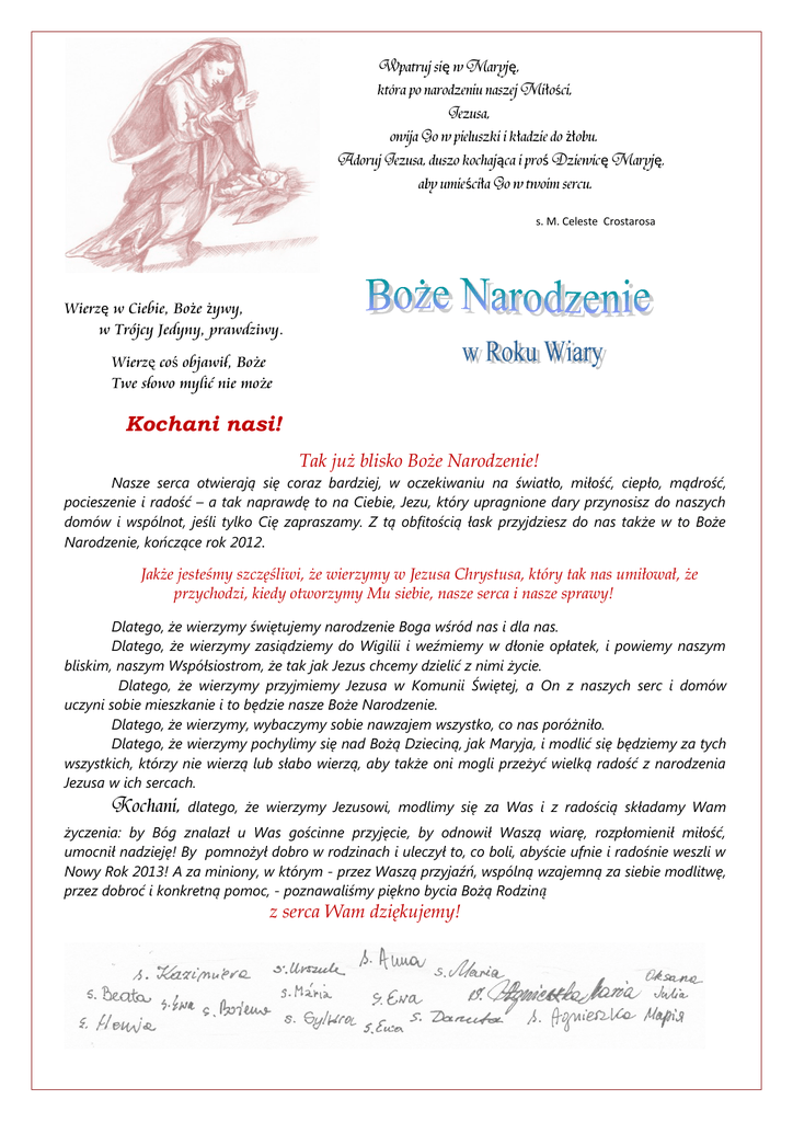 Wpatruj się w Maryję, która po narodzeniu naszej Miłości, Jezusa, owija Go w pieluszki i kładzie do żłobu. Adoruj Jezusa, duszo kochająca i proś Dziewicę Maryję, aby umieściła Go w twoim sercu. s. M. Celeste Crostarosa Wierzę w Ciebie, Boże żywy, w Trójcy Jedyny, prawdziwy. Wierzę coś objawił, Boże Twe słowo mylić nie może Kochani nasi! Tak już blisko Boże Narodzenie! Nasze serca otwierają się coraz bardziej, w oczekiwaniu na światło, miłość, ciepło, mądrość, pocieszenie i radość – a tak naprawdę to na Ciebie, Jezu, który upragnione dary przynosisz do naszych domów i wspólnot, jeśli tylko Cię zapraszamy. Z tą obfitością łask przyjdziesz do nas także w to Boże Narodzenie, kończące rok 2012 . Jakże jesteśmy szczęśliwi, że wierzymy w Jezusa Chrystusa, który tak nas umiłował, że przychodzi, kiedy otworzymy Mu siebie, nasze serca i nasze sprawy! Dlatego, że wierzymy świętujemy narodzenie Boga wśród nas i dla nas. Dlatego, że wierzymy zasiądziemy do Wigilii i weźmiemy w dłonie opłatek, i powiemy naszym bliskim, naszym Współsiostrom, że tak jak Jezus chcemy dzielić z nimi życie. Dlatego, że wierzymy przyjmiemy Jezusa w Komunii Świętej, a On z naszych serc i domów uczyni sobie mieszkanie i to będzie nasze Boże Narodzenie. Dlatego, że wierzymy, wybaczymy sobie nawzajem wszystko, co nas poróżniło. Dlatego, że wierzymy pochylimy się nad Bożą Dzieciną, jak Maryja, i modlić się będziemy za tych wszystkich, którzy nie wierzą lub słabo wierzą, aby także oni mogli przeżyć wielką radość z narodzenia Jezusa w ich sercach. Kochani, dlatego, że wierzymy Jezusowi, modlimy się za Was i z radością składamy Wam życzenia: by Bóg znalazł u Was gościnne przyjęcie, by odnowił Waszą wiarę, rozpłomienił miłość, umocnił nadzieję! By pomnożył dobro w rodzinach i uleczył to, co boli, abyście ufnie i radośnie weszli w Nowy Rok 2013! A za miniony, w którym - przez Waszą przyjaźń, wspólną wzajemną za siebie modlitwę, przez dobroć i konkretną pomoc, - poznawaliśmy piękno bycia Bożą Rodzin ą z serca Wam dziękujemy!