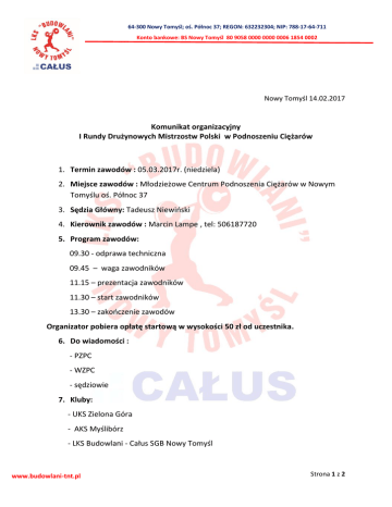 64-300 Nowy Tomyśl; oś. Północ 37; REGON: 632232304; NIP: 788-17-64-711 Konto bankowe: BS Nowy Tomyśl 80 9058 0000 0000 0006 1854 0002 Nowy Tomyśl 14.02.2017 Komunikat organizacyjny I Rundy Drużynowych Mistrzostw Polski w Podnoszeniu Ciężarów 1. Termin zawodów : 05.03.2017r. (niedziela) 2. Miejsce zawodów : Młodzieżowe Centrum Podnoszenia Ciężarów w Nowym Tomyślu oś. Północ 37 3. Sędzia Główny: Tadeusz Niewiński 4. Kierownik zawodów : Marcin Lampe , tel: 506187720 5. Program zawodów: 09.30 - odprawa techniczna 09.45 – waga zawodników 11.15 – prezentacja zawodników 11.30 – start zawodników 13.30 – zakończenie zawodów Organizator pobiera opłatę startową w wysokości 50 zł od uczestnika. 6. Do wiadomości : - PZPC - WZPC - sędziowie 7. Kluby: - UKS Zielona Góra - AKS Myślibórz - LKS Budowlani - Całus SGB Nowy Tomyśl www.budowlani-tnt.pl Strona 1 z 2 64-300 Nowy Tomyśl; oś. Północ 37; REGON: 632232304; NIP: 788-17-64-711 Konto bankowe: BS Nowy Tomyśl 80 9058 0000 0000 0006 1854 0002 www.budowlani-tnt.pl Strona 2 z 2