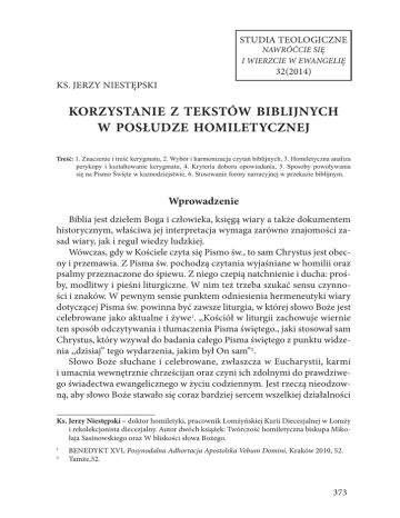 STUDIA TEOLOGICZNE NAWRÓĆCIE SIĘ I WIERZCIE W EWANGELIĘ 32(2014) KS. JERZY NIESTĘPSKI KORZYSTANIE Z TEKSTÓW BIBLIJNYCH W POSŁUDZE HOMILETYCZNEJ Treść: 1. Znaczenie i treść kerygmatu, 2. Wybór i harmonizacja czytań biblijnych, 3. Homiletyczna analiza perykopy i kształtowanie kerygmatu, 4. Kryteria doboru opowiadania, 5. Sposoby powoływania się na Pismo Święte w kaznodziejstwie, 6. Stosowanie formy narracyjnej w przekazie biblijnym. Wprowadzenie Biblia jest dziełem Boga i człowieka, księgą wiary a także dokumentem historycznym, właściwa jej interpretacja wymaga zarówno znajomości zasad wiary, jak i reguł wiedzy ludzkiej. Wówczas, gdy w Kościele czyta się Pismo św., to sam Chrystus jest obecny i przemawia. Z Pisma św. pochodzą czytania wyjaśniane w homilii oraz psalmy przeznaczone do śpiewu. Z niego czepią natchnienie i ducha: prośby, modlitwy i pieśni liturgiczne. W nim też trzeba szukać sensu czynności i znaków. W pewnym sensie punktem odniesienia hermeneutyki wiary dotyczącej Pisma św. powinna być zawsze liturgia, w której słowo Boże jest celebrowane jako aktualne i żywe1. ,,Kościół w liturgii zachowuje wiernie ten sposób odczytywania i tłumaczenia Pisma świętego., jaki stosował sam Chrystus, który wzywał do badania całego Pisma świętego z punktu widzenia ,,dzisiaj’’ tego wydarzenia, jakim był On sam”2. Słowo Boże słuchane i celebrowane, zwłaszcza w Eucharystii, karmi i umacnia wewnętrznie chrześcijan oraz czyni ich zdolnymi do prawdziwego świadectwa ewangelicznego w życiu codziennym. Jest rzeczą nieodzowną, aby słowo Boże stawało się coraz bardziej sercem wszelkiej działalności Ks. Jerzy Niestępski – doktor homiletyki, pracownik Łomżyńskiej Kurii Diecezjalnej w Łomży i rekolekcjonista diecezjalny. Autor dwóch książek: Twórczość homiletyczna biskupa Mikołaja Sasinowskiego oraz W bliskości słowa Bożego. 1 2 BENEDYKT XVI, Posynodalna Adhortacja Apostolska Vebum Domini, Kraków 2010, 52. Tamże,52. 373 Ks. Jerzy Niestępski kościelnej (EG 17, 4)3. Mając na względzie zasadę, że Pismo św. jest podstawowym źródłem przepowiadania, należy przybliżyć sposoby wykorzystania go do celów kaznodziejskich. Warto również wskazać zasady umiejętnego posługiwania się tekstem biblijnym w posłudze homiletycznej4. 1. Znaczenie i treść kerygmatu Sobór Watykański II w konstytucji o liturgii stawia wymaganie, aby treść orędzia homilijnego koncentrowała się wokół dobrej nowiny o zbawieniu w Jezusie Chrystusie. Istotne jest, aby w homilii nie przekazywać historycznego tylko znaczenia czytań biblijnych, lecz głosić wydarzenie Chrystusa jako obecną rzeczywistość czyli ukazywać kerygmat5. W homilii nie chodzi przede wszystkim o to, „jak” pewne fakty zbawcze przekazał autor natchniony, natomiast ważniejsze dla przepowiadania jest to ,,co’’ Bóg przez natchnionego autora, chce przekazać ludziom ,,tutaj’’ i ,,teraz’’6. Autor biblijny, przekazując Boże wezwanie, przedstawił je w taki sposób, by było zrozumiałe dla ludzi mu współczesnych. W ten sposób zbawcze treści Biblii zostały określone różnymi uwarunkowaniami historyczno - kulturowymi. Należy do nich zaliczyć język i styl oraz sposób wyrażania myśli i środowisko, w którym powstawały teksty Pisma św. Współcześnie te uwarunkowania zasadniczo uległy zmianie. Dlatego, orędzia zbawczego perykop biblijnych nie należy głosić własnymi słowami, ale raczej przekazywać to, ,,o co’’ chodziło Ewangelistom i innym autorom natchnionym7. Chodzi, zatem o przekaz orędzia zbawczego, zawartego w tekście, bez oprawy słownej, w której tekst został wyrażony8. Kaznodziejstwo ma być sztuką głoszenia słowa Bożego w duchu Pisma 3 4 5 6 7 8 FRANCISZEK, Adhortacja apostoska Ewangelii Gaudium, O głoszeniu Ewangelii w dzisiejszym świecie, Rzym, 23 listopada 2013, 174 J. TWARDY, Aktualizacja słowa Bożego w kaznodziejstwie, Przemyśl 2009, s. 120. W. PRZYCZYNA, Homilia pięćdziesiąt lat po Soborze Watykańskim II, Kraków 2013, s. 7375. W. PAZERA, Koncepcja homilii ewangelizacyjnej, dz. cyt., s. 167. H. SIMON, Przepowiadanie biblijne. W:J. Kudasiewicz (red), Biblia w nauczaniu chrześcijańskim, Lublin 1991, s. 63. W. PAZERA, Koncepcja homilii ewangelizacyjnej, dz. cyt., s. 168. 374 Korzystanie z tekstów biblijnych w posłudze homiletycznej św., którego autentyczne treści należy odczytywać w oparciu o współczesne zasady egzegezy historyczno - krytycznej. Egzegeza ta, choć jest konieczna w fazie przygotowania homilii to jednak pełni rolę pomocniczą. Ostateczną normę rozumienia perykopy oraz jej interpretacji stanowi żywa tradycja Kościoła9. Z pewnością, utracone w średniowieczu historiozbawcze podejście do Pisma św. w kaznodziejstwie, powraca w Kościele na fali odnowy kerygmatycznej. W tej odnowie eksponowana jest zbawcza treść orędzia biblijnego. Bóg Biblii jest Bogiem żywym, zbawiającym nas przez swego Syna w Duchu Świętym. Jego zbawczego orędzia zawartego w Piśmie św. nie można traktować jako historycznie minionego. Jeśli przepowiadanie rozumiemy jako urzeczywistnienie Kościoła w konkretnym momencie historii przez posługę słowa, to trzeba głosić to zbawcze orędzie w jego prawdziwym i niezafałszowanym brzmieniu. Przepowiadanie tego typu może zagwarantować jedynie całkowite wykorzystanie kerygmatu10. Ukazanie kerygmatu nie polega na nasyceniu homilii tekstami biblijnymi. Należy odrzucić pogląd, według którego im więcej cytatów z perykopy dnia, tym homilia jest bardziej biblijna. Można stwierdzić, że w takim właśnie ujęciu ukryty jest błąd. Bardzo często w homilii kaznodzieje używają w dosłownym brzmieniu sformułowań biblijnych jako argumentów na potwierdzenie, z góry przyjętej tezy dogmatycznej czy moralnej. Teksty biblijne, często zostają wówczas wyrwane ze swego kontekstu historiozbawczego. Dlatego w taki sp