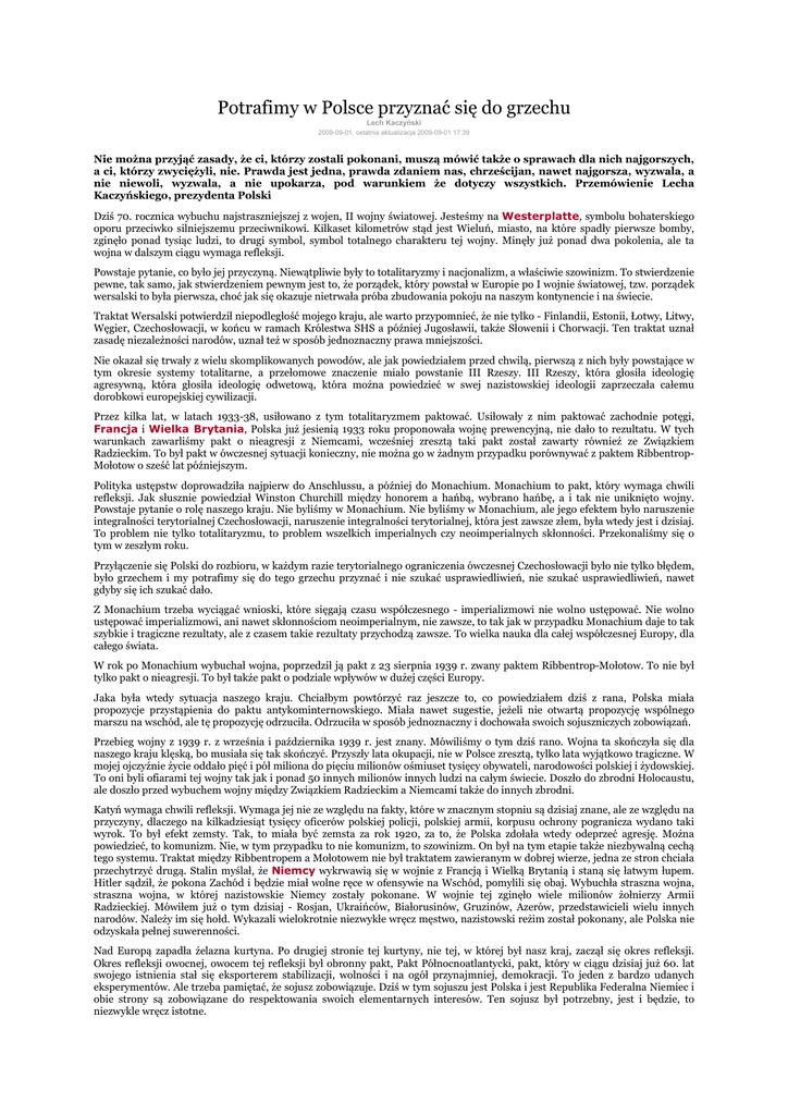 Potrafimy w Polsce przyznać się do grzechu Lech Kaczyński 2009-09-01, ostatnia aktualizacja 2009-09-01 17:39 Nie można przyjąć zasady, że ci, którzy zostali pokonani, muszą mówić także o sprawach dla nich najgorszych, a ci, którzy zwyciężyli, nie. Prawda jest jedna, prawda zdaniem nas, chrześcijan, nawet najgorsza, wyzwala, a nie niewoli, wyzwala, a nie upokarza, pod warunkiem że dotyczy wszystkich. Przemówienie Lecha Kaczyńskiego, prezydenta Polski Dziś 70. rocznica wybuchu najstraszniejszej z wojen, II wojny światowej. Jesteśmy na Westerplatte, symbolu bohaterskiego oporu przeciwko silniejszemu przeciwnikowi. Kilkaset kilometrów stąd jest Wieluń, miasto, na które spadły pierwsze bomby, zginęło ponad tysiąc ludzi, to drugi symbol, symbol totalnego charakteru tej wojny. Minęły już ponad dwa pokolenia, ale ta wojna w dalszym ciągu wymaga refleksji. Powstaje pytanie, co było jej przyczyną. Niewątpliwie były to totalitaryzmy i nacjonalizm, a właściwie szowinizm. To stwierdzenie pewne, tak samo, jak stwierdzeniem pewnym jest to, że porządek, który powstał w Europie po I wojnie światowej, tzw. porządek wersalski to była pierwsza, choć jak się okazuje nietrwała próba zbudowania pokoju na naszym kontynencie i na świecie. Traktat Wersalski potwierdził niepodległość mojego kraju, ale warto przypomnieć, że nie tylko - Finlandii, Estonii, Łotwy, Litwy, Węgier, Czechosłowacji, w końcu w ramach Królestwa SHS a później Jugosławii, także Słowenii i Chorwacji. Ten traktat uznał zasadę niezależności narodów, uznał też w sposób jednoznaczny prawa mniejszości. Nie okazał się trwały z wielu skomplikowanych powodów, ale jak powiedziałem przed chwilą, pierwszą z nich były powstające w tym okresie systemy totalitarne, a przełomowe znaczenie miało powstanie III Rzeszy. III Rzeszy, która głosiła ideologię agresywną, która głosiła ideologię odwetową, która można powiedzieć w swej nazistowskiej ideologii zaprzeczała całemu dorobkowi europejskiej cywilizacji. Przez kilka lat, w latach 1933-38, usiłowano z tym totalitaryzmem paktować. Usiłowały z nim paktować zachodnie potęgi, Francja i Wielka Brytania, Polska już jesienią 1933 roku proponowała wojnę prewencyjną, nie dało to rezultatu. W tych warunkach zawarliśmy pakt o nieagresji z Niemcami, wcześniej zresztą taki pakt został zawarty również ze Związkiem Radzieckim. To był pakt w ówczesnej sytuacji konieczny, nie można go w żadnym przypadku porównywać z paktem RibbentropMołotow o sześć lat późniejszym. Polityka ustępstw doprowadziła najpierw do Anschlussu, a później do Monachium. Monachium to pakt, który wymaga chwili refleksji. Jak słusznie powiedział Winston Churchill między honorem a hańbą, wybrano hańbę, a i tak nie uniknięto wojny. Powstaje pytanie o rolę naszego kraju. Nie byliśmy w Monachium. Nie byliśmy w Monachium, ale jego efektem było naruszenie integralności terytorialnej Czechosłowacji, naruszenie integralności terytorialnej, która jest zawsze złem, była wtedy jest i dzisiaj. To problem nie tylko totalitaryzmu, to problem wszelkich imperialnych czy neoimperialnych skłonności. Przekonaliśmy się o tym w zeszłym roku. Przyłączenie się Polski do rozbioru, w każdym razie terytorialnego ograniczenia ówczesnej Czechosłowacji było nie tylko błędem, było grzechem i my potrafimy się do tego grzechu przyznać i nie szukać usprawiedliwień, nie szukać usprawiedliwień, nawet gdyby się ich szukać dało. Z Monachium trzeba wyciągać wnioski, które sięgają czasu współczesnego - imperializmowi nie wolno ustępować. Nie wolno ustępować imperializmowi, ani nawet skłonnościom neoimperialnym, nie zawsze, to tak jak w przypadku Monachium daje to tak szybkie i tragiczne rezultaty, ale z czasem takie rezultaty przychodzą zawsze. To wielka nauka dla całej współczesnej Europy, dla całego świata. W rok po Monachium wybuchał wojna, poprzedził ją pakt z 23 sierpnia 1939 r. zwany paktem Ribbentrop-Mołotow. To nie był tylko pakt o nieagresji. To był także pakt o podziale wpływów w dużej części Europy. Jaka była wtedy sytuacja naszego kraju. Chciałbym powtórzyć raz jeszcze to, co powiedziałem dziś z rana, Polska miała propozycje przystąpienia do paktu antykominternowskiego. Miała nawet sugestie, jeżeli nie otwartą propozycję wspólnego marszu na wschód, ale tę propozycję odrzuciła. Odrzuciła w sposób jednoznaczny i dochowała swoich sojuszniczych zobowiązań. Przebieg wojny z 1939 r. z września i października 1939 r. jest znany. Mówiliśmy o tym dziś rano. Wojna ta skończyła się dla naszego kraju klęską, bo musiała się tak skończyć. Przyszły lata okupacji, nie w Polsce zresztą, tylko lata wyjątkowo tragiczne. W mojej ojczyźnie życie oddało pięć i pół miliona do pięciu milionów ośmiuset tysięcy obywateli, narodowości polskiej i żydowskiej. To oni byli ofiarami tej wojny tak jak i ponad 50 innych milionów innych ludzi na całym świecie. Doszło do zbrodni Holocaustu, ale doszło przed wybuchem wojny między Związkiem Radzieckim a Niemcami także do innych zbrodni. Katyń wymaga chwili refleksji. Wymaga jej nie ze względu na fakty, które w znacznym stopniu są dzisiaj znane, ale ze względu na przyczyny, dlaczego na kilkadziesiąt tysięcy oficerów polskiej policji, polskiej armii, korpusu ochrony pogranicza wydano taki wyrok. To był efekt zemsty. Tak, to miała być zemsta za rok 1920, za to, że Polska zdołała wtedy odeprzeć agresję. Można powiedzieć, to komunizm. Nie, w tym przypadku to nie komunizm, to szowinizm. On był na tym etapie także niezbywalną cechą tego systemu. Traktat między Ribbentropem a Mołotowem nie był traktatem zawieranym w dobrej wierze, jedna ze stron chciała przechytrzyć drugą. Stalin myślał, że Niemcy wykrwawią się w wojnie z Francją i Wielką Brytanią i staną się łatwym łupem. H