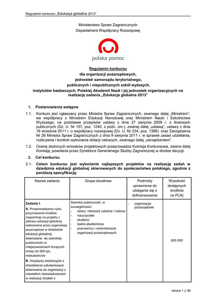 Regulamin konkursu „Edukacja globalna 2013” Ministerstwo Spraw Zagranicznych Departament Współpracy Rozwojowej Regulamin konkursu dla organizacji pozarządowych, jednostek samorządu terytorialnego, publicznych i niepublicznych szkół wyższych, instytutów badawczych, Polskiej Akademii Nauk i jej jednostek organizacyjnych na realizację zadania „Edukacja globalna 2013” 1. Postanowienia wstępne 1.1. Konkurs jest ogłaszany przez Ministra Spraw Zagranicznych, zwanego dalej „Ministrem”, we współpracy z Ministrem Edukacji Narodowej oraz Ministrem Nauki i Szkolnictwa Wyższego, na podstawie przepisów ustawy z dnia 27 sierpnia 2009 r. o finansach publicznych (Dz. U. Nr 157, poz. 1240, z późn. zm.), zwanej dalej „ustawą”, ustawy z dnia 16 września 2011 r. o współpracy rozwojowej (Dz. U. Nr 234, poz. 1386) oraz Zarządzenia Nr 26 Ministra Spraw Zagranicznych z dnia 9 sierpnia 2011 r. w sprawie zasad udzielania, rozliczania i kontroli wykonania dotacji celowych, zwanego dalej „zarządzeniem”. 1.2. Ocenę złożonych wniosków projektowych przeprowadza Komisja Konkursowa, zwana dalej Komisją, powołana przez Dyrektora Generalnego Służby Zagranicznej w drodze decyzji. 2. 2.1. Cel konkursu Celem konkursu jest wyłonienie najlepszych projektów na realizację zadań w dziedzinie edukacji globalnej skierowanych do społeczeństwa polskiego, zgodnie z poniższą specyfikacją: Nazwa zadania Zadanie I. A. Przeprowadzenie cyklu przyznawania środków (regranting) na projekty z zakresu edukacji globalnej realizowane przez organizacje pozarządowe w dziedzinie edukacji globalnej skierowane do szerokiej publiczności w miejscowościach liczących mniej niż 500 tys. mieszkańców Grupa docelowa Szeroka publiczność, w szczególności: dzieci, młodzież szkolna i rodzice nauczyciele studenci kadra akademicka pracownicy i wolontariusze organizacji pozarządowych Podmioty uprawnione do ubiegania się o dofinansowanie Wysokość dostępnych środków (w PLN) organizacje pozarządowe 650 000 B. Inicjatywy edukacyjne o charakterze szkoleniowym skierowane do organizacji z niewielkim doświadczeniem w realizacji działań z strona 1 z 36 Regulamin konkursu „Edukacja globalna 2013” dziedziny edukacji globalnej Zadanie II Edukacja globalna dla wszystkich - inicjatywy edukacyjne zwiększające świadomość szerokiej publiczności na temat problemów globalnych Szeroka publiczność, w tym kluczowe grupy docelowe dzieci, młodzież szkolna i rodzice nauczyciele studenci kadra akademicka liderzy opinii dziennikarze pracownicy i wolontariusze organizacji pozarządowych, w szczególności organizacji młodzieżowych Osoby i grupy zawodowe zaangażowane w działania z Inicjatywy edukacyjne w dziedziny edukacji globalnej w dziedzinie edukacji globalnej systemie edukacji formalnej, o charakterze systemowym z pozaformalnej i nieformalnej, m.in.: wyraźnym efektem dzieci, młodzież szkolna i rodzice multiplikacji nauczyciele dyrektorzy szkół/kadra zarządzająca placówkami oświatowymi studenci (w szczególności kierunków pedagogicznych) kadra akademicka dziennikarze wydawcy i autorzy podręczników pracownicy i wolontariusze organizacji pozarządowych Zadanie III Szeroka publiczność w tym w szczególności: Festiwal filmów o tematyce młodzież szkolna i studenci rozwojowej ze szczególnym nauczyciele uwzględnieniem pokazów kadra akademicka filmowych poza Warszawą dziennikarze oraz w przestrzeni publicznej liderzy opinii pracownicy i wolontariusze organizacji pozarządowych Zadanie IV Zadanie V Inicjatywy edukacyjne i informacyjne zwiększające zrozumienie i dostęp do informacji nt. współpracy rozwojowej Szeroka publiczność w tym w szczególności: nauczyciele kadra akademicka dziennikarze i pracownicy mediów, liderzy opinii pracownicy i wolontariusze organizacji pozarządowych - - - - - organizacje pozarządowe jednostki samorządu terytorialnego publiczne szkoły wyższe organizacje pozarządowe jednostki samorządu terytorialnego publiczne szkoły wyższe instytuty badawcze PAN i jednostki jej podległe organizacje pozarządowe jednostki samorządu terytorialnego publiczne szkoły wyższe 550 000 150 000 organizacje pozarządowe, publiczne szkoły wyższe, 100 000 Łącznie 2.2. 450 000 1 900 000 Dla potrzeb niniejszego konkursu przez „edukację globalną” rozumie się działania edukacyjne skierowane do polskiego społeczeństwa i nawiązujące do problemów i wyzwań rozwojowych na świecie. Jest to część kształcenia obywatelskiego i wychowania, która rozszerza ich zakres przez uświadamianie istnienia zjawisk i współzależności globalnych. strona 2 z 36 Regulamin konkursu „Edukacja globalna 2013” Jej głównym celem jest przygotowanie odbiorców do stawiania czoła wyzwaniom dotyczącym całej ludzkości. Przez współzależności należy rozumieć wzajemne powiązania i przenikanie systemów kulturowych, środowiskowych, ekonomicznych, społecznych, politycznych i technologicznych. Do aktualnych wyzwań globalnych zaliczyć można m.in.: zapewnienie pokoju i bezpieczeństwa na świecie, poprawę jakości życia w krajach Globalnego Południa, ochronę praw człowieka, zapewnienie zrównoważonego rozwoju, budowanie partnerskich relacji gospodarczych i społecznych pomiędzy krajami Globalnej Północy i Globalnego Południa. Szczególnie istotne w edukacji globalnej jest: tłumaczenie przyczyn i konsekwencji opisywanych zjawisk, przedstawianie perspektywy Globalnego Południa, rozumienie świata jako złożonego i dynamicznie zmieniającego się systemu, kształtowanie krytycznego myślenia i wpływ na zmianę postaw, przełamywanie istniejących stereotypów i uprzedzeń, ukazywanie wpływu jednostki na globalne procesy i wpływu globalnych procesów na jednostkę. 3. 3.1. Podmioty uprawnione do ubiegania się o dofinansowanie O przyznanie dofinansowania w ramach konkursu mogą się ubiegać: 3.1.1. zarejestrowane na terenie Rzeczypospolite
