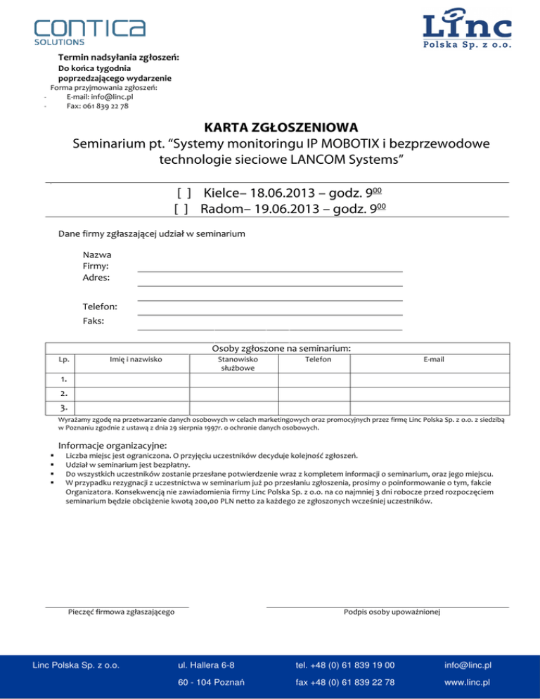 Termin nadsyłania zgłoszeń: Do końca tygodnia poprzedzającego wydarzenie - Forma przyjmowania zgłoszeń: E-mail: [email protected] Fax: 061 839 22 78 KARTA ZGŁOSZENIOWA Seminarium pt. “Systemy monitoringu IP MOBOTIX i bezprzewodowe technologie sieciowe LANCOM Systems” w [ ] Kielce– 18.06.2013 – godz. 900 [ ] Radom– 19.06.2013 – godz. 900 Dane firmy zgłaszającej udział w seminarium Nazwa Firmy: Adres: Telefon: Faks: Osoby zgłoszone na seminarium: Lp. Imię i nazwisko Stanowisko służbowe Telefon E-mail 1. 2. 3. Wyrażamy zgodę na przetwarzanie danych osobowych w celach marketingowych oraz promocyjnych przez firmę Linc Polska Sp. z o.o. z siedzibą w Poznaniu zgodnie z ustawą z dnia 29 sierpnia 1997r. o ochronie danych osobowych. Informacje organizacyjne: Liczba miejsc jest ograniczona. O przyjęciu uczestników decyduje kolejność zgłoszeń. Udział w seminarium jest bezpłatny. Do wszystkich uczestników zostanie przesłane potwierdzenie wraz z kompletem informacji o seminarium, oraz jego miejscu. W przypadku rezygnacji z uczestnictwa w seminarium już po przesłaniu zgłoszenia, prosimy o poinformowanie o tym, fakcie Organizatora. Konsekwencją nie zawiadomienia firmy Linc Polska Sp. z o.o. na co najmniej 3 dni robocze przed rozpoczęciem seminarium będzie obciążenie kwotą 200,00 PLN netto za każdego ze zgłoszonych wcześniej uczestników. Pieczęć firmowa zgłaszającego Linc Polska Sp. z o.o. Podpis osoby upoważnionej ul. Hallera 6-8 tel. +48 (0) 61 839 19 00 [email protected] 60 - 104 Poznań fax +48 (0) 61 839 22 78 www.linc.pl