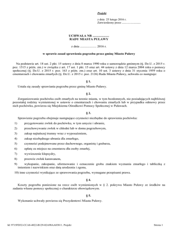 Projekt z dnia 25 lutego 2016 r. Zatwierdzony przez ......................... UCHWAŁA NR .................... RADY MIASTA PUŁAWY z dnia .................... 2016 r. w sprawie zasad sprawienia pogrzebu przez gminę Miasto Puławy Na podstawie art. 18 ust. 2 pkt. 15 ustawy z dnia 8 marca 1990 roku o samorządzie gminnym (tj. Dz.U. z 2015 r. poz. 1515 z późn. zm.) w związku z art. 17 ust. 1 pkt. 15 oraz art. 44 ustawy z dnia 12 marca 2004 roku o pomocy społecznej (tj. Dz.U. z 2015 r. poz. 163 z późn. zm.) oraz art. 10 ust. 3 ustawy z dnia 31 stycznia 1959 roku o cmentarzach i chowaniu zmarłych (tj. Dz.U. z 2015 r. poz. 2126) Rada Miasta Puławy, uchwala co następuje: § 1. Ustala się zasady sprawiania pogrzebu przez gminę Miasto Puławy. § 2. Zorganizowanie pochówku osób zmarłych na terenie miasta, w tym bezdomnych, nie posiadających najbliższej pozostałej rodziny wymienionej w ustawie o cmentarzach i chowaniu zmarłych lub w przypadku odmowy przez nich pochówku, powierza się Miejskiemu Ośrodkowi Pomocy Społecznej w Puławach. § 3. Sprawienie pogrzebu obejmuje następujące czynności niezbędne do sprawienia pochówku: 1) przygotowanie zwłok do pochówku, w tym umycie i ubranie, 2) przechowywanie zwłok w chłodni lub w domu pogrzebowym, 3) zakup najtańszej trumny wraz z wyposażeniem, 4) zakup niezbędnego ubrania dla zmarłego, 5) czynności podejmowane przez duchownego, organistę i grabarza, 6) opłatę za miejsce na cmentarzu dla osoby zmarłej, 7) wywieszenie klepsydry, 8) przewóz zwłok karawanem, 9) wykopanie, zakopanie, uformowanie i oznaczenie grobu znakiem wyznania zmarłego i tabliczką z imieniem i nazwiskiem oraz datą urodzenia i zgonu, 10) inne czynności wynikające ze sprawowania pogrzebu, wymagane przepisami prawa. § 4. Koszty pogrzebu poniesione na rzecz osób wymienionych w § 2. pokrywa Miasto Puławy ze środków na zadania własne pomocy społecznej o charakterze obowiązkowym. § 5. Wykonanie uchwały powierza się Prezydentowi Miasta Puławy. Id: 9715FD32-CCA8-4822-B129-02A98AA83811. Projekt Strona 1 § 6. Uchwała wchodzi w życie z dniem podjęcia. Przewodnicząca Rady Miasta Puławy Bożena Krygier Id: 9715FD32-CCA8-4822-B129-02A98AA83811. Projekt Strona 2 UZASADNIENIE Obowiązek sprawienia pochówku, w tym osób bezdomnych, jest zadaniem własnym gminy o charakterze obowiązkowym (art.17 ust.1, pkt. 15 ustawy o pomocy społecznej). Zaś art.44 cyt. ustawy stanowi, że sprawienie pogrzebu odbywa się w sposób ustalony przez gminę, zgodnie z wyznaniem zmarłego. Przekazanie do realizacji Miejskiego Ośrodka Pomocy Społecznej zadania: sprawienie pogrzebu uchwałą Rady Miasta Puławy z dnia 28 października 2010r. w sprawie nadania statutu Miejskiemu Ośrodkowi Pomocy Społecznej w Puławach jest niewystarczające. Dlatego też konieczne jest podjęcie niniejszej uchwały. Id: 9715FD32-CCA8-4822-B129-02A98AA83811. Projekt Strona 1