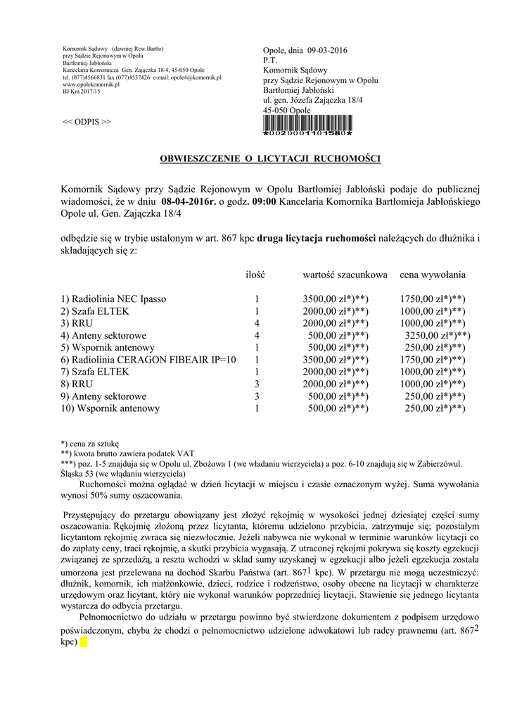 Komornik Sądowy (dawniej Rew.Bartło) przy Sądzie Rejonowym w Opolu Bartłomiej Jabłoński Kancelaria Komornicza Gen. Zajączka 18/4, 45-050 Opole tel. (077)4566831 fax (077)4537426 e-mail: [email protected] www.opolekomornik.pl BJ Km 2017/15 Opole, dnia 09-03-2016 P.T. Komornik Sądowy przy Sądzie Rejonowym w Opolu Bartłomiej Jabłoński ul. gen. Józefa Zajączka 18/4 45-050 Opole << ODPIS >> *0020001101580* OBWIESZCZENIE O LICYTACJI RUCHOMOŚCI Komornik Sądowy przy Sądzie Rejonowym w Opolu Bartłomiej Jabłoński podaje do publicznej wiadomości, że w dniu 08-04-2016r. o godz. 09:00 Kancelaria Komornika Bartłomieja Jabłońskiego Opole ul. Gen. Zajączka 18/4 odbędzie się w trybie ustalonym w art. 867 kpc druga licytacja ruchomości należących do dłużnika i składających się z: ilość 1) Radiolinia NEC Ipasso 2) Szafa ELTEK 3) RRU 4) Anteny sektorowe 5) Wspornik antenowy 6) Radiolinia CERAGON FIBEAIR IP=10 7) Szafa ELTEK 8) RRU 9) Anteny sektorowe 10) Wspornik antenowy 1 1 4 4 1 1 1 3 3 1 wartość szacunkowa cena wywołania 3500,00 zł*)**) 2000,00 zł*)**) 2000,00 zł*)**) 500,00 zł*)**) 500,00 zł*)**) 3500,00 zł*)**) 2000,00 zł*)**) 2000,00 zł*)**) 500,00 zł*)**) 500,00 zł*)**) 1750,00 zł*)**) 1000,00 zł*)**) 1000,00 zł*)**) 3250,00 zł*)**) 250,00 zł*)**) 1750,00 zł*)**) 1000,00 zł*)**) 1000,00 zł*)**) 250,00 zł*)**) 250,00 zł*)**) *) cena za sztukę **) kwota brutto zawiera podatek VAT ***) poz. 1-5 znajduja się w Opolu ul. Zbożowa 1 (we władaniu wierzyciela) a poz. 6-10 znajdują się w Zabierzówul. Śląska 53 (we włądaniu wierzyciela) Ruchomości można oglądać w dzień licytacji w miejscu i czasie oznaczonym wyżej. Suma wywołania wynosi 50% sumy oszacowania. Przystępujący do przetargu obowiązany jest złożyć rękojmię w wysokości jednej dziesiątej części sumy oszacowania. Rękojmię złożoną przez licytanta, któremu udzielono przybicia, zatrzymuje się; pozostałym licytantom rękojmię zwraca się niezwłocznie. Jeżeli nabywca nie wykonał w terminie warunków licytacji co do zapłaty ceny, traci rękojmię, a skutki przybicia wygasają. Z utraconej rękojmi pokrywa się koszty egzekucji związanej ze sprzedażą, a reszta wchodzi w skład sumy uzyskanej w egzekucji albo jeżeli egzekucja została umorzona jest przelewana na dochód Skarbu Państwa (art. 8671 kpc). W przetargu nie mogą uczestniczyć: dłużnik, komornik, ich małżonkowie, dzieci, rodzice i rodzeństwo, osoby obecne na licytacji w charakterze urzędowym oraz licytant, który nie wykonał warunków poprzedniej licytacji. Stawienie się jednego licytanta wystarcza do odbycia przetargu. Pełnomocnictwo do udziału w przetargu powinno być stwierdzone dokumentem z podpisem urzędowo poświadczonym, chyba że chodzi o pełnomocnictwo udzielone adwokatowi lub radcy prawnemu (art. 8672 kpc) Komornik w oparciu o art.18 ustawy z dnia 11 marca 2004r o podatku od towarów i usług (Dz.U. Nr 54, poz.535) wystawia faktury VAT. UWAGA: Licytacja może się nie odbyć bez podania przyczyny. Jeżeli drzwi będą zamknięte, będą otwierane na koszt i odpowiedzialność dłużnika. z upoważnienia Komornika Komornik Sądowy asesor Jacek Szczepaniec Bartłomiej Jabłoński Adresat oryginału: Milmex Systemy Komputerowe Sp. z o.o Do wiadomości: 1. Radca Prawny Anna Śladowska Kancelaria Prawnicza Maciej Panfil i Partnerzy sp. k., 02-017 Warszawa 2. Sąd Rejonowy W Opolu tablica ogłoszeń, 45-368 Opole 3. Urząd Miasta Opola tablica ogłoszeń, 45-015 Opole 4. Urząd Gminy Zabierzów, 32-080 Zabierzów 5. Komornik Sądowy przy Sądzie Rejonowym w Opolu Bartłomiej Jabłoński, 45-050 Opole 6. a/a