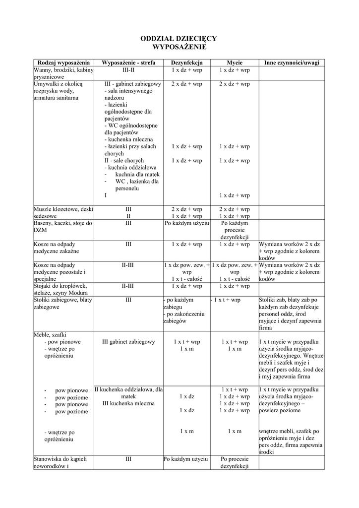ODDZIAŁ DZIECIĘCY WYPOSAŻENIE Rodzaj wyposażenia Wanny, brodziki, kabiny prysznicowe Umywalki z okolicą rozprysku wody, armatura sanitarna Wyposażenie - strefa III-II III - gabinet zabiegowy - sala intensywnego nadzoru - łazienki ogólnodostępne dla pacjentów - WC ogólnodostępne dla pacjentów - kuchenka mleczna - łazienki przy salach chorych II - sale chorych - kuchnia oddziałowa kuchnia dla matek WC , łazienka dla personelu I Dezynfekcja 1 x dz + wrp Mycie 1 x dz + wrp 2 x dz + wrp 2 x dz + wrp 1 x dz + wrp 1 x dz + wrp 1 x dz + wrp 1 x dz + wrp 1 x dz + wrp Muszle klozetowe, deski sedesowe Baseny, kaczki, słoje do DZM III II III 2 x dz + wrp 1 x dz + wrp Po każdym użyciu Kosze na odpady medyczne zakaźne III 1 x dz + wrp Kosze na odpady medyczne pozostałe i specjalne Stojaki do kroplówek, stelaże, szyny Modura Stoliki zabiegowe, blaty zabiegowe Meble, szafki - pow pionowe - wnętrze po opróżnieniu - pow pionowe pow poziome pow pionowe pow poziome II-III II-III III III gabinet zabiegowy II kuchenka oddziałowa, dla matek III kuchenka mleczna - wnętrze po opróżnieniu Stanowiska do kąpieli noworodków i III Inne czynności/uwagi 2 x dz + wrp 1 x dz + wrp Po każdym procesie dezynfekcji 1 x dz + wrp Wymiana worków 2 x dz + wrp zgodnie z kolorem kodów 1 x dz pow. zew. + 1 x dz pow. zew. + Wymiana worków 2 x dz wrp wrp + wrp zgodnie z kolorem 1 x t - całość 1 x t - całość kodów 1 x dz + wrp 1 x dz + wrp - po każdym - 1 x t + wrp zabiegu - po zakończeniu zabiegów 1 x t + wrp 1xm 1 x t + wrp 1xm 1 x dz 1 x t + wrp 1 x dz + wrp 1 x dz + wrp 1 x dz + wrp 1xm 1xm Po każdym użyciu Po procesie dezynfekcji 1 x dz Stoliki zab, blaty zab po każdym zab dezynfekuje personel oddz, środ myjące i dezynf zapewnia firma 1 x t mycie w przypadku użycia środka myjącodezynfekcyjnego. Wnętrze mebli i szafek myje i dezynf pers oddz, środ dez i myj zapewnia firma 1 x t mycie w przypadku użycia środka myjącodezynfekcyjnego – powierz poziome wnętrze mebli, szafek po opróżnieniu myje i dez pers oddz, firma zapewnia środki niemowląt, wagi lekarskie Ssaki Pojemniki urządzenia ssącego zawierające jednorazowe wkłady Dozowniki na mydło, ręczniki, papier toaletowy Łóżka III-II III Po każdym użyciu Po procesie Wg instrukcji szpitala zgodnie z dezynfekcji instrukcją dezynfekcji i mycie po użyciu ssaka Po wyjęciu Po wyjęciu wkładu. wkładu. I-III Przed kolejnym uzupełnieniem Po proc dezynf 1 x dz obudowa dozownika II Po wypisie pacjenta + wrp Stoliki przyłóżkowe II Miski do mycia pacjentów Wózki transportowe dla pacjentów (leżące) III 1 x dz + wrp blaty 1 x dz + wrp blaty po wypisie-całość po wypisie-całość Po każdym użyciu Po każdym użyciu Zwrócić uwagę na kółka i miejsca trudno dostępne (dezynfekcja) II 1 x dz + wrp 1 x dz + wrp III (kuchnia mleczna) II (kuchnia ogólna) III, II 2 x dz 2 x dz 1 x m + wrp III II I 1 x t + wrp wrp 2 x dz 2 x dz 1 x m + wrp 1 x dz powierzchnie zewnętrzne 1 x t + wrp 1 x t + wrp 1 x t + wrp klamki i okolice dotykowe drzwi II-III I 1 x dz + wrp 1 x dz + wrp 1 x dz Parapety II-III I 1 x dz + wrp 1 x dz + wrp 1 x dz Kaloryfery III II I II III II I-III 1xt wrp 1xt 1xt 1xt 1xt Zlewozmywaki Lodówka do żywności, leków Drzwi Listwy odbojowe Szafki, regały, stoliki, biurka, taborety, krzesła, fotele wrp 1 x t + wrp wrp Zwrócić uwagę na kółka i miejsca trudno dostępne (dezynfekcja) W przypadku użycia środka myjącodezynfekcyjnego 1 x m mycie. W salach chorych, korytarzu występują drzwi przeszklone W przypadku użycia środka myjącodezynfekcyjnego 1 x t mycie 1 x dz pow. poziome 1 x t pow. pionowe i pow. poziome trudno dostępne 1 x t meble Odkurzanie, zwrócenie tapicerowane uwagi na miejsca trudno dostępne Butelki i smoczki do karmienia III Aparaty telefoniczne II-III I II, I Lampy i urządzenia biurowe Lampy oświetleniowe sufitowe Lustra i osłony żarówek nad lustrami Okna i żaluzje Włączniki, wyłączniki, kontakty, gniazda, listwy, przedłużacze Kratki ściekowe syfony 2 x dz 14:00-15:00 1 x dz + wrp 1 x dz + wrp 1 x dz + wrp 1 x dz I-III 1 x k + wrp I-III 1 x dz III (gabinet zabiegowy) I-III I-III 1xm 1 x k + wrp 1xt Wyciągi wentylacyjne Pajęczyny Powierzchnie przeszklone w oddziale Dezynfekcja miejscowa doraźna. II-III I-III I-III II 1% roztwór sody. Umyć zgodnie z instrukcją obowiązującą w szpitalu. „Mycie i sterylizacja butelek po karmieniu” 1 x m + wrp Należy wlać środek dezynfekcyjny 1 x k + wrp Wrp omiatanie 1 x t + wrp