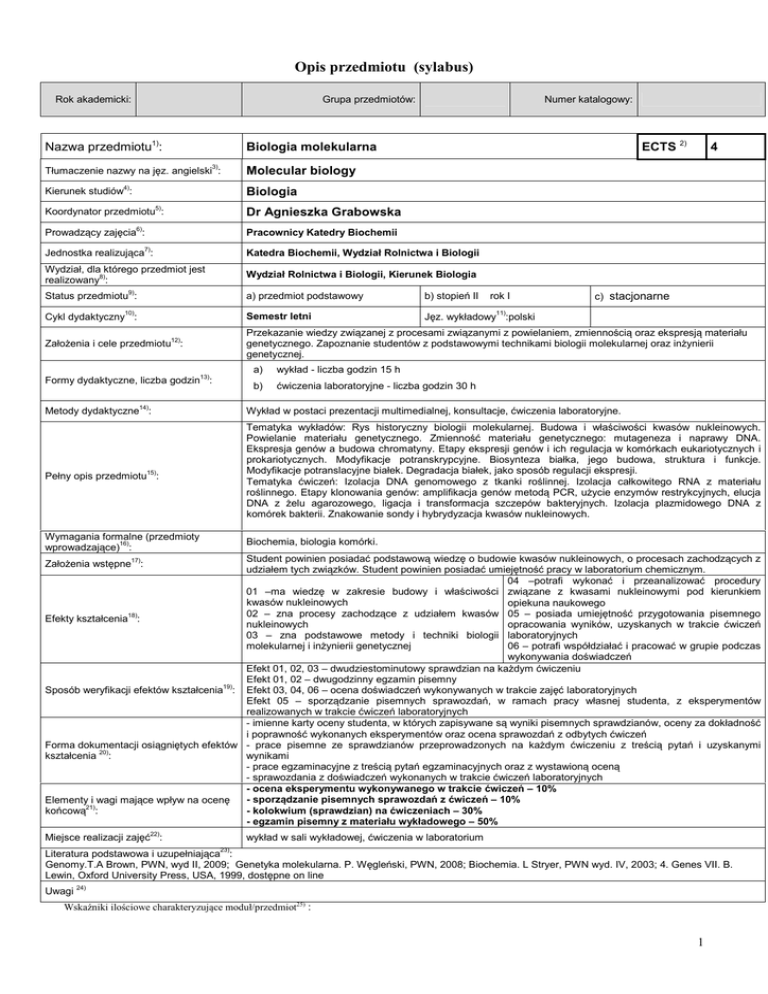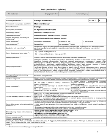 Opis przedmiotu (sylabus) Rok akademicki: Grupa przedmiotów: Nazwa przedmiotu1): Biologia molekularna Tłumaczenie nazwy na jęz. angielski3): Molecular biology Kierunek studiów4): Biologia 5) Koordynator przedmiotu : 6) Numer katalogowy: ECTS 2) Dr Agnieszka Grabowska Prowadzący zajęcia : Pracownicy Katedry Biochemii Jednostka realizująca7): Katedra Biochemii, Wydział Rolnictwa i Biologii Wydział, dla którego przedmiot jest realizowany8): Wydział Rolnictwa i Biologii, Kierunek Biologia Status przedmiotu9): a) przedmiot podstawowy 10) 4 b) stopień II rok I c) stacjonarne 11) Cykl dydaktyczny : Semestr letni Założenia i cele przedmiotu12): Przekazanie wiedzy związanej z procesami związanymi z powielaniem, zmiennością oraz ekspresją materiału genetycznego. Zapoznanie studentów z podstawowymi technikami biologii molekularnej oraz inżynierii genetycznej. Formy dydaktyczne, liczba godzin13): Jęz. wykładowy :polski a) wykład - liczba godzin 15 h b) ćwiczenia laboratoryjne - liczba godzin 30 h Metody dydaktyczne14): Wykład w postaci prezentacji multimedialnej, konsultacje, ćwiczenia laboratoryjne. Pełny opis przedmiotu15): Tematyka wykładów: Rys historyczny biologii molekularnej. Budowa i właściwości kwasów nukleinowych. Powielanie materiału genetycznego. Zmienność materiału genetycznego: mutageneza i naprawy DNA. Ekspresja genów a budowa chromatyny. Etapy ekspresji genów i ich regulacja w komórkach eukariotycznych i prokariotycznych. Modyfikacje potranskrypcyjne. Biosynteza białka, jego budowa, struktura i funkcje. Modyfikacje potranslacyjne białek. Degradacja białek, jako sposób regulacji ekspresji. Tematyka ćwiczeń: Izolacja DNA genomowego z tkanki roślinnej. Izolacja całkowitego RNA z materiału roślinnego. Etapy klonowania genów: amplifikacja genów metodą PCR, użycie enzymów restrykcyjnych, elucja DNA z żelu agarozowego, ligacja i transformacja szczepów bakteryjnych. Izolacja plazmidowego DNA z komórek bakterii. Znakowanie sondy i hybrydyzacja kwasów nukleinowych. Wymagania formalne (przedmioty wprowadzające)16): Biochemia, biologia komórki. Student powinien posiadać podstawową wiedzę o budowie kwasów nukleinowych, o procesach zachodzących z udziałem tych związków. Student powinien posiadać umiejętność pracy w laboratorium chemicznym. 04 –potrafi wykonać i przeanalizować procedury 01 –ma wiedzę w zakresie budowy i właściwości związane z kwasami nukleinowymi pod kierunkiem kwasów nukleinowych opiekuna naukowego 02 – zna procesy zachodzące z udziałem kwasów 05 – posiada umiejętność przygotowania pisemnego Efekty kształcenia18): nukleinowych opracowania wyników, uzyskanych w trakcie ćwiczeń 03 – zna podstawowe metody i techniki biologii laboratoryjnych 06 – potrafi współdziałać i pracować w grupie podczas molekularnej i inżynierii genetycznej wykonywania doświadczeń Efekt 01, 02, 03 – dwudziestominutowy sprawdzian na każdym ćwiczeniu Efekt 01, 02 – dwugodzinny egzamin pisemny 19) Sposób weryfikacji efektów kształcenia : Efekt 03, 04, 06 – ocena doświadczeń wykonywanych w trakcie zajęć laboratoryjnych Efekt 05 – sporządzanie pisemnych sprawozdań, w ramach pracy własnej studenta, z eksperymentów realizowanych w trakcie ćwiczeń laboratoryjnych - imienne karty oceny studenta, w których zapisywane są wyniki pisemnych sprawdzianów, oceny za dokładność i poprawność wykonanych eksperymentów oraz ocena sprawozdań z odbytych ćwiczeń Forma dokumentacji osiągniętych efektów - prace pisemne ze sprawdzianów przeprowadzonych na każdym ćwiczeniu z treścią pytań i uzyskanymi 20) kształcenia : wynikami - prace egzaminacyjne z treścią pytań egzaminacyjnych oraz z wystawioną oceną - sprawozdania z doświadczeń wykonanych w trakcie ćwiczeń laboratoryjnych - ocena eksperymentu wykonywanego w trakcie ćwiczeń – 10% - sporządzanie pisemnych sprawozdań z ćwiczeń – 10% Elementy i wagi mające wpływ na ocenę - kolokwium (sprawdzian) na ćwiczeniach – 30% końcową21): - egzamin pisemny z materiału wykładowego – 50% Założenia wstępne17): Miejsce realizacji zajęć22): wykład w sali wykładowej, ćwiczenia w laboratorium Literatura podstawowa i uzupełniająca23): Genomy.T.A Brown, PWN, wyd II, 2009; Genetyka molekularna. P. Węgleński, PWN, 2008; Biochemia. L Stryer, PWN wyd. IV, 2003; 4. Genes VII. B. Lewin, Oxford University Press, USA, 1999, dostępne on line Uwagi 24) Wskaźniki ilościowe charakteryzujące moduł/przedmiot25) : 1 Szacunkowa sumaryczna liczba godzin pracy studenta (kontaktowych i pracy własnej) niezbędna dla osiągnięcia zakładanych efektów kształcenia18) - na tej podstawie należy wypełnić pole ECTS2: 96 h Łączna liczba punktów ECTS, którą student uzyskuje na zajęciach wymagających bezpośredniego udziału nauczycieli akademickich: 2.5 ECTS Łączna liczba punktów ECTS, którą student uzyskuje w ramach zajęć o charakterze praktycznym, takich jak zajęcia laboratoryjne, projektowe, itp.: 2 ECTS Tabela zgodności kierunkowych efektów kształcenia efektami przedmiotu 26) Nr /symbol efektu 01 Wymienione w wierszu efekty kształcenia: Odniesienie do efektów dla programu kształcenia na kierunku K_W01 ma wiedzę w zakresie budowy i właściwości kwasów nukleinowych 02 zna procesy zachodzące z udziałem kwasów nukleinowych K_W01 03 zna podstawowe metody i techniki biologii molekularnej i inżynierii genetycznej K_U01 04 potrafi wykonać i przeanalizować procedury związane z kwasami nukleinowymi pod K_U04 kierunkiem opiekuna naukowego 05 posiada umiejętność przygotowania pisemnego opracowania wyników, uzyskanych w K_U06, trakcie ćwiczeń laboratoryjnych 06 potrafi współdziałać i pracować w grupie podczas wykonywania doświadczeń K_K02, K_K05 2