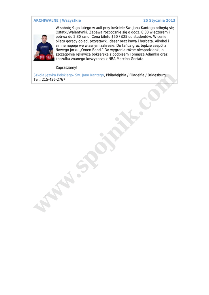 ARCHIWALNE | Wszystkie 25 Stycznia 2013 W sobotę 9-go lutego w auli przy kościele Św. Jana Kantego odbędą się Ostatki/Walentynki. Zabawa rozpocznie się o godz. 8:30 wieczorem i potrwa do 2:30 rano. Cena biletu $50 / $25 od studentów. W cenie biletu gorący obiad, przystawki, deser oraz kawa i herbata. Alkohol i zimne napoje we własnym zakresie. Do tańca grać będzie zespół z Nowego Jorku „Omen Band.” Do wygrania różne niespodzianki, a szczególnie rękawica bokserska z podpisem Tomasza Adamka oraz koszulka znanego koszykarza z NBA Marcina Gortata. Zapraszamy! w w w .s po jn ik .c o m Szkoła Języka Polskiego- Św. Jana Kantego, Philadelphia / Filadelfia / Bridesburg Tel.: 215-426-2767