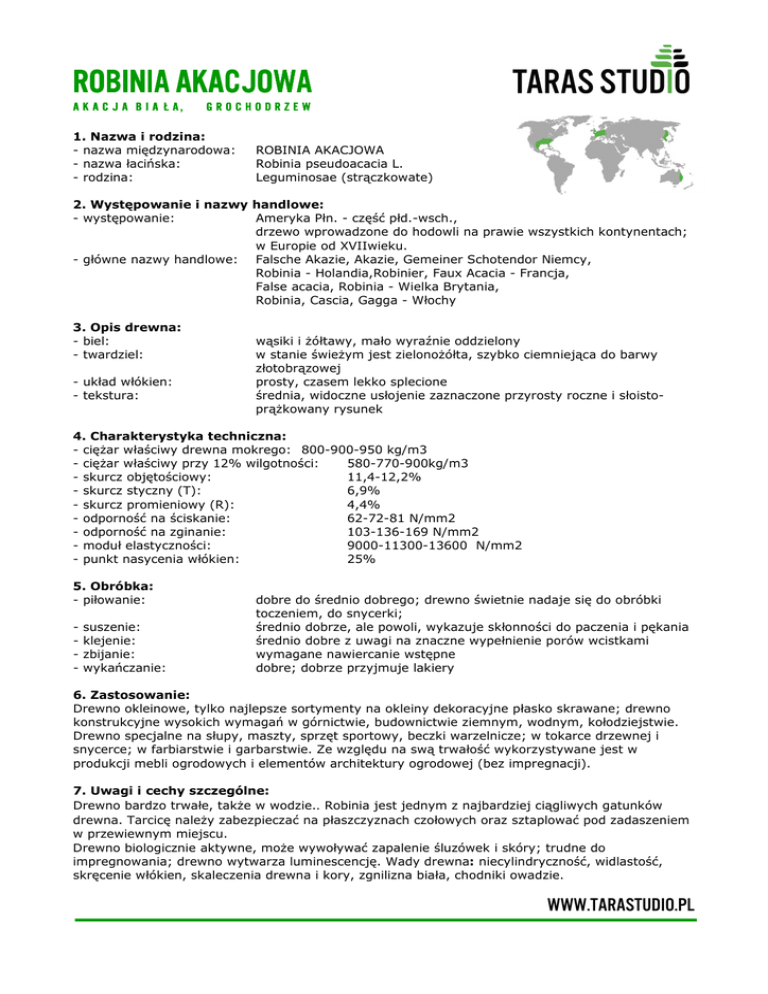 ROBINIA AKACJOWA A K A C J A B I A ł A, GROCHODRZEW 1. Nazwa i rodzina: - nazwa międzynarodowa: - nazwa łacińska: - rodzina: ROBINIA AKACJOWA Robinia pseudoacacia L. Leguminosae (strączkowate) 2. Występowanie i nazwy handlowe: - występowanie: Ameryka Płn. - część płd.-wsch., drzewo wprowadzone do hodowli na prawie wszystkich kontynentach; w Europie od XVIIwieku. - główne nazwy handlowe: Falsche Akazie, Akazie, Gemeiner Schotendor Niemcy, Robinia - Holandia,Robinier, Faux Acacia - Francja, False acacia, Robinia - Wielka Brytania, Robinia, Cascia, Gagga - Włochy 3. Opis drewna: - biel: - twardziel: - układ włókien: - tekstura: wąsiki i żółtawy, mało wyraźnie oddzielony w stanie świeżym jest zielonożółta, szybko ciemniejąca do barwy złotobrązowej prosty, czasem lekko splecione średnia, widoczne usłojenie zaznaczone przyrosty roczne i słoistoprążkowany rysunek 4. Charakterystyka techniczna: - ciężar właściwy drewna mokrego: 800-900-950 kg/m3 - ciężar właściwy przy 12% wilgotności: 580-770-900kg/m3 - skurcz objętościowy: 11,4-12,2% - skurcz styczny (T): 6,9% - skurcz promieniowy (R): 4,4% - odporność na ściskanie: 62-72-81 N/mm2 - odporność na zginanie: 103-136-169 N/mm2 - moduł elastyczności: 9000-11300-13600 N/mm2 - punkt nasycenia włókien: 25% 5. Obróbka: - piłowanie: - suszenie: klejenie: zbijanie: wykańczanie: dobre do średnio dobrego; drewno świetnie nadaje się do obróbki toczeniem, do snycerki; średnio dobrze, ale powoli, wykazuje skłonności do paczenia i pękania średnio dobre z uwagi na znaczne wypełnienie porów wcistkami wymagane nawiercanie wstępne dobre; dobrze przyjmuje lakiery 6. Zastosowanie: Drewno okleinowe, tylko najlepsze sortymenty na okleiny dekoracyjne płasko skrawane; drewno konstrukcyjne wysokich wymagań w górnictwie, budownictwie ziemnym, wodnym, kołodziejstwie. Drewno specjalne na słupy, maszty, sprzęt sportowy, beczki warzelnicze; w tokarce drzewnej i snycerce; w farbiarstwie i garbarstwie. Ze względu na swą trwałość wykorzystywane jest w produkcji mebli ogrodowych i elementów architektury ogrodowej (bez impregnacji). 7. Uwagi i cechy szczególne: Drewno bardzo trwałe, także w wodzie.. Robinia jest jednym z najbardziej ciągliwych gatunków drewna. Tarcicę należy zabezpieczać na płaszczyznach czołowych oraz sztaplować pod zadaszeniem w przewiewnym miejscu. Drewno biologicznie aktywne, może wywoływać zapalenie śluzówek i skóry; trudne do impregnowania; drewno wytwarza luminescencję. Wady drewna: niecylindryczność, widlastość, skręcenie włókien, skaleczenia drewna i kory, zgnilizna biała, chodniki owadzie. www.tarastudio.pl