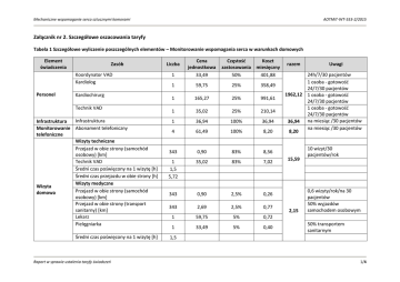 Mechaniczne wspomaganie serca sztucznymi komorami AOTMiT-WT-553-2/2015 Załącznik nr 2. Szczegółowe oszacowania taryfy Tabela 1 Szczegółowe wyliczenie poszczególnych elementów – Monitorowanie wspomagania serca w warunkach domowych Element świadczenia Zasób Koordynator VAD Kardiolog Personel Kardiochirurg Technik VAD Infrastruktura Infrastruktura Monitorowanie Abonament telefoniczny telefoniczne Wizyty techniczne Przejazd w obie strony (samochód osobowy) [km] Technik VAD Średni czas poświęcony na 1 wizytę [h] Średni czas przejazdu w obie strony [h] Wizyty medyczne Wizyta Przejazd w obie strony (samochód domowa osobowy) [km] Przejazd w obie strony (transport sanitarny) [km] Lekarz Pielęgniarka Średni czas poświęcony na 1 wizytę [h] Raport w sprawie ustalenia taryfy świadczeń 1 Cena jednostkowa 33,49 1 59,75 25% 358,49 1 165,27 25% 991,61 1 35,02 25% 210,14 1 36,94 100% 36,94 4 61,49 100% 8,20 343 0,90 83% 8,56 1 1,5 5,72 35,02 83% 7,02 343 0,90 2,5% 0,26 343 2,69 2,5% 0,77 1 59,75 5% 0,72 1 33,49 5% 0,40 Liczba Częstość Koszt zastosowania miesięczny 50% 401,88 razem Uwagi 24h/7/30 pacjentów 1 osoba - gotowość 24/7/30 pacjentów 1962,12 1 osoba - gotowość 24/7/30 pacjentów 1 osoba - gotowość 24/7/30 pacjentów 36,94 na miesiąc /30 pacjentów na miesiąc /30 pacjentów 8,20 15,59 2,15 10 wizyt/30 pacjentów/rok 0,6 wizyty/rok/na 30 pacjentów 50% wyjazdów samochodem osobowym 50% transportem sanitarnym 1,5 1/4 Mechaniczne wspomaganie serca sztucznymi komorami Element świadczenia Wyjazd do operacji Wyroby medyczne AOTMiT-WT-553-2/2015 Zasób Liczba Średni czas przejazdu w obie strony [h] Przejazd w obie strony (samochód osobowy) [km] Lekarz Technik VAD Czas trwania Paski do INR Analizator INR Opatrunek miejsca zabezpieczenia Gaziki jałowe 5,72 Cena jednostkowa Częstość Koszt zastosowania miesięczny 343 0,90 0,48% 1,48 1 1 9,72 45 1 12 12 165,27 35,02 0,48% 0,48% 7,69 1,63 10,91 47,92 14,31 1,36 100% 100% 100% 100% 490,95 47,92 171,72 16,32 Razem razem Uwagi 10,80 726,91 45 sztuk / 30 dni dzierżawa/zakup 1 sztuka/na 2,5 dnia 1 sztuka/na 2,5 dnia 2 763 Tabela 2 Szczegółowe wyliczenie poszczególnych elementów – Kontrola w trybie ambulatoryjnym pacjentów, u których zastosowano pompy implantowalne Element świadczenia Infrastruktura Personel [h] Konsultacje medyczne Zasób Gabinet zabiegowy Kardiolog Kardiochirurg Koordynator VAD Pielęgniarka Technik VAD Konsultacja Psychiatryczna Konsultacja Laryngologiczna Konsultacja Neurologiczna Konsultacja Gastroenterologiczna Raport w sprawie ustalenia taryfy świadczeń Liczba 1 2 1 2 1 1 0,5 0,5 0,5 0,5 Częstość Cena zastosowania jednostkowa 100% 100% 100% 100% 100% 100% 30% 30% 30% 30% 54,94 59,75 165,27 33,49 27,33 35,02 51,56 66,08 62,65 56,49 Koszt Razem 54,94 119,50 165,27 66,98 27,33 35,02 7,73 9,91 9,40 8,47 54,94 414,09 62,62 2/4 Mechaniczne wspomaganie serca sztucznymi komorami Element świadczenia Procedury medyczne Inne AOTMiT-WT-553-2/2015 Zasób Konsultacja Dermatologiczna Konsultacja Pulmonologiczna Konsultacja Nefrologiczna Badania laboratoryjne Diagnostyka nielaboratoryjna Zakwaterowanie do wizyty kontrolnej Liczba 0,5 0,5 0,5 1 1 1 Częstość Cena zastosowania jednostkowa 30% 30% 30% 100% 100% 43% 46,23 70,24 64,18 513,64 284,51 156 Koszt Razem 6,93 10,54 9,63 513,64 798,15 284,51 66,9 66,9 Razem 1396,66 Tabela 3 Szczegółowe wyliczenie poszczególnych elementów – hospitalizacja chorego niepowikłanego (kontrolna) Czas Częstość Cena Element świadczenia Zasób hospitalizacji Liczba zastosowania jednostkowa [dni] Oddział kardiochirurgiczny Osobodzień 3 100% 880,57 Badania laboratoryjne 1 100% 479,11 Procedury medyczne Badaniea obrazowe, diagnostyczne 1 100% 841,97 Opatrunki stabilizujące linię 1,2 100% 14,31 Gazik jałowe Wyroby medyczne 1,2 100% 1,36 Paski do INR 3 4,50 100% 10,91 Pakiet leków związanych z pompami Leki 3 100% 18,66 Kontrola ICD, CRT-D, BIV 1 77% 51,5 Konsultacje medyczne 1 100% 125,23 Inne Test wysiłkowy na bieżni z zużyciem tlenu 1 30% 113,91 VO2 Koszt 2641,71 479,11 841,97 17,17 1,63 49,10 55,99 39,86 125,23 34,17 Razem 4285,94 Raport w sprawie ustalenia taryfy świadczeń 3/4 Mechaniczne wspomaganie serca sztucznymi komorami Tabela 4 Szczegółowe wyliczenie poszczególnych elementów – hospitalizacja chorego niepowikłanego (kontrolna) Czas Częstość Element świadczenia Zasób hospitalizacji Liczba zastosowania [dni] Oddział kardiochirurgiczny Osobodzień 6,5 100% Badania laboratoryjne 1 100% Procedury medyczne Badania obrazowe, diagnostyczne 1 100% Pakiet leków związanych z pompami Leki 1 100% Opatrunki stabilizujące linię 2,6 100% Gazik jałowe 2,6 100% Wyroby medyczne 6,5 Paski do INR 9,75 100% Konsultacja neurologiczna 1 30% Konsultacja gastroenterologiczna 1 30% Inne Kontrola techniczna pompy + szkolenie 3,3 100% przypominające Kontrola ICD, CRT-D, BIV 1 77% Raport w sprawie ustalenia taryfy świadczeń AOTMiT-WT-553-2/2015 Cena jednostkowa Koszt 880,57 479,11 841,97 121,32 14,31 1,36 8,32 66,08 62,65 5723,70 479,11 841,97 121,32 37,21 3,536 81,12 19,82 18,80 35,02 113,83 51,5 39,86 Razem 7480,26 4/4