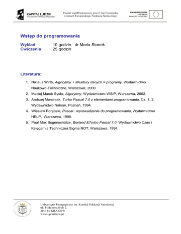 Projekt współfinansowany przez Unię Europejską w ramach Europejskiego Funduszu Społecznego Wstęp do programowania Wykład Ćwiczenia 10 godzin dr Maria Stanek 25 godzin Literatura: 1. Niklaus Wirth, Algorytmy + struktury danych = programy, Wydawnictwo Naukowo-Techniczne, Warszawa, 2000. 2. Maciej Marek Sysło, Algorytmy, Wydawnictwo WSIP, Warszawa, 2002. 3. Andrzej Marciniak, Turbo Pascal 7.0 z elementami programowania. Cz. 1, 2, Wydawnictwo Nakom, Poznań, 1994. 4. Wiesław Porębski, Pascal : wprowadzenie do programowania, Wydawnictwo HELP, Warszawa, 1996. 5. Paul Max Bogenschütze, Borland &Turbo Pascal 7.0, Wydawnictwo Czas i Księgarnia Techniczna Sigma NOT, Warszawa, 1994. Uniwersytet Pedagogiczny im. Komisji Edukacji Narodowej ul. PodchorąŜych 2, 30-084 KRAKÓW www.up.krakow.pl