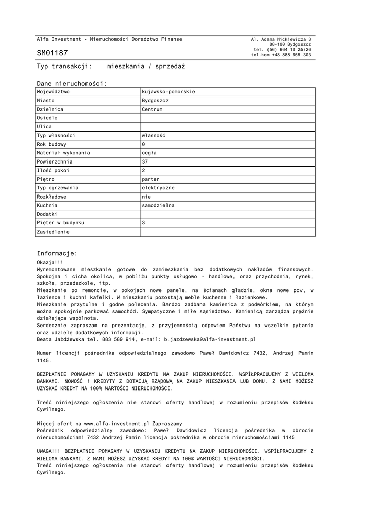 Alfa Investment - Nieruchomości Doradztwo Finanse SM01187 Typ transakcji: Al. Adama Mickiewicza 3 88-100 Bydgoszcz tel. (56) 664 10 25/26 tel.kom +48 888 658 303 mieszkania / sprzedaż Dane nieruchomości: Województwo kujawsko-pomorskie Miasto Bydgoszcz Dzielnica Centrum Osiedle Ulica Typ własności własność Rok budowy 0 Materiał wykonania cegła Powierzchnia 37 Ilość pokoi 2 Piętro parter Typ ogrzewania elektryczne Rozkładowe nie Kuchnia samodzielna Dodatki Pięter w budynku 3 Zasiedlenie Informacje: Okazja!!! Wyremontowane mieszkanie gotowe do zamieszkania bez dodatkowych nakładów finansowych. Spokojna i cicha okolica, w pobliżu punkty usługowo - handlowe, oraz przychodnia, rynek, szkoła, przedszkole, itp. Mieszkanie po remoncie, w pokojach nowe panele, na ścianach gładzie, okna nowe pcv, w łazience i kuchni kafelki. W mieszkaniu pozostają meble kuchenne i łazienkowe. Mieszkanie przytulne i godne polecenia. Bardzo zadbana kamienica z podwórkiem, na którym można spokojnie parkować samochód. Sympatyczne i miłe sąsiedztwo. Kamienicą zarządza prężnie działająca wspólnota. Serdecznie zapraszam na prezentację, z przyjemnością odpowiem Państwu na wszelkie pytania oraz udzielę dodatkowych informacji. Beata Jażdżewska tel. 883 589 914, e-mail: [email protected] Numer licencji pośrednika odpowiedzialnego zawodowo Paweł Dawidowicz 7432, Andrzej Pamin 1145. BEZPŁATNIE POMAGAMY W UZYSKANIU KREDYTU NA ZAKUP NIERUCHOMOŚCI. WSPÓŁPRACUJEMY Z WIELOMA BANKAMI. NOWOŚĆ ! KREDYTY Z DOTACJĄ RZĄDOWĄ NA ZAKUP MIESZKANIA LUB DOMU. Z NAMI MOŻESZ UZYSKAĆ KREDYT NA 100% WARTOŚCI NIERUCHOMOŚCI. Treść niniejszego ogłoszenia nie stanowi oferty handlowej w rozumieniu przepisów Kodeksu Cywilnego. Więcej ofert na www.alfa-investment.pl Zapraszamy Pośrednik odpowiedzialny zawodowo: Paweł Dawidowicz licencja pośrednika w obrocie nieruchomościami 7432 Andrzej Pamin licencja pośrednika w obrocie nieruchomościami 1145 UWAGA!!! BEZPŁATNIE POMAGAMY W UZYSKANIU KREDYTU NA ZAKUP NIERUCHOMOŚCI. WSPÓŁPRACUJEMY Z WIELOMA BANKAMI. Z NAMI MOŻESZ UZYSKAĆ KREDYT NA 100% WARTOŚCI NIERUCHOMOŚCI. Treść niniejszego ogłoszenia nie stanowi oferty handlowej w rozumieniu przepisów Kodeksu Cywilnego. Cena: 119 000 PLN Dokument wygenerowany ze strony www.alfa-investment.pl Strona 2