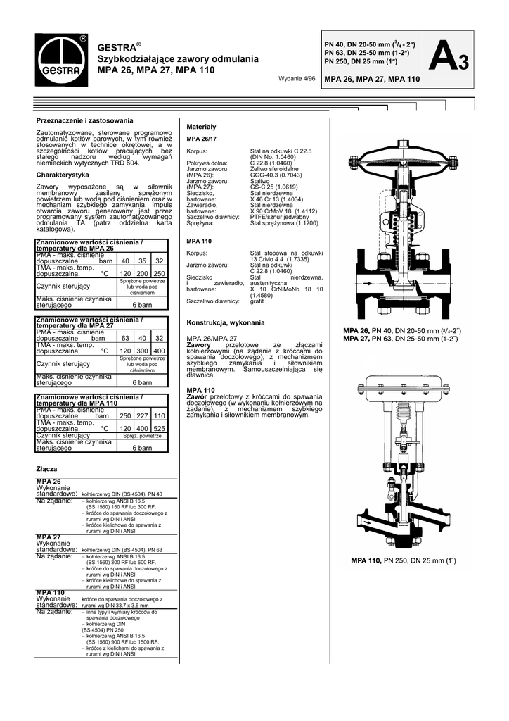 3 PN 40, DN 20-50 mm ( /4 - 2″) PN 63, DN 25-50 mm (1-2″) PN 250, DN 25 mm (1″) GESTRA® Szybkodziałające zawory odmulania MPA 26, MPA 27, MPA 110 Wydanie 4/96 Przeznaczenie i zastosowania Zautomatyzowane, sterowane programowo odmulanie kotłów parowych, w tym również stosowanych w technice okrętowej, a w szczególności kotłów pracujących bez stałego nadzoru według wymagań niemieckich wytycznych TRD 604. Charakterystyka Zawory wyposażone są w siłownik membranowy zasilany sprężonym powietrzem lub wodą pod ciśnieniem oraz w mechanizm szybkiego zamykania. Impuls otwarcia zaworu generowany jest przez programowany system zautomatyzowanego odmulania TA (patrz oddzielna karta katalogowa). Znamionowe wartości ciśnienia / temperatury dla MPA 26 PMA - maks. ciśnienie dopuszczalne barn 40 35 32 TMA - maks. temp. dopuszczalna, °C 120 200 250 Czynnik sterujący Maks. ciśnienie czynnika sterującego Sprężone powietrze lub woda pod ciśnieniem 6 barn Znamionowe wartości ciśnienia / temperatury dla MPA 27 PMA - maks. ciśnienie dopuszczalne barn 63 40 32 TMA - maks. temp. dopuszczalna, °C 120 300 400 Czynnik sterujący Maks. ciśnienie czynnika sterującego Sprężone powietrze lub woda pod ciśnieniem 6 barn Znamionowe wartości ciśnienia / temperatury dla MPA 110 PMA - maks. ciśnienie dopuszczalne barn 250 227 110 TMA - maks. temp. dopuszczalna, °C 120 400 525 Czynnik sterujący Spręż. powietrze Maks. ciśnienie czynnika sterującego 6 barn Złącza MPA 26 Wykonanie standardowe: Na żądanie: MPA 27 Wykonanie standardowe: Na żądanie: MPA 110 Wykonanie standardowe: Na żądanie: kołnierze wg DIN (BS 4504), PN 40 − kołnierze wg ANSI B 16.5 (BS 1560) 150 RF lub 300 RF. − króćce do spawania doczołowego z rurami wg DIN i ANSI − króćce kielichowe do spawania z rurami wg DIN i ANSI kołnierze wg DIN (BS 4504), PN 63 − kołnierze wg ANSI B 16.5 (BS 1560) 300 RF lub 600 RF. − króćce do spawania doczołowego z rurami wg DIN i ANSI − króćce kielichowe do spawania z rurami wg DIN i ANSI króćce do spawania doczołowego z rurami wg DIN 33.7 x 3.6 mm − inne typy i wymiary króćców do spawania doczołowego − kołnierze wg DIN (BS 4504) PN 250 − kołnierze wg ANSI B 16.5 (BS 1560) 900 RF lub 1500 RF. − króćce z kielichami do spawania z rurami wg DIN i ANSI Materiały MPA 26/17 Korpus: Pokrywa dolna: Jarzmo zaworu (MPA 26): Jarzmo zaworu (MPA 27): Siedzisko, hartowane: Zawieradło, hartowane: Szczeliwo dławnicy: Sprężyna: Stal na odkuwki C 22.8 (DIN No. 1.0460) C 22.8 (1.0460) Żeliwo sferoidalne GGG-40.3 (0.7043) Staliwo GS-C 25 (1.0619) Stal nierdzewna X 46 Cr 13 (1.4034) Stal nierdzewna X 90 CrMoV 18 (1.4112) PTFE/sznur jedwabny Stal sprężynowa (1.1200) MPA 110 Korpus: Jarzmo zaworu: Siedzisko i zawieradło, hartowane: Szczeliwo dławnicy: Stal stopowa na odkuwki 13 CrMo 4 4 (1.7335) Stal na odkuwki C 22.8 (1.0460) Stal nierdzewna, austenityczna X 10 CrNiMoNb 18 10 (1.4580) grafit Konstrukcja, wykonania MPA 26/MPA 27 Zawory przelotowe ze złączami kołnierzowymi (na żądanie z króćcami do spawania doczołowego), z mechanizmem szybkiego zamykania i siłownikiem membranowym. Samouszczelniająca się dławnica. MPA 110 Zawór przelotowy z króćcami do spawania doczołowego (w wykonaniu kołnierzowym na żądanie), z mechanizmem szybkiego zamykania i siłownikiem membranowym. MPA 26, MPA 27, MPA 110 A3 Diagram ciśnień sterowania zaworów MPA 26/MPA 27 Wymiary MPA 26, PN 40, DN 20-50 mm (3/4-2”) DN Całkowita długość w mm mm cale kołnierze DIN PN 40 50 2 182 182 182 216 216 250 250 250 250 250 250 250 250 250 250 D b k g l 105 115 140 150 165 18 18 18 18 20 75 85 100 110 125 58 68 78 88 102 14 14 18 18 18 4 4 4 4 4 kg 16,5 Liczba śrub Ciężar około 40 1 1 /2 182 182 182 216 216 Z kołnierzami wg ANSI 300 w mm; 32 1 1 /4 160 160 180 200 230 Z kołnierzami wg ANSI 150 kołnierzy 25 1 L Z kołnierzami wg DIN PN 40 Z króćcami do spawania doczołowego Z króćcami kielichowymi do spawania Wymiary 20 3 /4 17,5 18,5 22,5 23,5 MPA 27, PN 63, DN 25-50 mm (1-2”) DN Wymagane ciśnienie czynnika sterującego (zasilającego siłownik) dla zaworów MPA 26, MPA 27, w funkcji ciśnienia w kotle. Diagram ciśnień sterowania zaworu MPA 110 25 1 40 1 1 /2 50 2 190 220 250 182 216 216 216 216 250 250 250 250 250 250 250 140 24 100 68 18 4 21,5 170 26 125 88 22 4 25,5 180 26 135 102 22 4 26,5 mm cale Całkowita długość w mm Z kołnierzami wg DIN PN 63 Z kołnierzami wg ANSI 300 Z kołnierzami wg ANSI 600 Z króćcami do spawania doczołowego Z króćcami kielichowymi do spawania Wymiary kołnierzy w mm; kołnierze DIN PN 63 L D b k g l Liczba śrub Ciężar około kg MPA 110, PN 250, DN 25 mm (1”) DN mm cale Całkowita długość w mm L Z kołnierzami wg DIN PN 250 Z kołnierzami wg ANSI 900/1500 Z króćcami do spawania doczołowego Z króćcami kielichowymi do spawania Wymagane ciśnienie czynnika sterującego (zasilającego siłownik) dla zaworu MPA 110, w funkcji ciśnienia w kotle. 25 1 410 440 300 400 Częstotliwość i czas trwania odmulania W chwili otwarcia zaworu odmulania MPA jego szybkie działanie otwierające przyczynia się do powstania podciśnienia na wlocie do zaworu, co powoduje zassanie wody kotłowej z zawiesiną szlamu z dolnej części kotła i jej odprowadzenie przez zawór na zewnątrz. Równolegle do funkcji odmulania samoczynnie zachodzi również odsalanie, czyli odprowadzenie wraz z określoną ilością wody kotłowej nagromadzonych w niej, rozpuszczonych soli. Skuteczny czas odmulania – czyli czas otwarcia zaworu – trwa około 2 sekundy. Warunkiem wyznaczenia prawidłowej wartości czasu otwarcia zaworu jest znajomość ilości wody kotłowej jaka w tym czasie ma być przez zawór odprowadzona. 1. Diagram 1 prezentuje charakterystyki ilości wody kotłowej w kg/h jakie muszą być odprowadzane, aby utrzymywać jej gęstość poniżej górnej dopuszczalnej jej wartości, np.: 49,5 kg/h 2. Diagram 2 