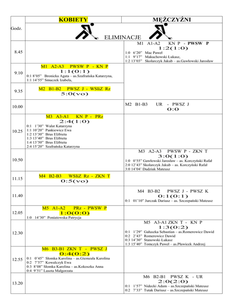 KOBIETY MĘśCZYŹNI Godz. ELIMINACJE M1 A1-A2 KN P - PWSW P 1:2(1:0) 8.45 9.10 9.35 1:0 6’20” Mac Paweł 1:1 9’17” Makuchowski Łukasz, 1:2 13’03” Skolarczyk Jakub – as.Gawłowski Jarosław M1 A2-A3 PWSW P - KN P 1:1(0:1) 0:1 8’05” Bronicka Agata – as.Szafrańska Katarzyna, 1:1 14’55” Smuczek Izabela, M2 B1-B2 PWSZ J - WSIiZ Rz 5:0(vo) M2 B1-B3 10.00 UR - PWSZ J 0:0 M3 A3-A1 KN P - PRz 2:4(1:0) 10.25 0:1 1’30” 1:1 10’20” 1:2 13’30” 1:3 13’40” 1:4 13’50” 2:4 15’20” Walat Katarzyna Pankiewicz Ewa Brus ElŜbieta Brus ElŜbieta Brus ElŜbieta Szafrańska Katarzyna M3 A2-A3 PWSW P - ZKN T 3:0(1:0) 10.50 11.15 1:0 0’55” Gawłowski Jarosław – as. Korczyński Rafał 2:0 12’43” Skolarczyk Jakub – as. Korczyński Rafał 3:0 14’04’ Dudziak Mateusz M4 B2-B3 WSIiZ Rz - ZKN T 0:5(vo) M4 B3-B2 PWSZ J - PWSZ K 0:1(0:1) 11.40 0:1 01’10” Jurczak Dariusz – as. Szczepański Mateusz 12.05 M5 A1-A2 PRz - PWSW P 1:0(0:0) 1:0 14’30” Poniatowska Patrycja M5 A3-A1 ZKN T - KN P 1:3(0:2) 0:1 1’29” 0:2 2’43” 0:3 14’30” 1:3 15’40” 12.30 Gałuszka Sebastian – as.Romerowicz Dawid Romerowicz Dawid Stanowski Łukasz Tomczyk Paweł – as.Pławicek Andrzej M6 B3-B1 ZKN T - PWSZ J 0:4(0:2) 12.55 0:1 0’45” Słomka Karolina – as.Giemzała Karolina 0:2 7’57” Kowalczyk Ewa 0:3 8’08” Słomka Karolina – as.Kokoszka Anna 0:4 9’51” Lasota Małgorzata 13.20 M6 B2-B1 PWSZ K - UR 2:0(2:0) 0:1 1’57” Nidecki Adam – as.Szczepański Mateusz 0:2 7’33” Tutak Dariusz – as.Szczepański Mateusz PÓŁFINAŁY 13.45 M7 UR - PWSZ Jarosław 2:0(2:0) 1:0 2’31” Kłosowicz Alina – as.Mroczkowska Agnieszka 2:0 15’48” Chudziak Justyna 14.10 14.35 M7 WSIiZ RZESZÓW - PWSZ KROSNO 0:0 k.3:1 M8 PWSZ Krosno - Politechnika Rzeszów 0:0 k.1:2 15.00 M8 Politechnika Rzeszów - PWSW Przemyśl 3:1(1:0) 1:0 01’10” BroŜek Dariusz 2:0 10’20” Wdowiak Maciej – as.Trzpis Jakub 2:1 11’30” Rafał Korczyński – as.Makuchowski Łukasz 3:1 12’49” Trzpis Jakub FINAŁY 15.25 o miejsca 3 i 4 PWSZ JAROSŁAW–PWSZ Krosno 0:1(0:0) 1:0 11’20” Kokoszka Anna – as.Słomka Karolina 15.50 o miejsca 3 i 4 PWSW Przemyśl – PWSZ Krosno 4:2(1:0) 1:0 7’59” Skolarczyk Jakub – as. Korczyński Rafał 2:0 8’20” Skolarczyk Jakub 3:0 11’50” Dudziak Mateusz 3:1 12”49” Szczepański Mateusz 4:1 14’55” Skolarczyk Jakub – as.Rafał Korczyński 4:2 15’37” Nidecki Adam 16.15 o miejsca 1 i 2 POLITECHNIKA RZESZÓW – – UNIWERSYTET RZESZÓW 0:1(0:0) 1:0 06’46” Mroczkowska Agnieszka 16.40 o miejsca 1 i 2 POLITECHNIKA RZESZÓW – – WSIiZ RZESZÓW 3:2(1:0) 0:1 1’23” Adamski Gracjan – as. Kordyś Piotr 1:1 4’40” Trzpis Jakub 1:2 5’50” Adamski Gracjan – Skalski Krzysztof 2:2 6’25” Trzpis Jakub 3:2 14’50” Trzpis Jakub – Kordyś Piotr Kolejność końcowa: Kobiety: 1. Uniwersytet Rzeszów 2. Politechnika Rzeszów 3. Państwowa WyŜsza Szkoła Zawodowa w Jarosławiu 4. Państwowa WyŜsza Szkoła Zawodowa w Krośnie 5. Państwowa WyŜsza Szkoła Wschodnioeuropejska w Przemyślu, Kolegium Nauczycielskie w Tarnobrzegu 7. Kolegium Nauczycielskie w Przemyślu Królowa Strzelców – Politechnika Rzeszów 3 bramki Składy/Strzelcy Bramek/Opiekunowie 1. KU AZS KN Przemyśl Agata Bronicka, Ewa Pankiewicz, Marzena Quaye, Marta Zybińska, Joanna Babieczko, Katarzyna Heliniak, Agnieszka Kukiełka, Anna Piechota, Agata Piwko, Oliwia Szczepaniec, Izabela Basiak, Katarzyna Szafrańska Trener: Marek Rząsa 2. KU AZS PWSZ Jarosław Agnieszka Pszczoła, Katarzyna Maksim, Małgorzata Marmurowicz, Małgorzata Lasota, Karolina Giemzała, Anna Kokoszka, Natalia Chrzanowska, Ewa Kowalczyk, Anna Zariczna, Agata Baran, Karolina Słomka, Anna Kucharczyk Trener: mgr Artur Świątek 3. KU AZS Politechnika Rzeszów Marzena Harasiuk, Katarzyna Wanat, Anna Kononowicz, Joanna Pięta, Justyna Wiatr, Anna Bieniek, ElŜbieta Mróz, Patrycja Poniatowska, Małgorzata Wójcik, Monika Owerko Trener: Grzegorz Sowa 4. KU AZS Uniwersytet Rzeszowski Justyna Chudziak, Alina Kłosowicz, Agnieszka Mroczkowska, Anna Czekańska, Joanna Kuleta, Magdalena Pałys, Kinga Jagiełka 5. KU AZS PWSZ Krosno K – Małgorzata Jachym, Brygida Jurczak, Renata Maksinek, Aneta Soczek, Katarzyna Kucińska, Beata Konefał, Joanna Chomiak, Alicja Świder, Magdalena Steliga Trener: Zbigniew Sobolewski 6. KU AZS ZKN Tarnobrzeg Pawlos Edyta, Siemierniak Krystyna, Wolańska Agnieszka, Czerpak Irena, Kudłacz Magdalena, Mazurek Katarzyna, Kukułka Angelika, Zastawny Ewa, Kopeć Alina Trener: 7. KU AZS PWSW Przemyśl Smuczek Izabela(1), Kitor Marta, Barycka Monika, Kowal Marzena, Wanio Marta, Kozak Agnieszka, Grodecka Anna, Mazur Natalia, Chowaniec Magdalena, Piątek Danuta, Maj Dominika, Szybowska Magdalena Trener: Rafał Korczyński Kolejność końcowa: MęŜczyźni: 1. Politechnika Rzeszów 2. WyŜsza Szkoła Informatyki i Zarządzania w Rzeszowie 3. Państwowa WyŜsza Szkoła Wschodnioeuropejska w Przemyślu, 4. Państwowa WyŜsza Szkoła Zawodowa w Krośnie 5. Uniwersytet Rzeszów Kolegium Nauczycielskie w Przemyślu 7. Państwowa WyŜsza Szkoła Zawodowa w Jarosławiu Kolegium Nauczycielskie w Tarnobrzegu Król Strzelców – Jakub Skolarczyk PWSW Przemyśl - 5 bramek Składy/Strzelcy Bramek/Opiekunowie 1. AZS KN Przemyśl M – Jerzy Feldman, Dawid Romerowicz, Roman Socha, Łukasz Stanowski, Bartosz Krucan, Jacek Dutka, Sebastian Głuszak, Stanisław Kawiński, Grzegorz Lekowski, Jacek Mazur, Paweł Mac, Łukasz Strawa Trener: Marek Rząsa 2. KU AZS PWSZ Jarosław M – Kacper Bryk, Mateusz Dylczyk, Andrzej Bilik, Sylwester Antoniak, Łukasz Skalski, Jan NieduŜak, Wiktor Wróbel, Paweł Błaszczyk, Ireneusz Zubsko, Robert Kostecki, Krzysztof Kruszczyński Trener: Artur Świątek 3. AZS KU Politechnika Rzeszów Krzysztof Rajchel, Maciej Birek, Łukasz Królicki, Krystian Kozak, Arkadiusz Słaby, Jakub Trzpis, Paweł Michałuszko, Maciej Wdowiak, Dar
