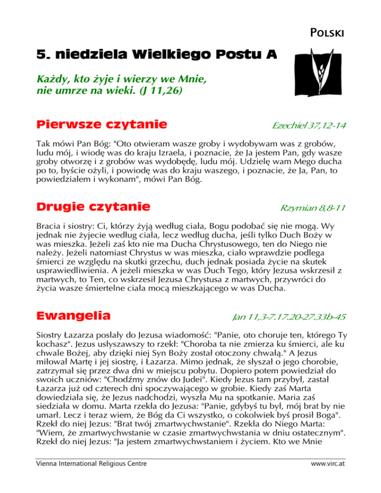 Polski Każdy, kto żyje i wierzy we Mnie, nie umrze na wieki. (J 11,26) Tak mówi Pan Bóg: "Oto otwieram wasze groby i wydobywam was z grobów, ludu mój, i wiodę was do kraju Izraela, i poznacie, że Ja jestem Pan, gdy wasze groby otworzę i z grobów was wydobędę, ludu mój. Udzielę wam Mego ducha po to, byście ożyli, i powiodę was do kraju waszego, i poznacie, że Ja, Pan, to powiedziałem i wykonam", mówi Pan Bóg. Bracia i siostry: Ci, którzy żyją według ciała, Bogu podobać się nie mogą. Wy jednak nie żyjecie według ciała, lecz według ducha, jeśli tylko Duch Boży w was mieszka. Jeżeli zaś kto nie ma Ducha Chrystusowego, ten do Niego nie należy. Jeżeli natomiast Chrystus w was mieszka, ciało wprawdzie podlega śmierci ze względu na skutki grzechu, duch jednak posiada życie na skutek usprawiedliwienia. A jeżeli mieszka w was Duch Tego, który Jezusa wskrzesił z martwych, to Ten, co wskrzesił Jezusa Chrystusa z martwych, przywróci do życia wasze śmiertelne ciała mocą mieszkającego w was Ducha. Siostry Łazarza posłały do Jezusa wiadomość: "Panie, oto choruje ten, którego Ty kochasz". Jezus usłyszawszy to rzekł: "Choroba ta nie zmierza ku śmierci, ale ku chwale Bożej, aby dzięki niej Syn Boży został otoczony chwałą." A Jezus miłował Martę i jej siostrę, i Łazarza. Mimo jednak, że słyszał o jego chorobie, zatrzymał się przez dwa dni w miejscu pobytu. Dopiero potem powiedział do swoich uczniów: "Chodźmy znów do Judei". Kiedy Jezus tam przybył, zastał Łazarza już od czterech dni spoczywającego w grobie. Kiedy zaś Marta dowiedziała się, że Jezus nadchodzi, wyszła Mu na spotkanie. Maria zaś siedziała w domu. Marta rzekła do Jezusa: "Panie, gdybyś tu był, mój brat by nie umarł. Lecz i teraz wiem, że Bóg da Ci wszystko, o cokolwiek byś prosił Boga". Rzekł do niej Jezus: "Brat twój zmartwychwstanie". Rzekła do Niego Marta: "Wiem, że zmartwychwstanie w czasie zmartwychwstania w dniu ostatecznym". Rzekł do niej Jezus: "Ja jestem zmartwychwstaniem i życiem. Kto we Mnie Vienna International Religious Centre www.virc.at wierzy, choćby i umarł, żyć będzie. Każdy, kto żyje i wierzy we Mnie, nie umrze na wieki. Wierzysz w to?" Odpowiedziała Mu: "Tak, Panie! Ja wciąż wierzę, żeś Ty jest Mesjasz, Syn Boży, który miał przyjść na świat". Jezus wzruszył się w duchu, rozrzewnił i zapytał: "Gdzieście go położyli?" Odpowiedzieli Mu: "Panie, chodź i zobacz". Jezus zapłakał. A Żydzi rzekli: "Oto jak go miłował". Niektórzy z nich powiedzieli: "Czy Ten, który otworzył oczy niewidomemu, nie mógł sprawić, by on nie umarł?" A Jezus ponownie okazując głębokie wzruszenie przyszedł do grobu. Była to pieczara, a na niej spoczywał kamień. Jezus rzekł: "Usuńcie kamień". Siostra zmarłego, Marta, rzekła do Niego: "Panie, już cuchnie. Leży bowiem od czterech dni w grobie". Jezus rzekł do niej: "Czyż nie powiedziałem ci, że jeśli uwierzysz, ujrzysz chwałę Bożą?" Usunięto więc kamień. Jezus wzniósł oczy do góry i rzekł: "Ojcze, dziękuję Ci, żeś Mnie wysłuchał. Ja wiedziałem, że Mnie zawsze wysłuchujesz. Ale ze względu na otaczający Mnie lud to powiedziałem, aby uwierzyli, żeś Ty Mnie posłał". To powiedziawszy zawołał donośnym głosem: "Łazarzu, wyjdź na zewnątrz!" I wyszedł zmarły mając nogi i ręce powiązane opaskami, a twarz jego była zawinięta chustą. Rzekł do nich Jezus: "Rozwiążcie go i pozwólcie mu chodzić". Wielu więc spośród Żydów przybyłych do Marii ujrzawszy to, czego Jezus dokonał, uwierzyło w Niego. Opowiadanie o wskrzeszeniu Łazarza – ostatni i największy z siedmiu znaków Jezusa w Ewangelii Janowej - jest mocno związane z śmiercią i zmartwychwstaniem samego Jezusa. Jest znakiem – zapowiedzią przyszłych wydarzeń. Jezus jest konfrontowany tutaj ze swoim ostatnim i największym nieprzyjacielem, z śmiercią. W chorobie i śmierci przyjaciela, w bólu rodziny, w lęku i niewierze gapiów odbiera jednocześnie szyderczy uśmiech swojego wroga. Wobec grobu również Jezus nie pozostaje bez uczucia: okazuje wzruszenie, wstrząs i smutek, zapewne także z tego powodu, że wiedział, co czeka Go w Getsemani. Jezus jednak nie unika spotkania ze śmiercią. Jest gotowy, by nie tylko pozwolić się dotknąć śmierci przyjaciela, ale także wytrzymać całą gorycz własnej śmierci. Ta świadoma konfrontacja z wrogiem zawiera w sobie zarodek zwycięstwa i zmartwychwstania. Odczuwa, że nie zostanie więźniem grobu, gdyż w swoim najgłębszym wnętrzu słyszy ten mocny głos, który wyzwala i podnosi (teraz Łazarza) z grobu: "Łazarzu, wyjdź na zewnątrz!" Konfrontacja ze śmiercią, a przez to pokonanie jej, przynosi zmartwychwstanie i życie pełne mocy bardziej niż kiedykolwiek. Tylko w oparciu o takie doświadczenie Jezus może do nas powiedzieć: "Ja jestem Zmartwychwstanie i Życie". Z tego wyrasta nasza nadzieja: On, który ma życie w pełni, może przekazać moc życia. Jądrem naszej wiary jest wiara w Jezusowe pokonanie śmierci i Jego zmartwychwstanie. Jeżeli żyjemy świadomie taką wiarą, widzimy tym samym początek naszego wiecznego życia. Jednak wiara taka nie stanowi jedynie karty wstępu do wieczności. Wiara żywa oznacza, że pozwalamy każdego dnia na nowo na udzielanie nam życia przez Niego, na ożywianie nas, na powstanie z naszego grobu, na odrzucenie kamieni, które nas przygniatają, na rzeczywiste rozpoczęcie życia! Vienna International Religious Centre [email protected]
