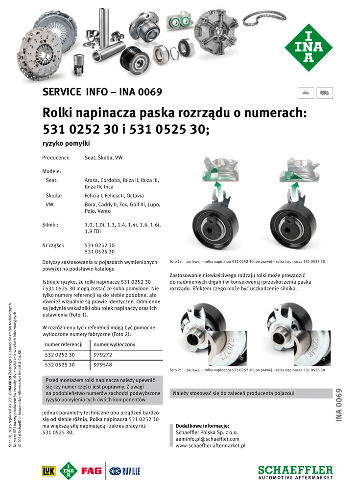 SERVICE INFO – INA 0069 Rolki napinacza paska rozrządu o numerach: 531 0252 30 i 531 0525 30; ryzyko pomyłki Producenci: Seat, Škoda, VW Modele: Seat: Arosa, Cordoba, Ibiza II, Ibiza III, Ibiza IV, Inca Škoda: Felicia I, Felicia II, Octavia VW: Bora, Caddy II, Fox, Golf III, Lupo, Polo, Vento Silniki: 1.0, 1.0i, 1.3, 1.4, 1.4i, 1.6, 1.6i, 1.9 TDI Nr części: 531 0252 30 531 0525 30 Istnieje ryzyko, że rolki napinaczy 531 0252 30 i 531 0525 30 mogą zostać ze soba pomylone. Nie tylko numery referencji są do siebie podobne, ale również wizualnie są prawie identyczne. Odmienne są jedynie wskaźniki obu rolek napinaczy oraz ich ustawienia (Foto 1). Foto 1: po lewej – rolka napinacza 531 0252 30, po prawej – rolka napinacza 531 0525 30 Zastosowanie niewłaściwego rodzaju rolki może prowadzić do nadmiernych drgań i w konsekwencji przeskoczenia paska rozrządu. Efektem czego może być uszkodzenie silnika. W rozróżnienu tych referencji mogą być pomocne wytłoczone numery fabryczne (Foto 2): numer referencji numer wytłoczony 532 0252 30 979272 532 0525 30 979548 Przed montażem rolki napinacza należy upewnić się czy numer części jest poprawny. Z uwagi na podobieństwo numerów zachodzi podwyższone ryzyko pomylenia tych dwóch komponentów. Jednak parametry techniczne obu urządzeń bardzo się od siebie różnią. Rolka napinacza 531 0252 30 ma większą siłę napinającą i zakres pracy niż 531 0525 30. Foto 2: po lewej – rolka napinacza 531 0252 30, po prawej – rolka napinacza 531 0525 30 Należy stosować się do zaleceń producenta pojazdu! Dodatkowe informacje: Schaeffler Polska Sp. z o.o. [email protected] www.schaeffler-aftermarket.pl INA 0069 Stan 01.2016 replaced 03.2011) INA 0069 Zastrzega się prawo do zmian technicznych Numery OE i nazwy producentów zostały użyte wyłącznie w celach informacyjnych © 2016 Schaeffler Automotive Aftermarket GmbH & Co. KG Dotyczy zastosowania w pojazdach wymienionych powyżej na podstawie katalogu
