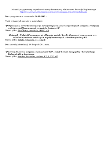 Materiał przygotowany na podstawie strony internetowej Ministerstwa Rozwoju Regionalnego http://www.mrr.gov.pl/ministerstwo/prawo/obowiazujace_prawo/strony/lista.aspx Data przygotowania zestawienia: 28.08.2013 r. Treść wytycznych zawarto w materiałach: Wymierzanie korekt finansowych za naruszenia prawa zamówień publicznych związane z realizacją projektów współfinansowanych ze środków funduszy UE Nazwa pliku: Taryfikator_instrukcja_141112.pdf • Załącznik - Wskaźniki procentowe do obliczenia wartości korekty finansowej za naruszenia przy udzielaniu zamówień publicznych, współfinansowanych ze środków funduszy UE Nazwa pliku: Tabela_wskaznika_141112.pdf Data ostatniej aktualizacji 14 listopada 2012 roku. Korekty finansowe związane z naruszeniami PZP. Audyty Komisji Europejskiej i Europejskiego Trybunału Obrachunkowego Nazwa pliku: Korekty_finansowe_Audyty_KE_i_ETO.pdf