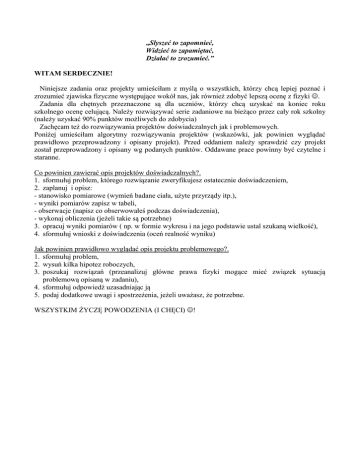 ,,Słyszeć to zapomnieć, Widzieć to zapamiętać, Działać to zrozumieć.” WITAM SERDECZNIE! Niniejsze zadania oraz projekty umieściłam z myślą o wszystkich, którzy chcą lepiej poznać i zrozumieć zjawiska fizyczne występujące wokół nas, jak również zdobyć lepszą ocenę z fizyki . Zadania dla chętnych przeznaczone są dla uczniów, którzy chcą uzyskać na koniec roku szkolnego ocenę celującą. Należy rozwiązywać serie zadaniowe na bieżąco przez cały rok szkolny (należy uzyskać 90% punktów możliwych do zdobycia) Zachęcam też do rozwiązywania projektów doświadczalnych jak i problemowych. Poniżej umieściłam algorytmy rozwiązywania projektów (wskazówki, jak powinien wyglądać prawidłowo przeprowadzony i opisany projekt). Przed oddaniem należy sprawdzić czy projekt został przeprowadzony i opisany wg podanych punktów. Oddawane prace powinny być czytelne i staranne. Co powinien zawierać opis projektów doświadczalnych?. 1. sformułuj problem, którego rozwiązanie zweryfikujesz ostatecznie doświadczeniem, 2. zaplanuj i opisz: - stanowisko pomiarowe (wymień badane ciała, użyte przyrządy itp.), - wyniki pomiarów zapisz w tabeli, - obserwacje (napisz co obserwowałeś podczas doświadczenia), - wykonaj obliczenia (jeżeli takie są potrzebne) 3. opracuj wyniki pomiarów ( np. w formie wykresu i na jego podstawie ustal szukaną wielkość), 4. sformułuj wnioski z doświadczenia (oceń realność wyniku) Jak powinien prawidłowo wyglądać opis projektu problemowego?. 1. sformułuj problem, 2. wysuń kilka hipotez roboczych, 3. poszukaj rozwiązań (przeanalizuj główne prawa fizyki mogące mieć związek sytuacją problemową opisaną w zadaniu), 4. sformułuj odpowiedź uzasadniając ją 5. podaj dodatkowe uwagi i spostrzeżenia, jeżeli uważasz, że potrzebne. WSZYSTKIM ŻYCZĘ POWODZENIA (I CHĘCI) !