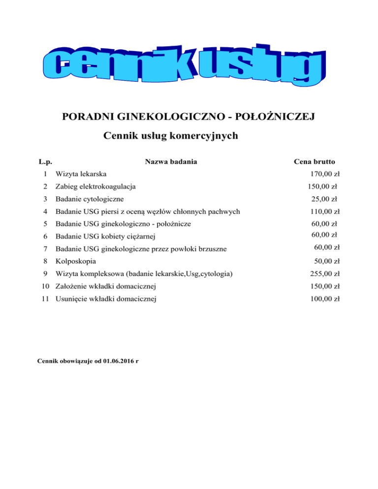 Cennik usług komercyjnych PORADNI GINEKOLOGICZNO