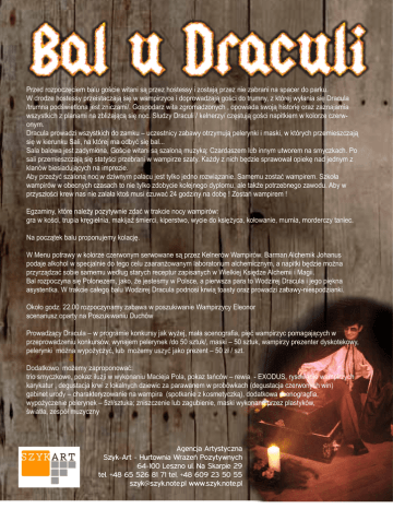 Bal u Draculi 3U]HGUR]SRF]ĊFLHPEDOXJRĞFLHZLWDQLVąSU]H]KRVWHVV\L]RVWDMąSU]H]QLH]DEUDQLQDVSDFHUGRSDUNX :GURG]HKRVWHVV\SU]HLVWDF]DMąVLĊZZDPSLU]\FHLGRSURZDG]DMąJRĞFLGRWUXPQ\]NWyUHMZ\áDQLDVLĊ'UDFXOD WUXPQDSRGĞZLHWORQDMHVW]QLF]DPL*RVSRGDU]ZLWD]JURPDG]RQ\FKRSRZLDGDVZRMąKLVWRULĊRUD]]D]QDMDPLD ZV]\VWNLFK]SODQDPLQD]EOLĪDMąFąVLĊQRF6áXG]\'UDFXOLNHOQHU]\F]ĊVWXMąJRĞFLQDSLWNLHPZNRORU]HF]HUZ- RQ\P 'UDFXODSURZDG]LZV]\VWNLFKGR]DPNX±XF]HVWQLF\]DEDZ\RWU]\PXMąSHOHU\QNLLPDVNLZNWyU\FKSU]HPLHV]F]DMą VLĊZNLHUXQNX6DOLQDNWyUHMPDRGE\üVLĊEDO 6DODEDORZDMHVW]DG\PLRQD*RĞFLHZLWDQLVąV]DORQąPX]\Ną&]DUGDV]HPOXELQQ\PXWZRUHPQDVP\F]NDFK3R VDOLSU]HPLHV]F]DMąVLĊVWDW\ĞFLSU]HEUDQLZZDPSLU]HV]DW\.DĪG\]QLFKEĊG]LHVSUDZRZDáRSLHNĊQDGMHGQ\P] NODQyZELHVLDGXMąF\FKQDLPSUH]LH $E\SU]HĪ\üV]DORQąQRFZG]LZQ\PSDáDFXMHVWW\ONRMHGQRUR]ZLą]DQLH6DPHPX]RVWDüZDPSLUHP6]NRáD ZDPSLUyZZREHFQ\FKF]DVDFKWRQLHW\ONR]GRE\FLHNROHMQHJRG\SORPXDOHWDNĪHSRWU]HEQHJR]DZRGX$E\Z SU]\V]áRĞFLNUHZQDVQLH]DODáDNWRĞPXVLF]XZDüJRG]LQ\QDGREĊ=RVWDĔZDPSLUHP (J]DPLQ\NWyUHQDOHĪ\SR]\W\ZQLH]GDüZWUDNFLHQRF\ZDPSLUyZ JUDZNRĞFLWUXSLDNUĊJLHOQLDPDNLMDĪĞPLHUFLNLSHUVWZRZ\FLHGRNVLĊĪ\FDNRáRZDQLHPXPLDPRUGHUF]\WDQLHF 1DSRF]ąWHNEDOXSURSRQXMHP\NRODFMĊ :0HQXSRWUDZ\ZNRORU]HF]HUZRQ\PVHUZRZDQHVąSU]H].HOQHUyZ:DPSLUyZ%DUPDQ$OFKHPLN-RKDQXV SRGDMHDONRKROZVSHFMDOQLHGRWHJRFHOX]DDUDQĪRZDQ\PODERUDWRULXPDOFKHPLF]Q\PDQDSLWNLEĊG]LHPRĪQD SU]\U]ąG]DüVRELHVDPHPXZHGáXJVWDU\FKUHFHSWXU]DSLVDQ\FKZ:LHONLHM.VLĊG]H$OFKHPLLL0DJLL %DOUR]SRF]\QDVLĊ3RORQH]HPMDNRĪHMHVWHĞP\Z3ROVFHDSLHUZV]DSDUDWR:RG]LUHM'UDFXODLMHJRSLĊNQD DV\VWHQWND:WUDNFLHFDáHJREDOX:RG]LUHM'UDFXODSRGQRVLNUZLąWRDVW\RUD]SURZDG]L]DEDZ\QLHVSRG]LDQNL 2NRáRJRG]UR]SRF]\QDP\]DEDZDZSRV]XNLZDQLH:DPSLU]\F\(OHRQRU VFHQDULXV]RSDUW\QD3RV]XNLZDQLX'XFKyZ 3URZDG]ąF\'UDFXOD±ZSURJUDPLHNRQNXUV\MDNZ\ĪHMPDáDVFHQRJUDILDSLĊüZDPSLU]\FSRPDJDMąF\FKZ SU]HSURZDG]HQLXNRQNXUVyZZ\QDMHPSHOHU\QHNGRV]WXNPDVNL±V]WXNZDPSLU]\SUH]HQWHUG\VNRWHNRZ\ SHOHU\QNLPRĪQDZ\SRĪ\F]\üOXEPRĪHP\XV]\üMDNRSUH]HQW±]áV]W 'RGDWNRZRPRĪHP\]DSURSRQRZDü WULRVP\F]NRZHSRND]LOX]MLZZ\NRQDQLX0DFLHMD3RODSRND]WDĔFyZ±UHZLD(;2'86U\VRZDQLHZDPSLU]\FK NDU\NDWXUGHJXVWDFMDNUZL]ORNDOQ\FKG]LHZLF]DSDUDZDQHPZSUREyZNDFKGHJXVWDFMDF]HUZRQ\FKZLQ JDELQHWXURG\±FKDUDNWHU\]RZDQLHQDZDPSLUDVSRWNDQLH]NRVPHW\F]NąGRGDWNRZDVFHQRJUDJILD Z\SRĪ\F]HQLHSHOHU\QHN±]áV]WXND]QLV]F]HQLHOXE]DJXELHQLHPDVNLZ\NRQDQHSU]H]SODVW\NyZ ĞZLDWáD]HVSyáPX]\F]Q\ Agencja Artystyczna 1WVHOQ&ROQLTKF>5O>ĊBČ.LWVQVTKV@E 64-100 Leszno ul. Na Skarpie 29 tel. +48 65 526 81 71 tel. +48 609 23 50 55 [email protected] www.szyk.note.pl