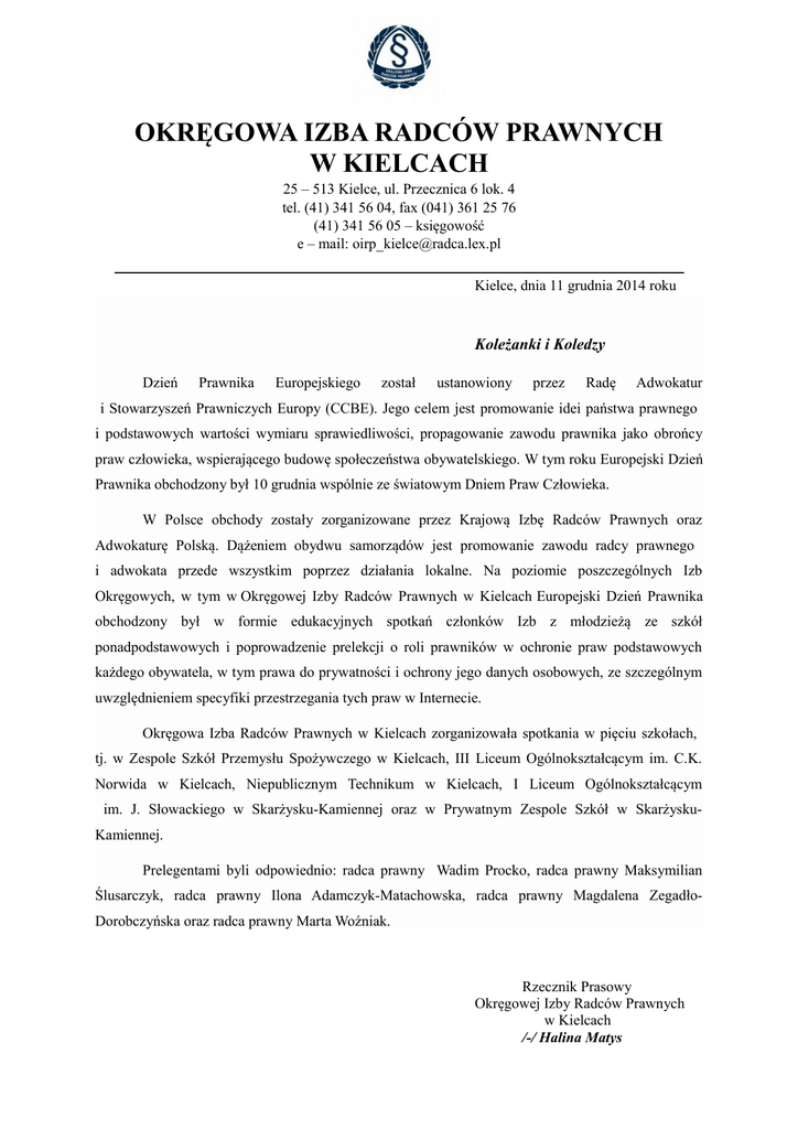 OKRĘGOWA IZBA RADCÓW PRAWNYCH W KIELCACH 25 – 513 Kielce, ul. Przecznica 6 lok. 4 tel. (41) 341 56 04, fax (041) 361 25 76 (41) 341 56 05 – księgowość e – mail: [email protected] Kielce, dnia 11 grudnia 2014 roku Koleżanki i Koledzy Dzień Prawnika Europejskiego został ustanowiony przez Radę Adwokatur i Stowarzyszeń Prawniczych Europy (CCBE). Jego celem jest promowanie idei państwa prawnego i podstawowych wartości wymiaru sprawiedliwości, propagowanie zawodu prawnika jako obrońcy praw człowieka, wspierającego budowę społeczeństwa obywatelskiego. W tym roku Europejski Dzień Prawnika obchodzony był 10 grudnia wspólnie ze światowym Dniem Praw Człowieka. W Polsce obchody zostały zorganizowane przez Krajową Izbę Radców Prawnych oraz Adwokaturę Polską. Dążeniem obydwu samorządów jest promowanie zawodu radcy prawnego i adwokata przede wszystkim poprzez działania lokalne. Na poziomie poszczególnych Izb Okręgowych, w tym w Okręgowej Izby Radców Prawnych w Kielcach Europejski Dzień Prawnika obchodzony był w formie edukacyjnych spotkań członków Izb z młodzieżą ze szkół ponadpodstawowych i poprowadzenie prelekcji o roli prawników w ochronie praw podstawowych każdego obywatela, w tym prawa do prywatności i ochrony jego danych osobowych, ze szczególnym uwzględnieniem specyfiki przestrzegania tych praw w Internecie. Okręgowa Izba Radców Prawnych w Kielcach zorganizowała spotkania w pięciu szkołach, tj. w Zespole Szkół Przemysłu Spożywczego w Kielcach, III Liceum Ogólnokształcącym im. C.K. Norwida w Kielcach, Niepublicznym Technikum w Kielcach, I Liceum Ogólnokształcącym im. J. Słowackiego w Skarżysku-Kamiennej oraz w Prywatnym Zespole Szkół w SkarżyskuKamiennej. Prelegentami byli odpowiednio: radca prawny Wadim Procko, radca prawny Maksymilian Ślusarczyk, radca prawny Ilona Adamczyk-Matachowska, radca prawny Magdalena ZegadłoDorobczyńska oraz radca prawny Marta Woźniak. Rzecznik Prasowy Okręgowej Izby Radców Prawnych w Kielcach /-/ Halina Matys