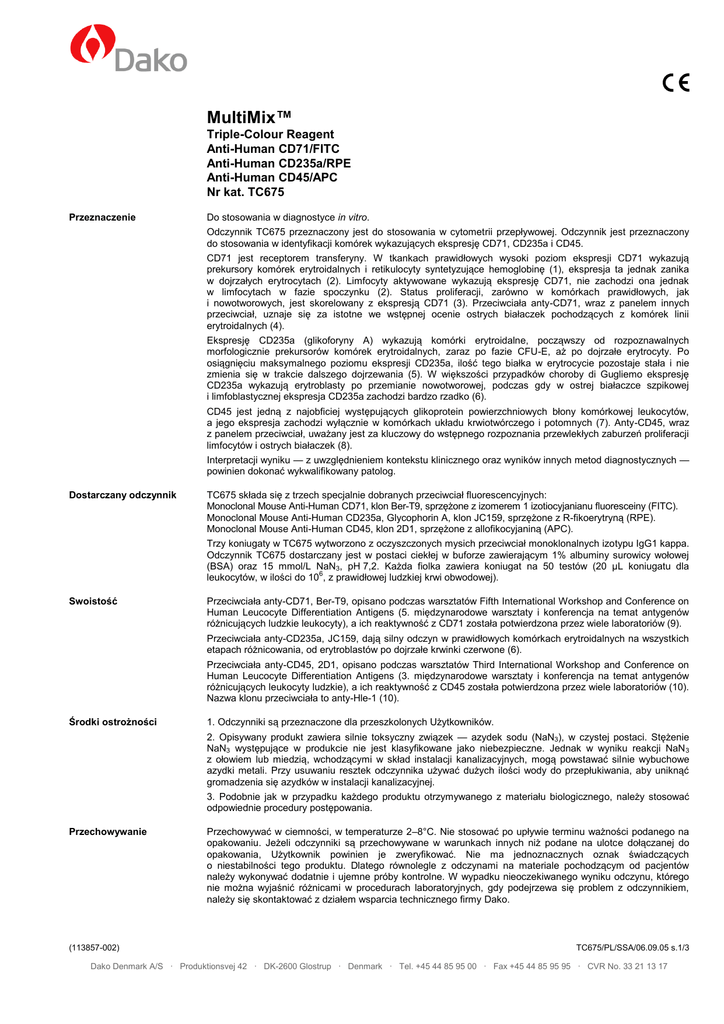 MultiMix™ Triple-Colour Reagent Anti-Human CD71/FITC Anti-Human CD235a/RPE Anti-Human CD45/APC Nr kat. TC675 Przeznaczenie Do stosowania w diagnostyce in vitro. Odczynnik TC675 przeznaczony jest do stosowania w cytometrii przepływowej. Odczynnik jest przeznaczony do stosowania w identyfikacji komórek wykazujących ekspresję CD71, CD235a i CD45. CD71 jest receptorem transferyny. W tkankach prawidłowych wysoki poziom ekspresji CD71 wykazują prekursory komórek erytroidalnych i retikulocyty syntetyzujące hemoglobinę (1), ekspresja ta jednak zanika w dojrzałych erytrocytach (2). Limfocyty aktywowane wykazują ekspresję CD71, nie zachodzi ona jednak w limfocytach w fazie spoczynku (2). Status proliferacji, zarówno w komórkach prawidłowych, jak i nowotworowych, jest skorelowany z ekspresją CD71 (3). Przeciwciała anty-CD71, wraz z panelem innych przeciwciał, uznaje się za istotne we wstępnej ocenie ostrych białaczek pochodzących z komórek linii erytroidalnych (4). Ekspresję CD235a (glikoforyny A) wykazują komórki erytroidalne, począwszy od rozpoznawalnych morfologicznie prekursorów komórek erytroidalnych, zaraz po fazie CFU-E, aż po dojrzałe erytrocyty. Po osiągnięciu maksymalnego poziomu ekspresji CD235a, ilość tego białka w erytrocycie pozostaje stała i nie zmienia się w trakcie dalszego dojrzewania (5). W większości przypadków choroby di Gugliemo ekspresję CD235a wykazują erytroblasty po przemianie nowotworowej, podczas gdy w ostrej białaczce szpikowej i limfoblastycznej ekspresja CD235a zachodzi bardzo rzadko (6). CD45 jest jedną z najobficiej występujących glikoprotein powierzchniowych błony komórkowej leukocytów, a jego ekspresja zachodzi wyłącznie w komórkach układu krwiotwórczego i potomnych (7). Anty-CD45, wraz z panelem przeciwciał, uważany jest za kluczowy do wstępnego rozpoznania przewlekłych zaburzeń proliferacji limfocytów i ostrych białaczek (8). Interpretacji wyniku — z uwzględnieniem kontekstu klinicznego oraz wyników innych metod diagnostycznych — powinien dokonać wykwalifikowany patolog. Dostarczany odczynnik TC675 składa się z trzech specjalnie dobranych przeciwciał fluorescencyjnych: Monoclonal Mouse Anti-Human CD71, klon Ber-T9, sprzężone z izomerem 1 izotiocyjanianu fluoresceiny (FITC). Monoclonal Mouse Anti-Human CD235a, Glycophorin A, klon JC159, sprzężone z R-fikoerytryną (RPE). Monoclonal Mouse Anti-Human CD45, klon 2D1, sprzężone z allofikocyjaniną (APC). Trzy koniugaty w TC675 wytworzono z oczyszczonych mysich przeciwciał monoklonalnych izotypu IgG1 kappa. Odczynnik TC675 dostarczany jest w postaci ciekłej w buforze zawierającym 1% albuminy surowicy wołowej (BSA) oraz 15 mmol/L NaN3, pH 7,2. Każda fiolka zawiera koniugat na 50 testów (20 µL koniugatu dla leukocytów, w ilości do 106, z prawidłowej ludzkiej krwi obwodowej). Swoistość Przeciwciała anty-CD71, Ber-T9, opisano podczas warsztatów Fifth International Workshop and Conference on Human Leucocyte Differentiation Antigens (5. międzynarodowe warsztaty i konferencja na temat antygenów różnicujących ludzkie leukocyty), a ich reaktywność z CD71 została potwierdzona przez wiele laboratoriów (9). Przeciwciała anty-CD235a, JC159, dają silny odczyn w prawidłowych komórkach erytroidalnych na wszystkich etapach różnicowania, od erytroblastów po dojrzałe krwinki czerwone (6). Przeciwciała anty-CD45, 2D1, opisano podczas warsztatów Third International Workshop and Conference on Human Leucocyte Differentiation Antigens (3. międzynarodowe warsztaty i konferencja na temat antygenów różnicujących leukocyty ludzkie), a ich reaktywność z CD45 została potwierdzona przez wiele laboratoriów (10). Nazwa klonu przeciwciała to anty-Hle-1 (10). Środki ostrożności 1. Odczynniki są przeznaczone dla przeszkolonych Użytkowników. 2. Opisywany produkt zawiera silnie toksyczny związek — azydek sodu (NaN3), w czystej postaci. Stężenie NaN3 występujące w produkcie nie jest klasyfikowane jako niebezpieczne. Jednak w wyniku reakcji NaN 3 z ołowiem lub miedzią, wchodzącymi w skład instalacji kanalizacyjnych, mogą powstawać silnie wybuchowe azydki metali. Przy usuwaniu resztek odczynnika używać dużych ilości wody do przepłukiwania, aby uniknąć gromadzenia się azydków w instalacji kanalizacyjnej. 3. Podobnie jak w przypadku każdego produktu otrzymywanego z materiału biologicznego, należy stosować odpowiednie procedury postępowania. Przechowywanie (113857-002) Przechowywać w ciemności, w temperaturze 2–8°C. Nie stosować po upływie terminu ważności podanego na opakowaniu. Jeżeli odczynniki są przechowywane w warunkach innych niż podane na ulotce dołączanej do opakowania, Użytkownik powinien je zweryfikować. Nie ma jednoznacznych oznak świadczących o niestabilności tego produktu. Dlatego równolegle z odczynami na materiale pochodzącym od pacjentów należy wykonywać dodatnie i ujemne próby kontrolne. W wypadku nieoczekiwanego wyniku odczynu, którego nie można wyjaśnić różnicami w procedurach laboratoryjnych, gdy podejrzewa się problem z odczynnikiem, należy się skontaktować z działem wsparcia technicznego firmy Dako. TC675/PL/SSA/06.09.05 s.1/3 Dako Denmark A/S · Produktionsvej 42 · DK-2600 Glostrup · Denmark · Tel. +45 44 85 95 00 · Fax +45 44 85 95 95 · CVR No. 33 21 13 17 Wykonanie odczynu Ponieważ przeciwciała anty-CD235a reagują z erytrocytami, niezbędne jest usunięcie erytrocytów przed rozpoczęciem wykonania odczynu przy użyciu odczynnika TC675. 1. Przenieść 100 µL krwi z dodatkiem środka przeciwzakrzepowego (EDTA) do probówki polistyrenowej o wymiarach 12 mm x 75 mm. 2. Zlizować erytrocyty po etapie 3–5 albo wyizolować komórki jednojądrzaste przez wirowanie w gradiencie gęstości i przejść do etapu 6. 3. Dodać do probówki 100 µL odczynnika Uti-Lyse™ Reagent A (nr kat. Dako S3325) i delikatnie mieszać mieszadłem wibracyjnym. In