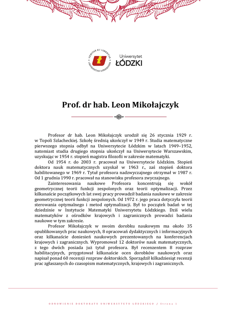 Prof. dr hab. Leon Mikołajczyk Profesor dr hab. Leon Mikołajczyk urodził się 26 stycznia 1929 r. w Topoli Szlacheckiej. Szkołę średnią ukończył w 1949 r. Studia matematyczne pierwszego stopnia odbył na Uniwersytecie Łódzkim w latach 1949–1952, natomiast studia drugiego stopnia ukończył na Uniwersytecie Warszawskim, uzyskując w 1954 r. stopień magistra filozofii w zakresie matematyki. Od 1954 r. do 2003 r. pracował na Uniwersytecie Łódzkim. Stopień doktora nauk matematycznych uzyskał w 1963 r., zaś stopień doktora habilitowanego w 1969 r. Tytuł profesora nadzwyczajnego otrzymał w 1987 r. Od 1 grudnia 1990 r. pracował na stanowisku profesora zwyczajnego. Zainteresowania naukowe Profesora koncentrują się wokół geometrycznej teorii funkcji zespolonych oraz teorii optymalizacji. Przez kilkanaście początkowych lat swej pracy prowadził badania naukowe w zakresie geometrycznej teorii funkcji zespolonych. Od 1972 r. jego praca dotyczyła teorii sterowania optymalnego i metod optymalizacji. Był to początek badań w tej dziedzinie w Instytucie Matematyki Uniwersytetu Łódzkiego. Dziś wielu matematyków z ośrodków krajowych i zagranicznych prowadzi badania naukowe w tym zakresie. Profesor Mikołajczyk w swoim dorobku naukowym ma około 35 opublikowanych prac naukowych, 8 opracowań dydaktycznych i informacyjnych oraz kilkanaście doniesień naukowych prezentowanych na konferencjach krajowych i zagranicznych. Wypromował 12 doktorów nauk matematycznych, z tego dwóch posiada już tytuł profesora. Był recenzentem 8 rozpraw habilitacyjnych, przygotował kilkanaście ocen dorobków naukowych oraz napisał ponad 60 recenzji rozpraw doktorskich. Sporządził kilkadziesiąt recenzji prac zgłaszanych do czasopism matematycznych, krajowych i zagranicznych. O D N O W I E N I E D O K T O R A T U U N I W E R S Y T E T U Ł Ó D Z K I E G O / S t r o n a 1 O D N O W I E N I E D O K T O R A T U U N I W E R S Y T E T U Ł Ó D Z K I E G O Na zlecenie Komitetu Badań Naukowych wielokrotnie oceniał projekty badawcze. W latach 1967–2003 był recenzentem przeglądowego czasopisma „Zentralblatt für Mathematik und ihre Grenzgebite”, a w latach 1974–2003 recenzentem „Mathematical Reviews”. Dla wspomnianych czasopism napisał kilkaset krótkich recenzji prac matematycznych z zakresu jego specjalności. Pod kierunkiem Profesora 18 studentów odbyło studia według programów indywidualnych. Wszyscy oni uzyskali dyplomy z wyróżnieniem bądź Medale „Za chlubne studia”, a dwóch – nagrody i wyróżnienia w ogólnopolskich konkursach studenckich prac naukowych. Spośród studentów, którzy pod kierunkiem Profesora odbyli studia według programów indywidualnych, ośmiu posiada już stopień doktora habilitowanego, a wszyscy pozostali (z wyjątkiem jednego) stopnie doktora. Profesor Mikołajczyk nieprzerwanie od 1970 r. prowadził seminaria dla pracowników naukowych i doktorantów. Aktywnie uczestniczył w wielu konferencjach naukowych w kraju i za granicą, a także był ich organizatorem lub współorganizatorem. Prezentował wyniki własnych badań i odwiedzał zagraniczne ośrodki naukowe (Czechosłowacja, Węgry, Niemcy, Bułgaria, Szwecja, Gruzja, Związek Radziecki, Wietnam i Litwa). Pod Jego kierunkiem odbyło staże kilkunastu młodych pracowników naukowych z uczelni krajowych i zagranicznych. Szeroko zakrojona działalność dydaktyczno-wychowawcza Profesora obejmowała m.in. ćwiczenia, wykłady kursowe, monograficzne i specjalizacyjne, proseminaria i seminaria na Uniwersytecie Łódzkim dla różnych roczników oraz wielu specjalności i rodzajów studiów. Przez 13 lat prof. Mikołajczyk prowadził również wykłady i seminaria dla studentów Wydziału Matematyki Stosowanej i Fizyki Technicznej Politechniki Łódzkiej. Wielokrotnie odbywał wykłady dla słuchaczy Studium Doktoranckiego oraz dla uczestników Kursów Zastosowań Matematyki. W latach 1970–1979 był członkiem Rady Naukowej Instytutu Matematyki Politechniki Łódzkiej. Opiekował się blisko 200 pracami magisterskimi. Profesor wielokrotnie brał czynny udział w opracowywaniu planów i programów dla różnych rodzajów studiów. Prowadził pionierski wykład pt. Modelowanie matematyczne. Przedmiot o tej nazwie został później wprowadzony na stałe do planu studiów na specjalnościach: zastosowania matematyki i metody numeryczne. Na zlecenie Zarządu Głównego Polskiego Towarzystwa Matematycznego opracował prowadzoną w Towarzystwie dyskusję nt. Profil absolwenta studiów matematycznych w uniwersytetach i w wyższych szkołach pedagogicznych. O D N O W I E N I E D O K T O R A T U U N I W E R S Y T E T U Ł Ó D Z K I E G O / S t r o n a 2 O D N O W I E N I E D O K T O R A T U U N I W E R S Y T E T U Ł Ó D Z K I E G O Aktywnie uczestniczył w wielu konferencjach poświęconych zagadnieniom kształcenia nauczycieli i dydaktyce matematyki. Od wielu lat był członkiem Centralnego Ośrodka Metodycznego Studiów Nauczycielskich przy Wyższej Szkole Pedagogicznej w Krakowie. W latach 1985–1989 był przewodniczącym Międzywojewódzkiej Komisji Kwalifikacyjnej działającej przy Oddziale Doskonalenia Nauczycieli w Łodzi. Z upoważnienia Zarządu Głównego Polskiego Towarzystwa Matematycznego brał czynny udział w opracowaniu memoriału w sprawie kształcenia w zakresie niekierunkowych przedmiotów podstawowych (matematyka, fizyka, chemia i biologia) w szkołach wyższych, skierowanego do ministra edukacji narodowej. Profesor Mikołajczyk w czasie pracy na Uniwersytecie Łódzkim podejmował wiele obowiązków wychowawczych, zarówno w ramach Wydziału Matematyki, Fizyki i Chemii, jak i w skali całej uczelni. Jego aktywność organizacyjna jest imponująca: m.in. był zastępcą dyrektora Instytutu Matematyki UŁ (1970–1975), kuratorem Zakładu Geometrii IM UŁ (1970–1975), kuratorem Zakładu Rachunku Prawdopodobieństwa i Statystyki Matematycznej IM UŁ (1977–1978)