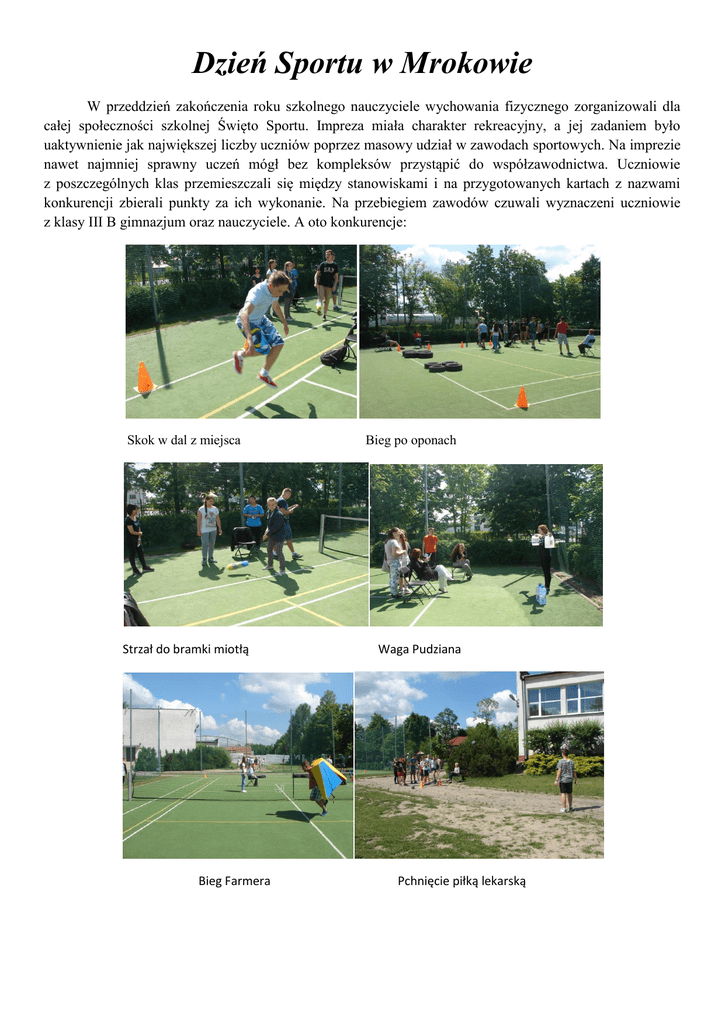 Dzień Sportu w Mrokowie W przeddzień zakończenia roku szkolnego nauczyciele wychowania fizycznego zorganizowali dla całej społeczności szkolnej Święto Sportu. Impreza miała charakter rekreacyjny, a jej zadaniem było uaktywnienie jak największej liczby uczniów poprzez masowy udział w zawodach sportowych. Na imprezie nawet najmniej sprawny uczeń mógł bez kompleksów przystąpić do współzawodnictwa. Uczniowie z poszczególnych klas przemieszczali się między stanowiskami i na przygotowanych kartach z nazwami konkurencji zbierali punkty za ich wykonanie. Na przebiegiem zawodów czuwali wyznaczeni uczniowie z klasy III B gimnazjum oraz nauczyciele. A oto konkurencje: Skok w dal z miejsca Strzał do bramki miotłą Bieg Farmera Bieg po oponach Waga Pudziana Pchnięcie piłką lekarską Rzut do wiaderka Gry zespołowe na sali gimnastycznej Dzień Sportu zakończył mecz siatkówki uczniowie – nauczyciele, który zakończył się wynikiem 2:1 dla nauczycieli. Piękna słoneczna pogoda i radosne nastroje uczestników imprezy można uznać za dobry początek czekających nas wakacji! Aneta Michalczyk – zespół ds. promocji szkoły