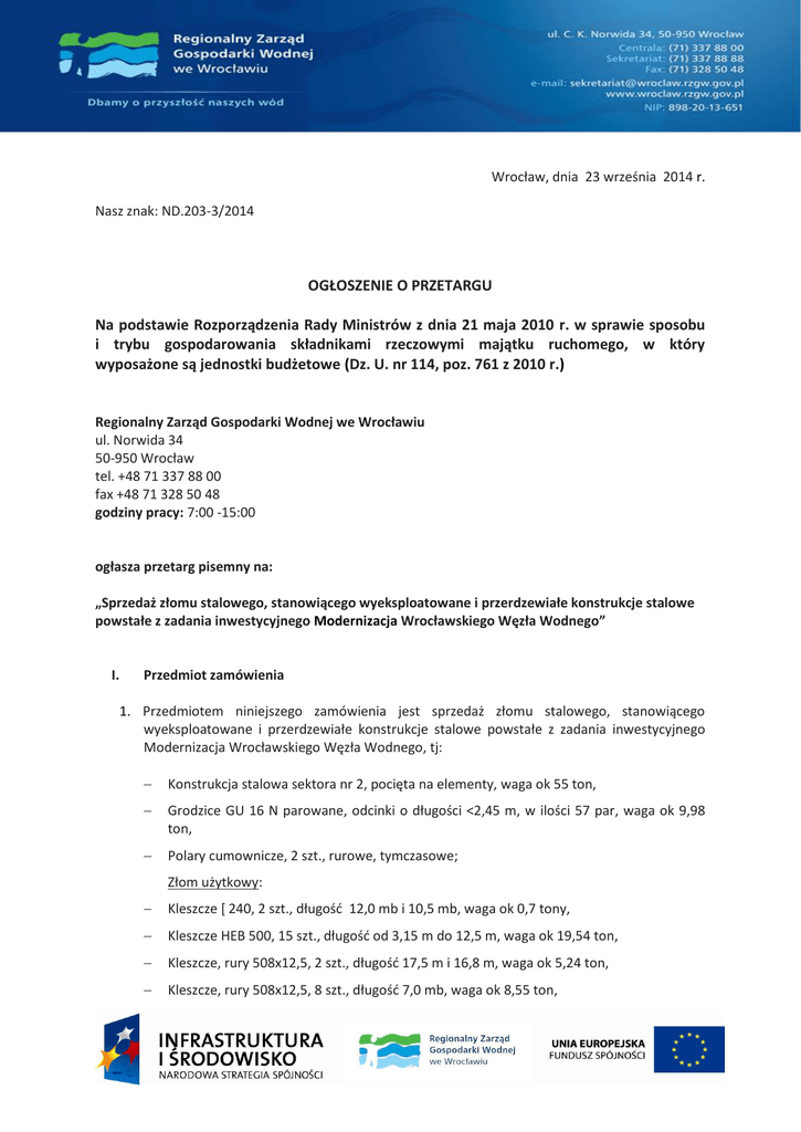 Wrocław, dnia 23 września 2014 r. Nasz znak: ND.203-3/2014 OGŁOSZENIE O PRZETARGU Na podstawie Rozporządzenia Rady Ministrów z dnia 21 maja 2010 r. w sprawie sposobu i trybu gospodarowania składnikami rzeczowymi majątku ruchomego, w który wyposażone są jednostki budżetowe (Dz. U. nr 114, poz. 761 z 2010 r.) Regionalny Zarząd Gospodarki Wodnej we Wrocławiu ul. Norwida 34 50-950 Wrocław tel. +48 71 337 88 00 fax +48 71 328 50 48 godziny pracy: 7:00 -15:00 ogłasza przetarg pisemny na: „Sprzedaż złomu stalowego, stanowiącego wyeksploatowane i przerdzewiałe konstrukcje stalowe powstałe z zadania inwestycyjnego Modernizacja Wrocławskiego Węzła Wodnego” I. Przedmiot zamówienia 1. Przedmiotem niniejszego zamówienia jest sprzedaż złomu stalowego, stanowiącego wyeksploatowane i przerdzewiałe konstrukcje stalowe powstałe z zadania inwestycyjnego Modernizacja Wrocławskiego Węzła Wodnego, tj: Konstrukcja stalowa sektora nr 2, pocięta na elementy, waga ok 55 ton, Grodzice GU 16 N parowane, odcinki o długości <2,45 m, w ilości 57 par, waga ok 9,98 ton, Polary cumownicze, 2 szt., rurowe, tymczasowe; Złom użytkowy: Kleszcze [ 240, 2 szt., długość 12,0 mb i 10,5 mb, waga ok 0,7 tony, Kleszcze HEB 500, 15 szt., długość od 3,15 m do 12,5 m, waga ok 19,54 ton, Kleszcze, rury 508x12,5, 2 szt., długość 17,5 m i 16,8 m, waga ok 5,24 ton, Kleszcze, rury 508x12,5, 8 szt., długość 7,0 mb, waga ok 8,55 ton, Rozpory ukośne, rury 508 x 12,5, 8 szt., długość 8,7 mb, waga ok 10,61 ton, Grodzice stalowe GU 16-400, 23 szt. długość 2,8 m; 25 szt. długość 4,3 m; 9 szt. długość 2,2 m; 15 szt. długość 2,2 m; 14 szt. długość 2,0 m; waga ok 15,21 ton Wrota przeciwpowodziowe, 2 komplety pocięte na elementy, waga łączna ok 36 ton, Wrota wsporne z pomostem, 2 komplety pocięte na elementy, waga łączna ok 34 ton. Łączna ilości złomu wynosi około 195 ton (ciężar wynika z dokumentacji archiwalnej, będącej w posiadaniu RZGW). 2. Sprzedający zastrzega, iż warunkiem kupna złomu jest jego kupno w całości, załadunek, koszt pocięcia konstrukcji, odbiór transportem. Usługa ważenia odbędzie się staraniem i na koszt kupującego. Oferent winien skalkulować i przedłożyć Sprzedającemu cenę za odbiór kompletu złomu. 3. Odbiór przedmiotu postępowania może się odbywać partiami, z miejsca jego składowania. 4. Złom znajduje się na terenie: rejon Jazu Różanka, Magazyn Główny RZGW we Wrocławiu, Kanał Miejski rejon mostu Osobowickiego. II. Cena wywoławcza 0,60 zł za kilogram. III. Miejsce i termin w którym można obejrzeć przedmioty sprzedaży: Elementy stalowe będące przedmiotem sprzedaży można oglądać w godz. 9.30 do 13.00 od poniedziałku do piątku: Jaz Różanka - po wcześniejszym telefonicznym zgłoszeniu chęci oględzin u inż. Rafał Przybysz Kierownika Robót, tel. 509 274 169; Magazyn Główny RZGW we Wrocławiu - po wcześniejszym telefonicznym zgłoszeniu chęci oględzin u Mirosława Jaroszewicza, tel. 502 555 004, ul. Braci Gierymskich 149a, Wrocław; Kanał Miejski - po wcześniejszym telefonicznym zgłoszeniu chęci oględzin u inż. Rolanda Hamerla Kierownika Robót, tel. 503825752. IV. Termin wykonania: W terminie 14 dni od dnia podpisania umowy. V. Miejsce i termin składania ofert: Siedziba sprzedającego – RZGW we Wrocławiu, 50-950 Wrocław ul. Norwida 34, pokój nr 13 (parter) do dnia 09.10.2014 r. do godz. 930. VI. Miejsce i termin otwarcia ofert: Siedziba sprzedającego RZGW we Wrocławiu RZGW we Wrocławiu, 50-950 Wrocław ul. Norwida 34, pokój 10 w dniu 09.10.2014 r. godz. 1000. VII. Oferta powinna zawierać: 1. Oferta powinna zostać złożona w zamkniętej kopercie opisanej: „Regionalny Zarząd Gospodarki Wodnej we Wrocławiu, ul. Norwida 34 50-950 Wrocław „Oferta na zakup złomu” Nie otwierać przed dniem 09.10.2014 r. godz. 1000. 2. Wypełniony i podpisany formularz oferty stanowiący załącznik nr 1 do niniejszego ogłoszenia. 3. Dowód wpłacenia wadium. 4. Aktualny odpis z Krajowego Rejestru Sądowego lub zaświadczenie o wpisie do ewidencji działalności gospodarczej (wystawiony nie wcześniej niż 6 miesięcy przed upływem terminu składania oferty). Dokument ten powinien zostać złożony w formie oryginału lub kserokopii poświadczonej za zgodność z oryginałem przez osoby (osobę) upoważnione do reprezentowania Oferenta. 5. Stosowne zezwolenie lub uwierzytelnioną kserokopię na prowadzenie działalności w zakresie zbierania lub odzysku złomu – zgodnie z ustawą o odpadach z dnia 14.12.2012r. (Dz. U. z 2013 r., poz. 21 ze zm.). 6. Pełnomocnictwo do podpisana oferty i zawarcia umowy, o ile prawo takie nie wynika z dokumentów złożonych wraz z ofertą. 7. Pełnomocnictwo do reprezentowania Oferentów w postępowaniu i zawarcia umowy w przypadku, gdy Oferenci wspólnie ubiegają się o udzielenie zamówienia. 8. Aktualną umowę spółki cywilnej, jeżeli działalność gospodarcza przedsiębiorców prowadzona jest w tej formie. VIII. Komisja przetargowa odrzuca ofertę, jeżeli: 1. Została złożona po wyznaczonym terminie, w niewłaściwym miejscu lub przez oferenta, który nie wniósł wadium. 2. Nie zawiera wymaganych danych i dokumentów, lub są one niekompletne nieczytelne lub budzą wątpliwości, zaś złożenie wyjaśnień mogłoby prowadzić do uznania jej za nową ofertę. 3. Cena podana w ofercie jest niższa niż wywoławcza. O odrzuceniu oferty komisja przetargowa zawiadamia niezwłocznie oferenta. IX. Wadium: 1. Warunkiem przystąpienia do przetargu jest wniesienie wadium w wysokości 7020 zł (siedmiu tysięcy dwudziestu złotych). 2. Wadium wnosi się wyłącznie w pieniądzu, przelewem na rachunek bankowy w BGK 97113010330018815335200001, określając tytuł wpłaty „Wadium- sprzedaż złomu”. 3. Wadium wnosi się przed upływem terminu składania ofert. 4. Wadium złożone przez oferentów, których oferty nie zostały wybrane lub zosta