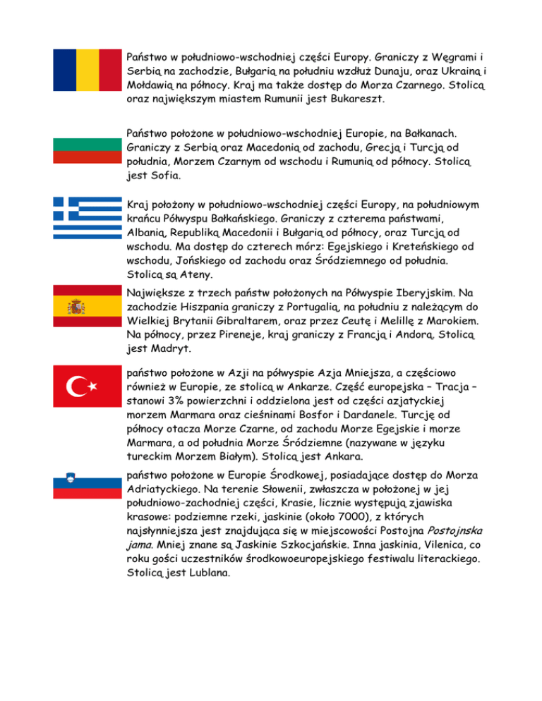 Państwo w południowo-wschodniej części Europy. Graniczy z Węgrami i Serbią na zachodzie, Bułgarią na południu wzdłuż Dunaju, oraz Ukrainą i Mołdawią na północy. Kraj ma także dostęp do Morza Czarnego. Stolicą oraz największym miastem Rumunii jest Bukareszt. Państwo położone w południowo-wschodniej Europie, na Bałkanach. Graniczy z Serbią oraz Macedonią od zachodu, Grecją i Turcją od południa, Morzem Czarnym od wschodu i Rumunią od północy. Stolicą jest Sofia. Kraj położony w południowo-wschodniej części Europy, na południowym krańcu Półwyspu Bałkańskiego. Graniczy z czterema państwami, Albanią, Republiką Macedonii i Bułgarią od północy, oraz Turcją od wschodu. Ma dostęp do czterech mórz: Egejskiego i Kreteńskiego od wschodu, Jońskiego od zachodu oraz Śródziemnego od południa. Stolicą są Ateny. Największe z trzech państw położonych na Półwyspie Iberyjskim. Na zachodzie Hiszpania graniczy z Portugalią, na południu z należącym do Wielkiej Brytanii Gibraltarem, oraz przez Ceutę i Melillę z Marokiem. Na północy, przez Pireneje, kraj graniczy z Francją i Andorą. Stolicą jest Madryt. państwo położone w Azji na półwyspie Azja Mniejsza, a częściowo również w Europie, ze stolicą w Ankarze. Część europejska – Tracja – stanowi 3% powierzchni i oddzielona jest od części azjatyckiej morzem Marmara oraz cieśninami Bosfor i Dardanele. Turcję od północy otacza Morze Czarne, od zachodu Morze Egejskie i morze Marmara, a od południa Morze Śródziemne (nazywane w języku tureckim Morzem Białym). Stolicą jest Ankara. państwo położone w Europie Środkowej, posiadające dostęp do Morza Adriatyckiego. Na terenie Słowenii, zwłaszcza w położonej w jej południowo-zachodniej części, Krasie, licznie występują zjawiska krasowe: podziemne rzeki, jaskinie (około 7000), z których najsłynniejsza jest znajdująca się w miejscowości Postojna Postojnska jama. Mniej znane są Jaskinie Szkocjańskie. Inna jaskinia, Vilenica, co roku gości uczestników środkowoeuropejskiego festiwalu literackiego. Stolicą jest Lublana.