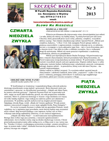 SZCZĘŚĆ BOŻE W Parafii Rzymsko-Katolickiej św. Szczepana w Brynicy tel.: 077/4 2 7 0 6 3 3 Nr 3 2013 email: [email protected] SŁOWO NA NIEDZIELĘ =========================================================================================================================================================================== CZWARTA NIEDZIELA ZWYKŁA DOJRZAŁA MIŁOŚĆ „Żaden prorok nie jest mile widziany w swojej ojczyźnie”. (Łk 4,24) Właściwym klimatem dla dojrzewania wiary chrześcijańskiej jest miłość i to taka, której nie mierzy się ludzką miarą. Tą miarą bowiem jest sam Jezus Chrystus, który przeszedł przez życie cichy, pokorny, cierpliwy, wszystkim dobrze czyniąc. Tak właśnie charakteryzuje miłość Apostoł Paweł: „Miłość jest cierpliwa, łaskawa...” (1Kor 13,4). Gdy następnie Paweł opisuje miłość za pomocą czasowników z zaprzeczeniem, wyraźnie wskazuje na to, co miłością nie jest, a występuje w życiu adresatów jego listu – tak w życiu Koryntian, jak i w naszym życiu. I nie idzie tu tylko o robienie wyrzutów, lecz o wskazanie drogi do nawrócenia. Miłość nie może przecież współistnieć z zazdrością, wyniosłością, złością czy pożądaniem. Miłość jest największym darem Ducha Świętego. Od porównania tego daru z innymi charyzmatami, których posiadanie było dumą Koryntian, św. Paweł rozpoczyna swoją katechezę na temat miłości. W porównaniu z miłością wartość wszystkich innych cnót jest ograniczona. Dopiero miłość łączy w sobie tradycyjne wartości kultury hellenistycznej: szlachetność, prawość, roztropność, odwagę; dopiero miłość – ta prawdziwa, której wzór dał nam Chrystus – ma wartość nieprzemijającą. Zdobyć miłość to zdobyć świętość. To wyróżnia miłość spośród innych charyzmatów i zdolności ludzkich, które tylko „częściowo” i tylko o ile idą w parze z miłością, pomagają człowiekowi w realizacji jego najgłębszego powołania, jakim jest wieczne szczęście w Bogu. =============================================================================================================================================================================== ODEJDŹ ODE MNIE PANIE! „Zostawili wszystko i poszli za Nim”. (Łk 5,11) W konfrontacji ze świętością i wspaniałością Boga człowiek pokorny dostrzega nieuchronnie swoją małość i grzeszność. Boża obecność może nas onieśmielać i sprawiać, że chcielibyśmy powiedzieć: „Odejdź ode Mnie Panie, bo jestem człowiek grzeszny”. Zapewne Szymon Piotr nie wypowiada tych słów, mając na myśli jakiś konkretny grzech, nie robi pospiesznie rachunku sumienia. Mówi to, ponieważ dostrzega w Jezusie i Jego działaniu coś więcej niż tylko ludzką mądrość. Jego reakcją na cudowny połów jest zdumienie i przerażenie. W podobny sposób zachowywał się niegdyś prorok Izajasz. Oglądając chwałę Boga, wołał: „Biada mi! Jestem zgubiony! Wszak jestem mężem o nieczystych wargach, a oczy moje oglądały Króla, Pana Zastępów”. Po swym wyznaniu Szymon z rybaka stał się apostołem Piotrem. Jeżeli wgłębimy się w tajemnicę jego powołania, może łatwiej będzie nam zrozumieć nasze własne. Bóg bowiem każdego z nas zaprasza, byśmy szli za Nim i wskazuje nam drogę najbardziej właściwą, co nie oznacza najprostszą. „Odejdź ode Mnie Panie” – to doświadczenie niewspółmierności Bożego daru wobec tego jacy jesteśmy, z naszymi ograniczeniami i słabościami. Jest to bardzo ważny etap na drodze duchowego wzrostu. Chroni przed pokusą przypisywania sobie zasług za to, co Bóg czyni w nas i przez nas. Św. Tereska z Lisieux z rozbrajającą szczerością wyznaje: „jestem szczęśliwa z tego, że jestem mała i słaba”, dochodzi bowiem do przekonania, że bez Bożej pomocy niczego nie osiągnie. PIĄTA NIEDZIELA ZWYKŁA INTENCJE MSZALNE – PORZĄDEK NABOŻEŃSTW od 3 do 10 lutego 2013 roku. Niedziela 03.02 CZWARTA NIEDZIELA ZWYKŁA. 7.30 Za †† z róży różańcowej św. Faustyny. 9.15 Grabczok Do Boskiej Opatrzności i MBNP z podziękowaniem za otrzymane łaski, z prośbą o dalsze zdrowie i bł. Boże z ok. 30 rocz. Sakramentu Małżeństwa pp. Barbary i Zbigniewa Szczepara. 10.30 Do MBNP z podziękowaniem za odebrane łaski z ok. 18 rocz. ur. Anety Bagińskiej. Poniedziałek 04.02 7.00 Za †† Joannę Wiench, 2 mężów Wincentego Wiench, Pawła Piątek, syna Franciszka Wiench, z pokrewieństwa Wiench, Proth, Piątek, Świerc. 18.00 Za † Adama w 30 dzień śmierci. (a także †† z rodzin Heisig, Brzana, Tatarczyk) Wtorek 05.02 Św. Agaty, dziewicy i męczennicy. 7.00 W intencji róży różańcowej św. Barbary – przełożona p. Gertruda Polok o zdrowie, opiekę i bł. Boże w rodzinach, oraz †† z tej róży. Środa 06.02 Św. Pawła Miki i Towarzyszy, męczenników. j.n. 7.00 Czwartek 07.02 7.00 W 30 dzień śmierci Pawła Patrzek. 17.00 Za †† Zygfryda Patrzek i dusze w czyśćcu cierpiące. Piątek 08.02 7.00 Za †† brata Józefa w rocz. śm., jego rodziców, 2 braci, rodziców Pawła i Olgę, dziadków i z całego pokrewieństwa. 17.00 Grabczok Do Boskiej Opatrzności Anioła Stróża o zdrowie i opiekę Bożą dla rocznego dziecka Igora Szczepara. Sobota 09.02 18.00 Za †† rodziców Gertrudę i Józefa oraz Erykę i Huberta z pokrewieństwo z obu stron. Niedziela 10.02 PIĄTA NIEDZIELA ZWYKŁA. 7.30 Za †† męża Jerzego Kuka w 5 rocz. śm., rodziców Antoniego i Franciszkę teściów Józefa i Elżbietę Cebula, dziadków z obu stron i dusze w czyśćcu cierpiące. 9.15 Grabczok Za †† Gertrudę Gustaw, dwóch braci, siostrę Marię i zmarłych rodziców. 10.30 Do Opatrzności Bożej i Anioła Stróża z ok. I-szej rocz. ur. Łukasza Glados o zdrowie, opiekę i bł. Boże. ====================================================================== OGŁOSZENIA: Bóg zapłać za sprzątanie świątyni. W tym tygodniu zapr