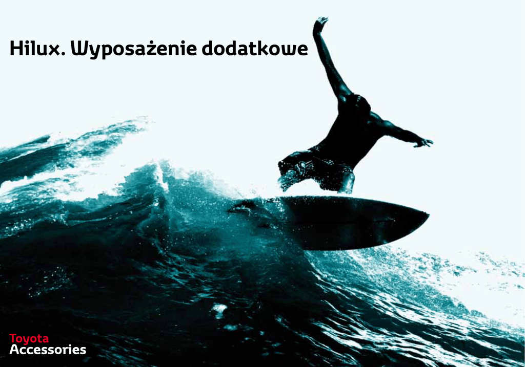 Hilux. Wyposażenie dodatkowe Osobiste wrażenia Hilux został stworzony do pracy, zabawy i eksploracji otwartych przestrzeni. Niezależnie od tego, jaki tryb życia prowadzisz, oryginalne akcesoria Toyoty pozwolą Ci w pełni wykorzystać jego ogromne możliwości. Wyposażenie dodatkowe w prosty sposób pomoże nadać Twojemu Hiluxowi więcej indywidualizmu. 02 Pakiety akcesoriów 06-07 Pakiet Invincible 06 Wygląd zewnętrzny Technologia Wnętrze 08-35 36-43 44-53 Styl Felgi Zabudowy Ochrona Podróż 10 16 18 24 26 Nawigacja Audio Bluetooth® Systemy parkowania 38 40 41 42 Skórzane wnętrze Dywaniki podłogowe Foteliki dziecięce Lista akcesoriów 46 50 52 55 03 Niezwyciężony... Czy potrzeba dodawać coś więcej? Toyota Hilux wielokrotnie udowadniała swoją niesamowitą moc, wytrzymałość i niezawodność. Poznaj pakiet akcesoryjny, dzięki któremu możliwości Twojego auta, a także jego styl i komfort zostaną wyniesione na jeszcze wyższy poziom. Bądź niezwyciężony gdziekolwiek się pojawisz. 04 05 Pakiet Invincible Zestawy akcesoriów dla Toyoty Hilux zostały stworzone z myślą o indywidualności, wygodzie i korzyści. Dzięki specjalnie wyselekcjonowanym elementom wyposażenia dodatkowego z łatwością sprawisz, że Twoja Toyota Hilux stanie się jeszcze bardziej stylowa lub praktyczna. Pakiet Invincible pozwoli Ci podkreślić dwoisty charakter auta eleganckiego, lecz stworzonego do ciężkiej pracy. Wszystkie akcesoria zostały wykonane z najwyższą starannością i zapewniają perfekcyjną integrację z autem. 06 Osłona zderzaka Nakładki na progi przednie Nawigacja Toyota Touch&Go Skórzana dźwignia hamulca Hak holowniczy Podłokietnik Elementy dodatkowe w zestawie (za dopłatą): Roleta skrzyni Orurowanie skrzyni Tapicerka skórzana 07 08 Według Twojego pomysłu Toyota Hilux ma ogromny potencjał. Dzięki oryginalnym akcesoriom Toyoty łatwo wzbogacisz swoje auto o niepowtarzalny charakter. Bądź kreatywny i wybieraj spośród gamy akcesoriów stylistycznych, dodaj nowy wymiar praktyczności dla przestrzeni ładunkowej, odkrywaj nowe możliwości korzystając z funkcjonalnych mocowań dachowych. Dzięki akcesoriom Toyoty łatwo stworzysz auto odzwierciedlające tryb życia, który prowadzisz. 09 Styl Stwórz Hiluxa wedle własnego pomysłu. Każde z oryginalnych akcesoriów stylistycznych Toyoty zapewnia perfekcyjną integrację oraz tworzy spójny wygląd podkreślający surowy charakter Twojego auta. Chromowane obudowy przednich reflektorów Chromowane wykończenia przednich lamp podkreślają charakterystyczną linię potężnego grilla Toyoty Hilux. 10 Chromowana obudowa światła stop Wyróżniający się chromowany akcent dla trzeciego światła stop. Chromowane obudowy lamp przeciwmgielnych Wzbogacają stylistykę przedniego zderzaka Toyoty Hilux. Chromowana obudowa tylnych lamp Chromowane akcenty zapewniają nowoczesny wygląd i niepowtarzalną stylistykę. 11 Przedni grill Stylowe wykończenie chromem podkreśla masywną sylwetkę Toyoty Hilux. 12 Chromowana obudowa tylnej klamki Dopełniający całości chromowany akcent dla tylnej części nadwozia. Chromowana obudowa wlotu powietrza Podkreśla charakterystyczną linię maski Toyoty Hilux. Chromowane obudowy klamek Akcent stylistyczny podkreślający luksusową naturę Hiluxa. 13 Osłona przedniego zderzaka Zapewnia styl i ochronę karoserii podczas jazdy w wymagającym terenie. Osłona wykonana została z elastycznego poliuretanu, by zapewnić bezpieczeństwo podczas zderzenia z pieszym. 14 Orurowanie boczne ze stopniami Chromowane wykończenie orurowania połączone z gumowymi antypoślizgowymi stopniami zapewni Twojemu Hiluxowi styl i praktyczność. Osłona pod przedni zderzak Stylowa srebrna osłona pozwala uniknąć odprysków i zarysowań lakieru. Aluminiowe stopnie boczne Wykonane z aluminium antypoślizgowe stopnie boczne zapewniają łatwy dostęp do kabiny Toyoty Hilux. Orurowanie skrzyni ładunkowej Chromowane, potężne rury podkreślają surowy wygląd Toyoty Hilux. Orurowanie boczne Doskonały styl i ochrona nadwozia podczas jazdy w trudnych warunkach. 15 Indywidualizm Oryginalne felgi aluminiowe Toyoty to jakość, styl i indywidualizm. Niezależnie od wzoru, który wybierzesz, możesz mieć pewność, że koła w Twoim aucie zostały wykonane z najwyższą precyzją, która gwarantuje wytrzymałość i bezpieczeństwo podczas jazdy. Arizona 15” Rica 17” 16 Ozark 15” Nakrętki antykradzieżowe Zaokrąglony profil i klucz z unikalnym kodem chronią felgi przed kradzieżą. Blokada koła zapasowego Wykonana ze wzmocnionej stali posiada unikalny kod zabezpieczający koło zapasowe przed kradzieżą. 17 Wszechstronność Całkowita zabudowa skrzyni ładunkowej zapewnia doskonały wygląd i najlepszą ochronę dla przewożonego bagażu. Uszczelniony system montażowy chroni Twój ładunek przed warunkami atmosferycznymi i pozwala w prosty sposób zdemontować zabudowę, gdy potrzebujesz więcej przestrzeni. 18 Zabudowa z bocznymi szybami Trwała konstrukcja przestrzeni bagażowej w kolorze nadwozia z unoszoną tylną szybą. Pokryte tkaniną wnętrze jest wyposażone w dodatkowe oświetlenie. Zabudowa w wersji dostawczej Dostępna jedynie w kolorze białym. Idealnie nadaje się do przewożenia ładunku, który mógłby zniszczyć inne rodzaje zabudowy. Zabudowa z bocznymi drzwiczkami Boczne drzwi i tylna szyba ułatwiają dostęp do przestrzeni ładunkowej. Pokryte tkaniną wnętrze jest wyposażone w dodatkowe oświetlenie. 19 Wytrzymałość Legendarna już wytrzymałość Toyoty Hilux sprawia, że Twoje auto to doskonałe narzędzie do pracy. Oryginalne akcesoria przeznaczone dla skrzyni ładunkowej wzbogacą Twoją Toyotę Hilux o nowy wymiar funkcjonalności. Przedłużenie przestrzeni bagażowej Umożliwia bezpieczny transport przedmiotów wielkogabarytowych, a w razie przewożenia mniejszych ładunków może służyć jako przegroda. 20 Wykładzina aluminiowa przestrzeni